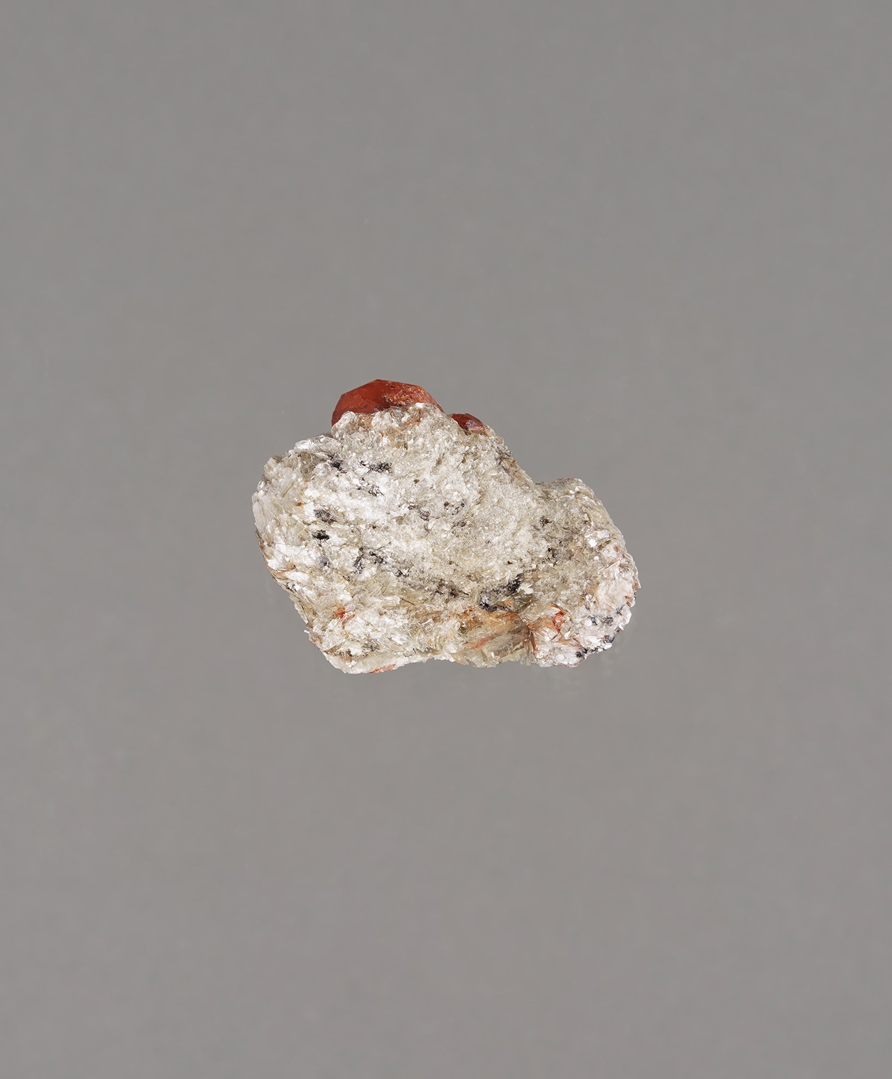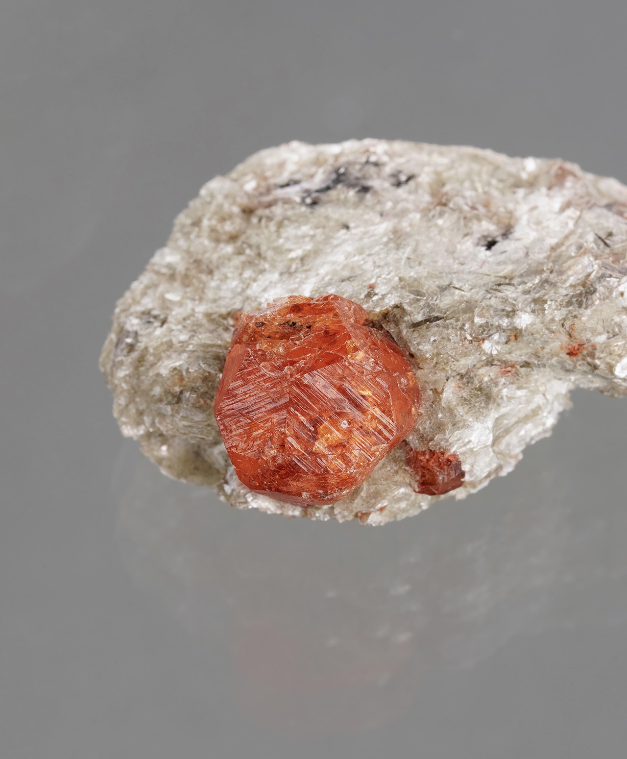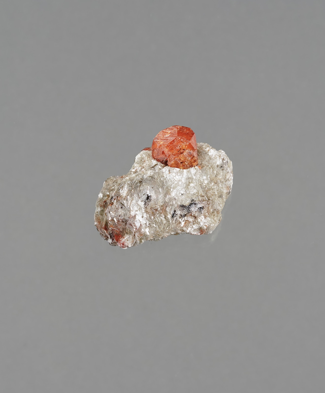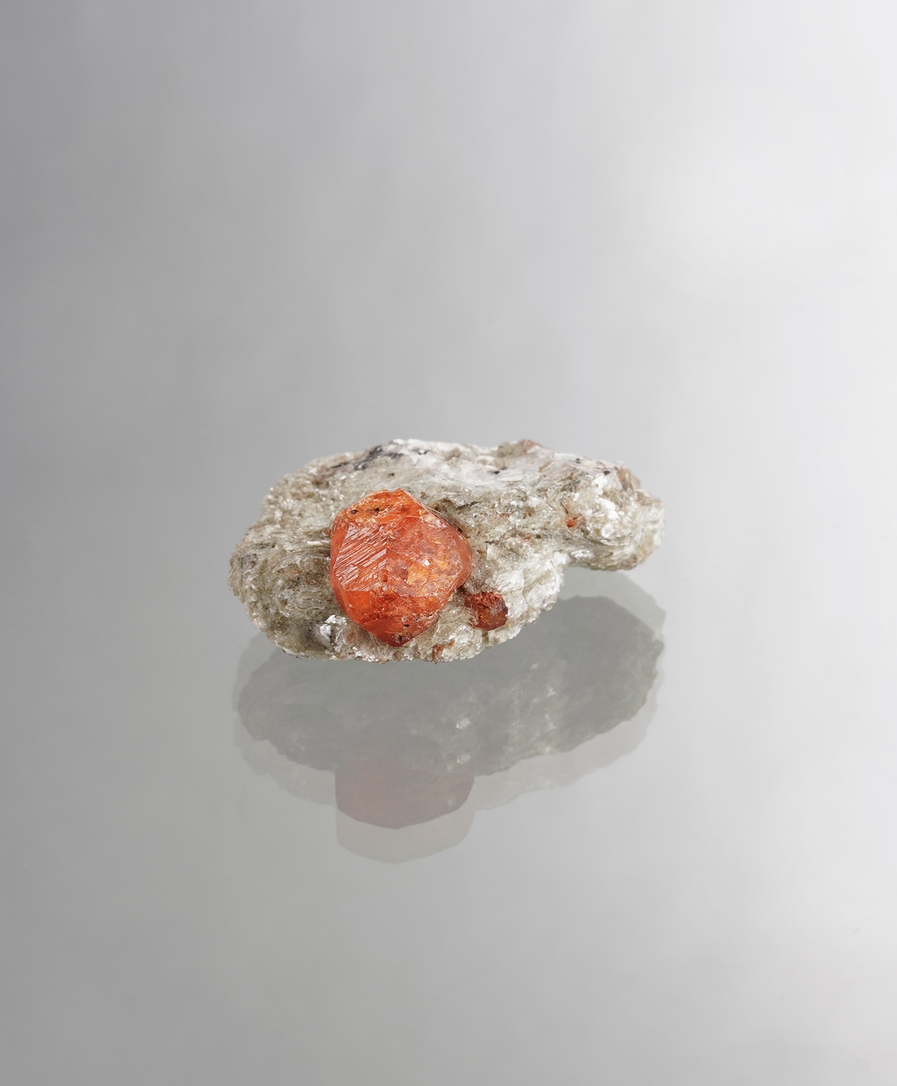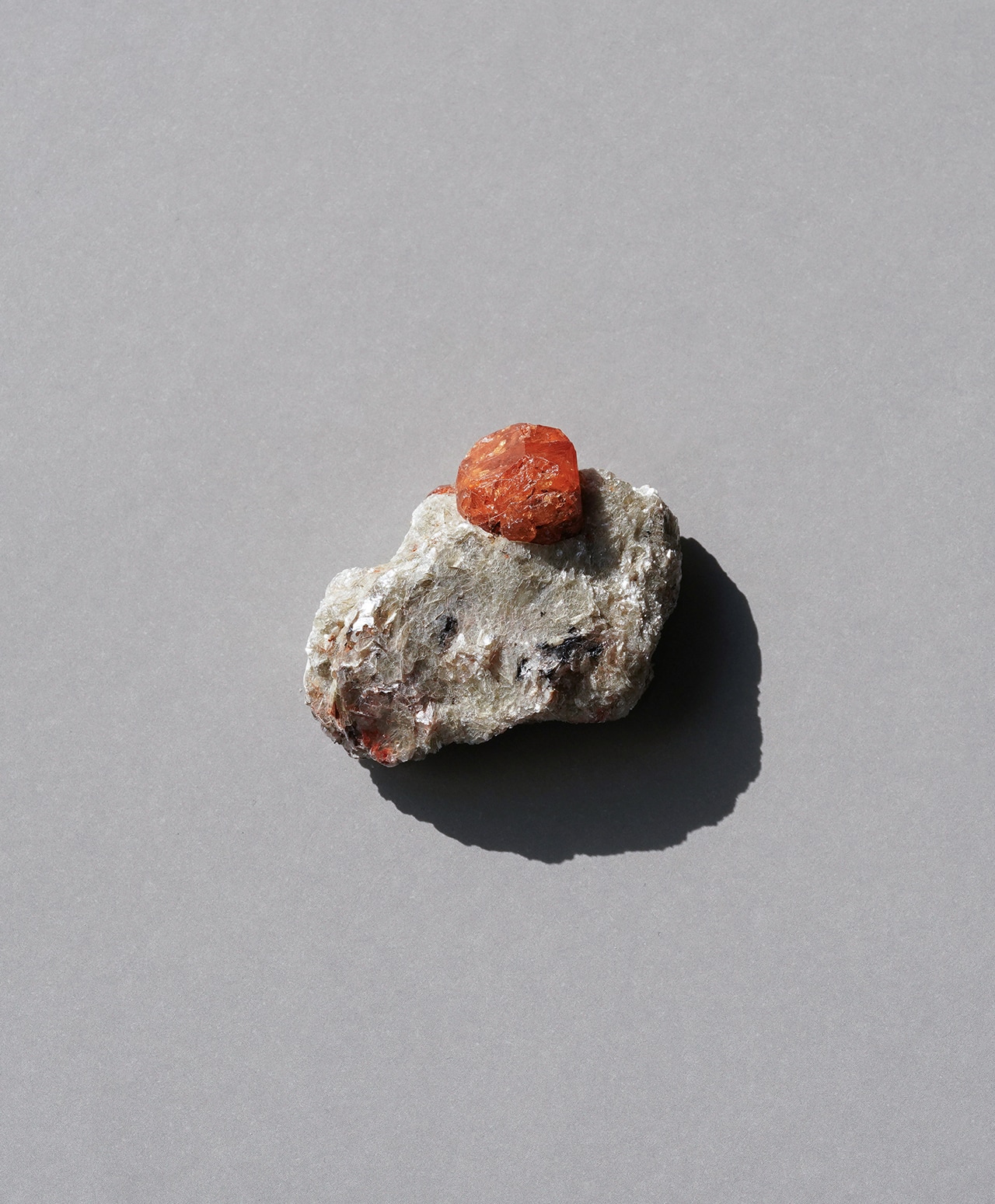 キラキラと輝く白雲母の結晶が作り出す独特のフォルムに、杏の実のようなスペサルタイトガーネットがちょこんと鎮座しています。白い母岩の繊細な輝きと、ガーネットの濃密な色彩が響き合う、自然のユーモアと美しさが同居した、愛らしくも神秘的な逸品です。