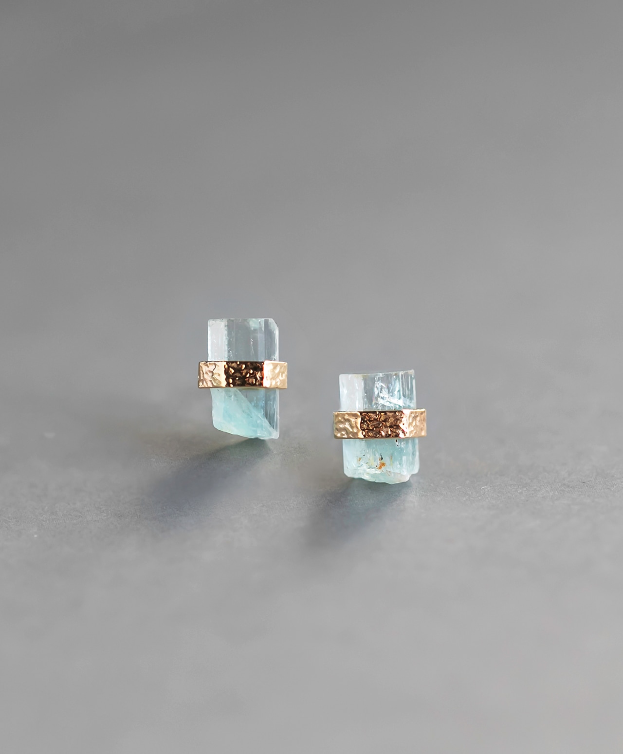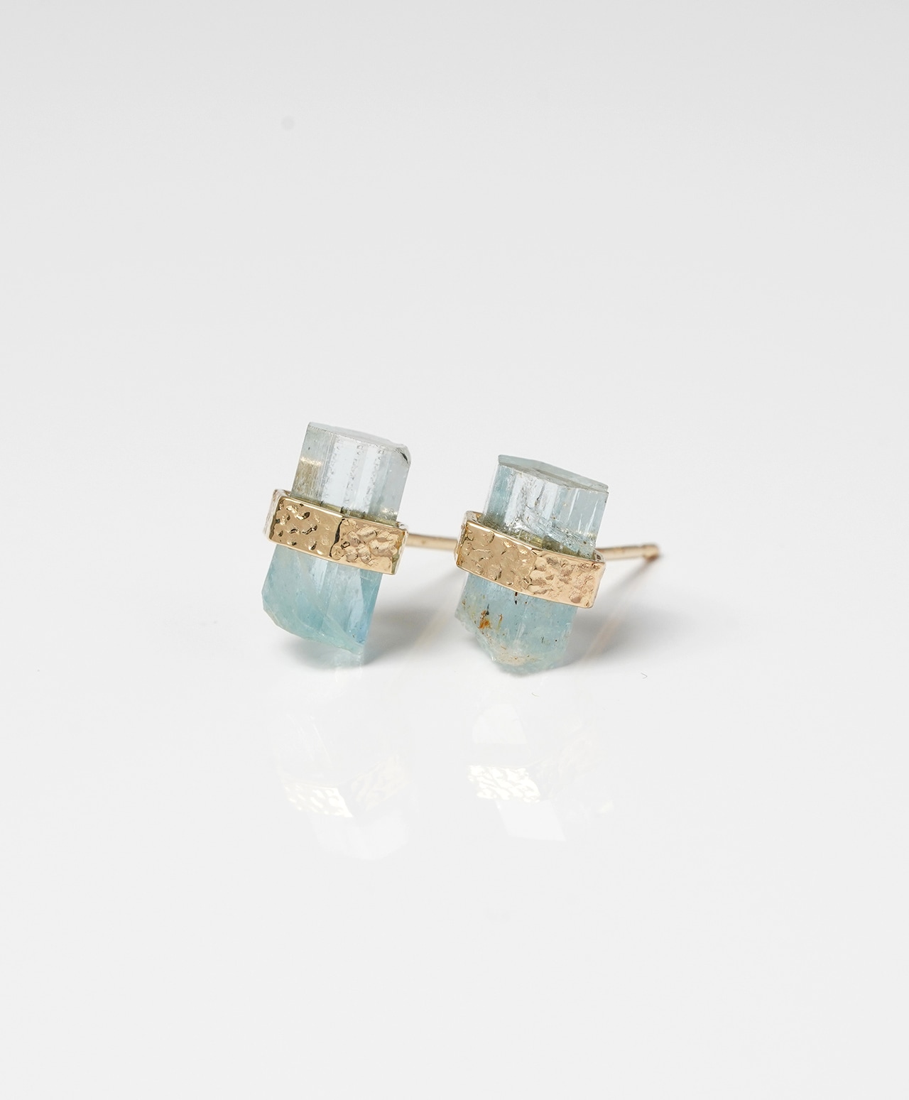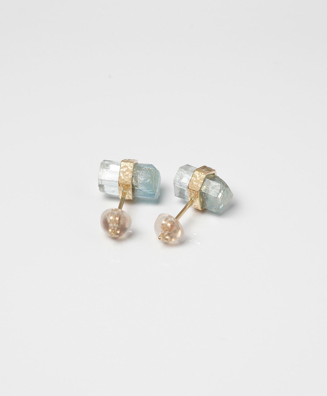 じんわりと滲むようなアイスブルーが美しいアクアマリン。六角柱の原石が織りなす自然の造形美をそのままに、ゴールドのバンドで巻いてピアスに仕立てました。