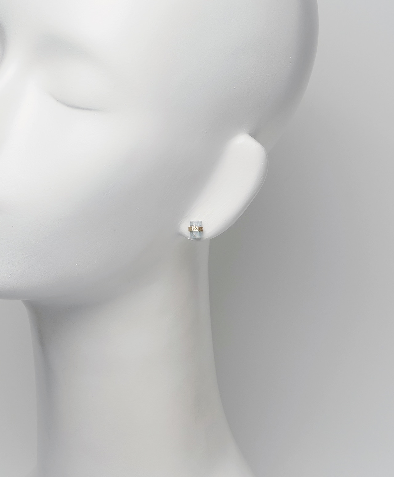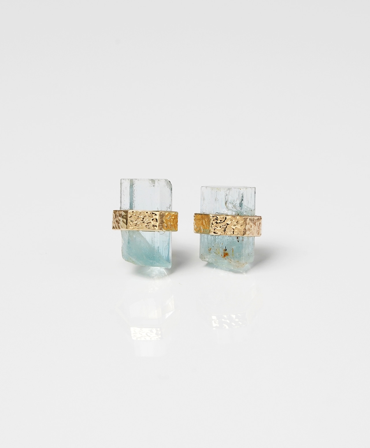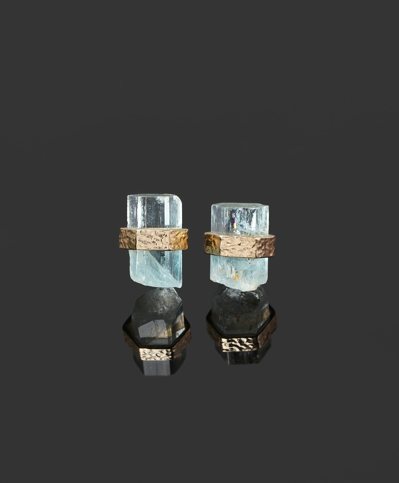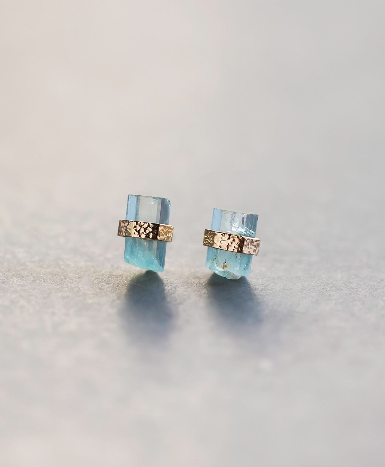 じんわりと滲むようなアイスブルーが美しいアクアマリン。六角柱の原石が織りなす自然の造形美をそのままに、ゴールドのバンドで巻いてピアスに仕立てました。