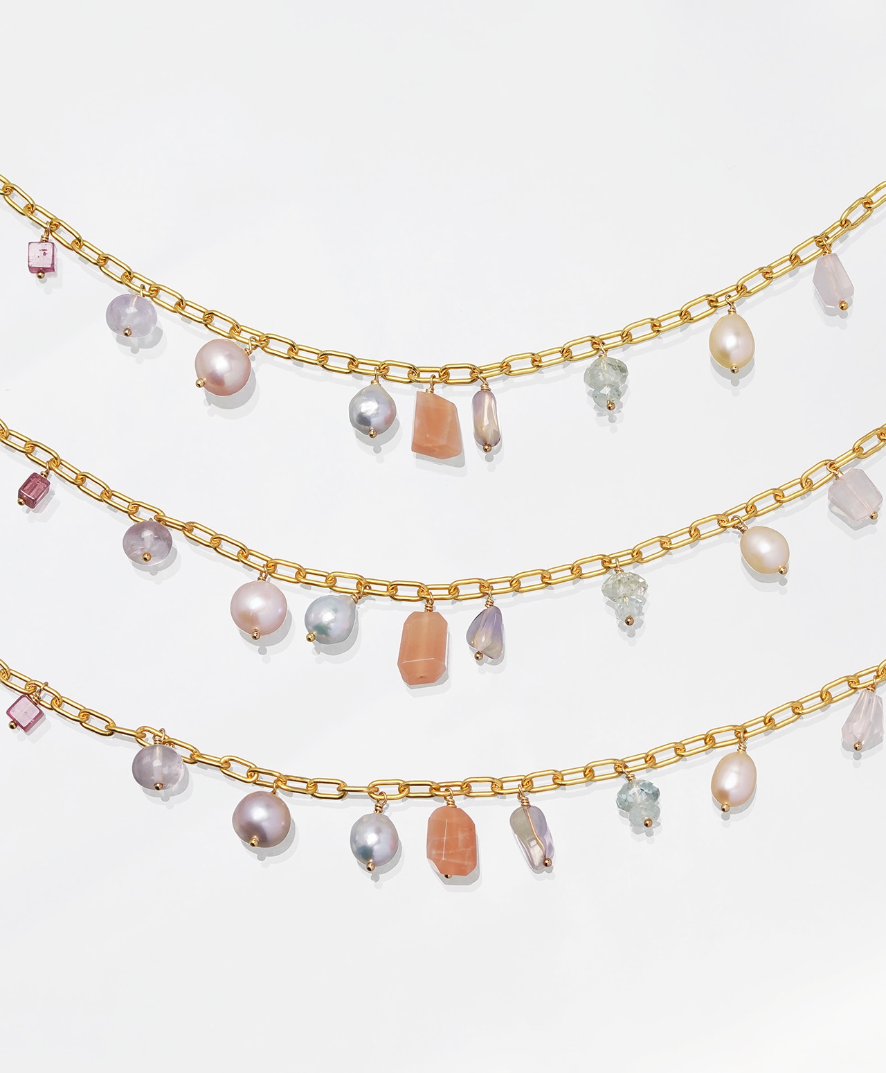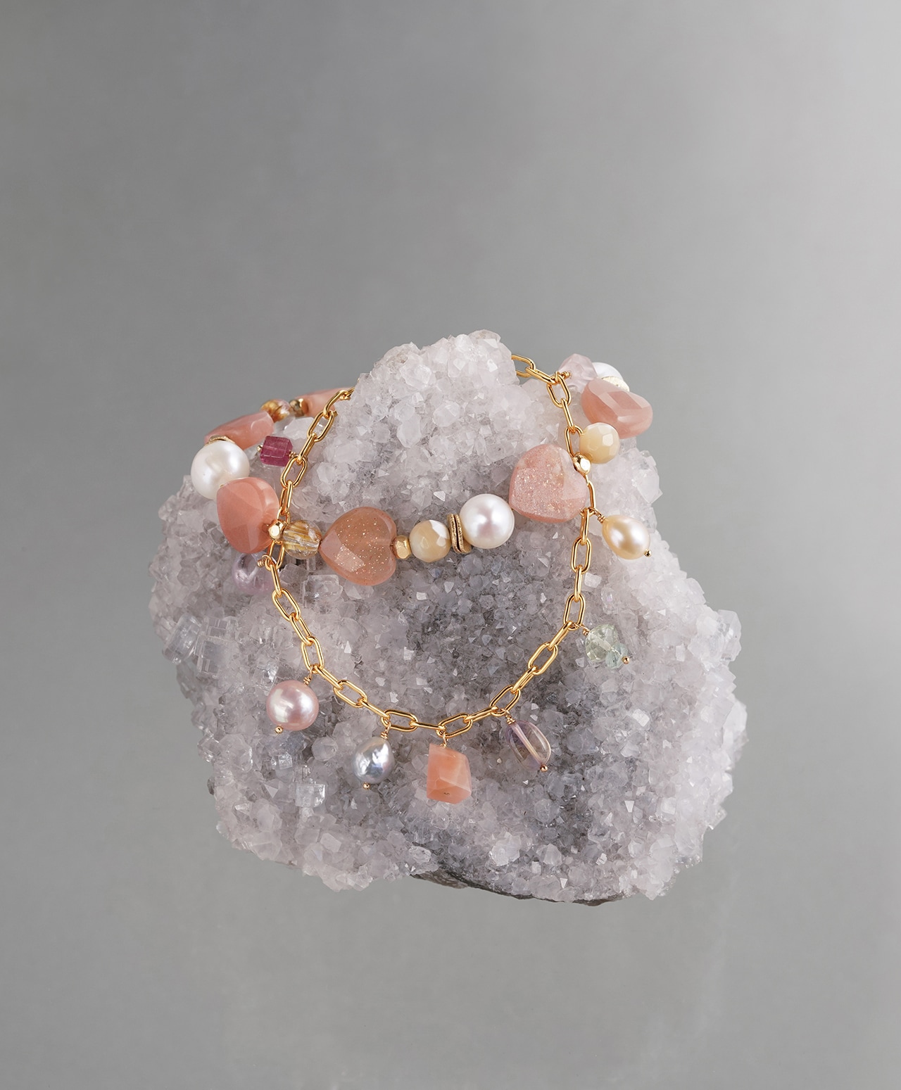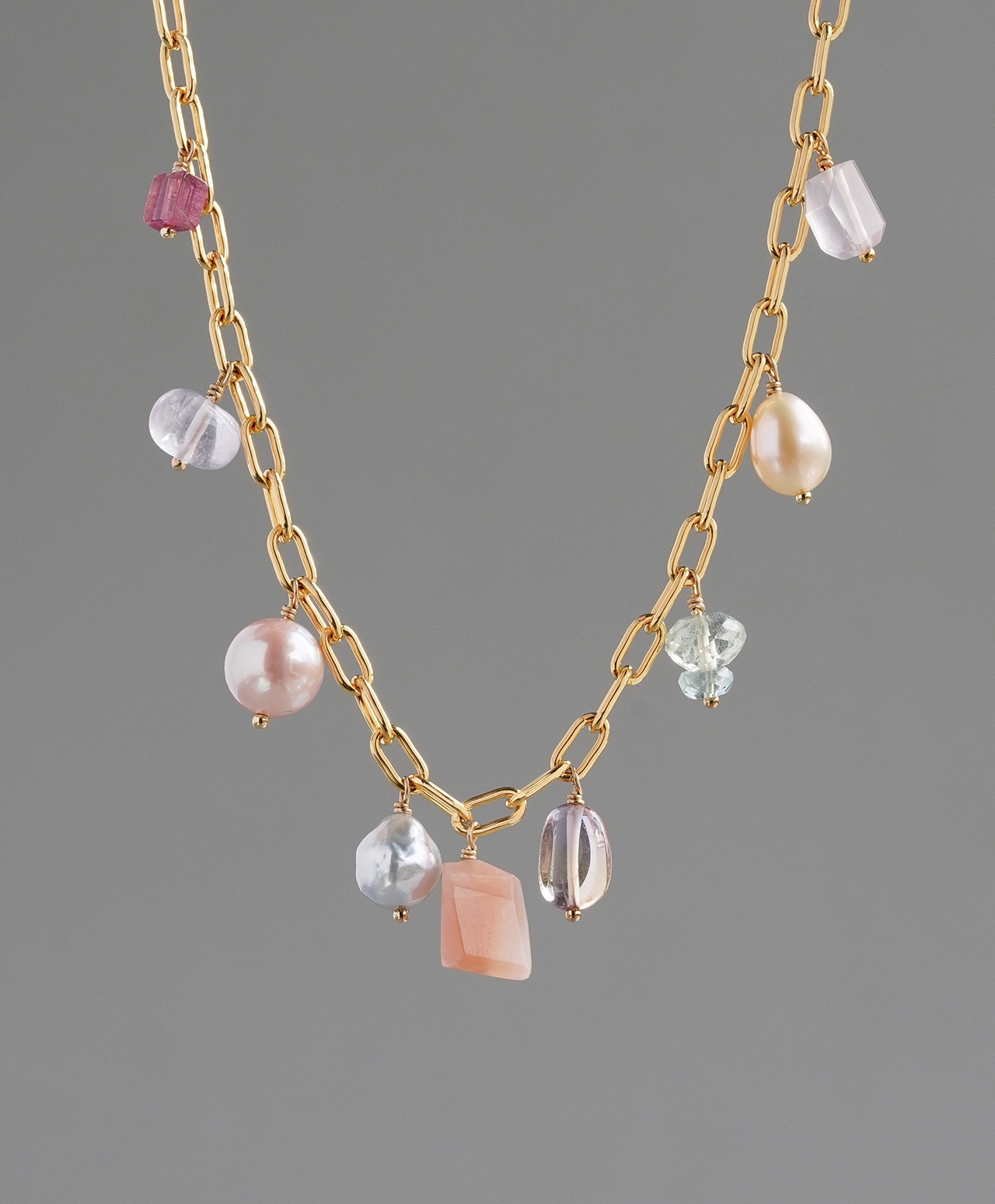 繊細なゴールドチェーンに踊るのは、やわらかなピンクオレンジムーンストーン(インド産)を中心に、アクアマリン、ローズクォーツ、アメシスト、アメトリン、ピンクトルマリンなど、多彩で透明感のある天然石たち。