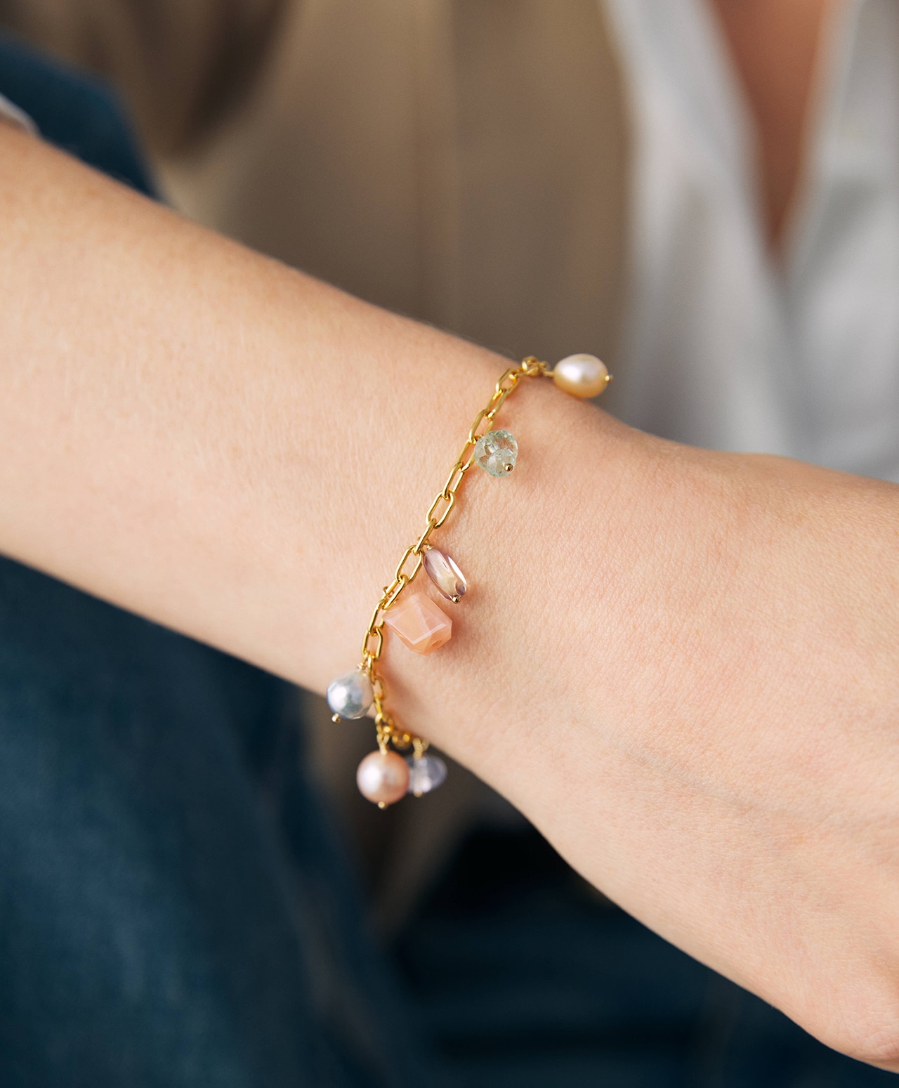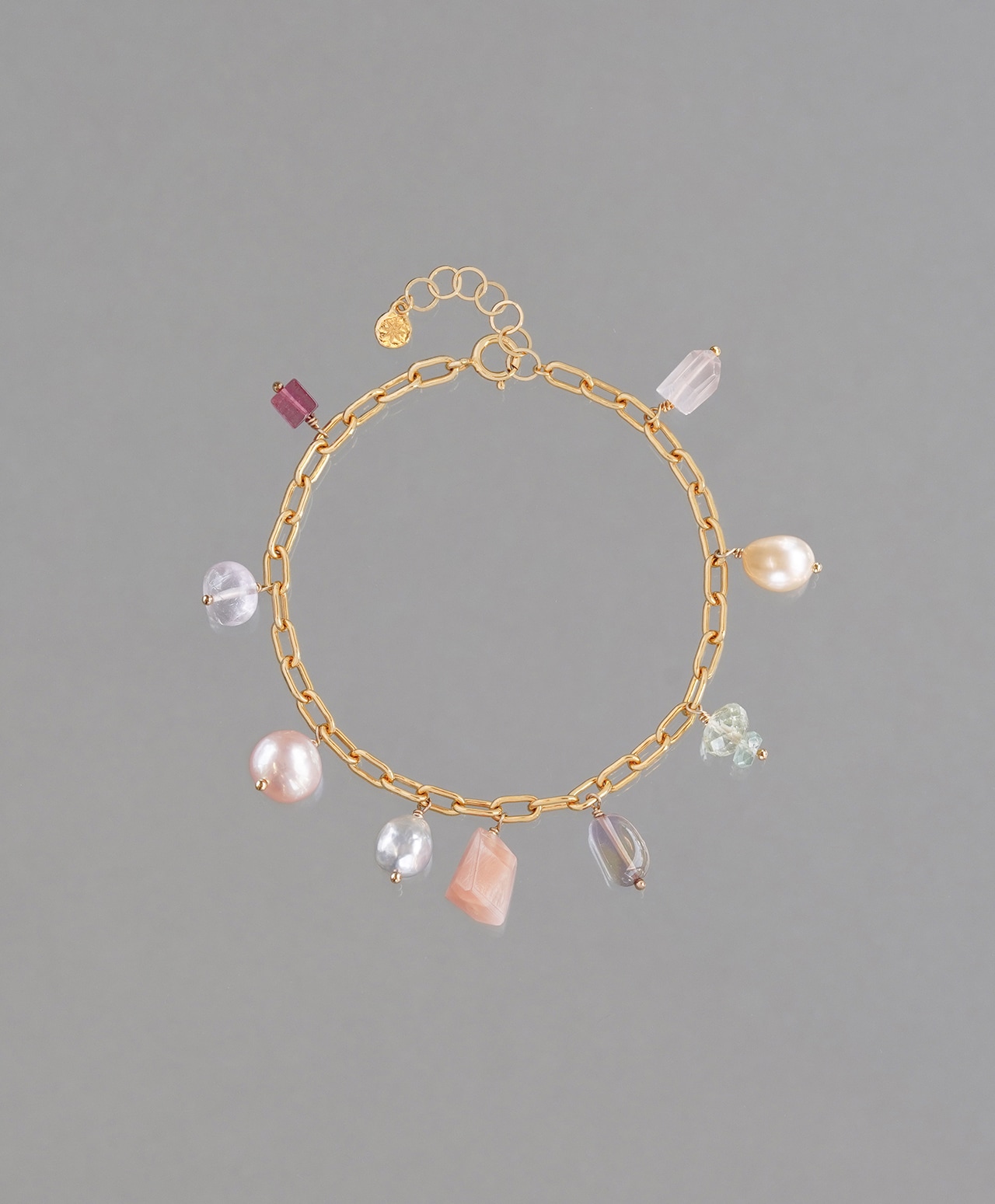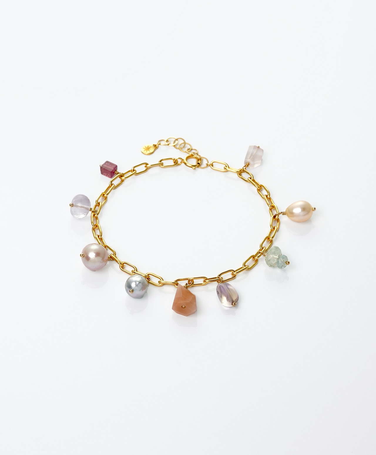 繊細なゴールドチェーンに踊るのは、やわらかなピンクオレンジムーンストーン(インド産)を中心に、アクアマリン、ローズクォーツ、アメシスト、アメトリン、ピンクトルマリンなど、多彩で透明感のある天然石たち。