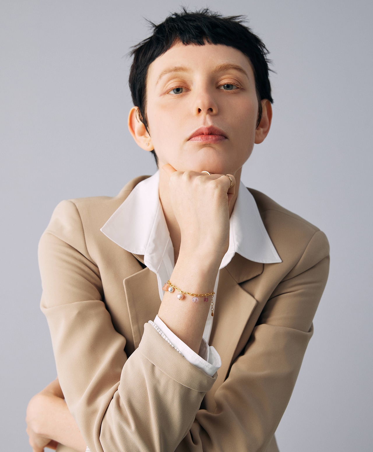 淡水パールたちはひと粒ごとに異なる表情を見せ、青みを帯びたピンクは可憐に、クリーム色は柔らかく、肌の上に静かな温もりを添えます。