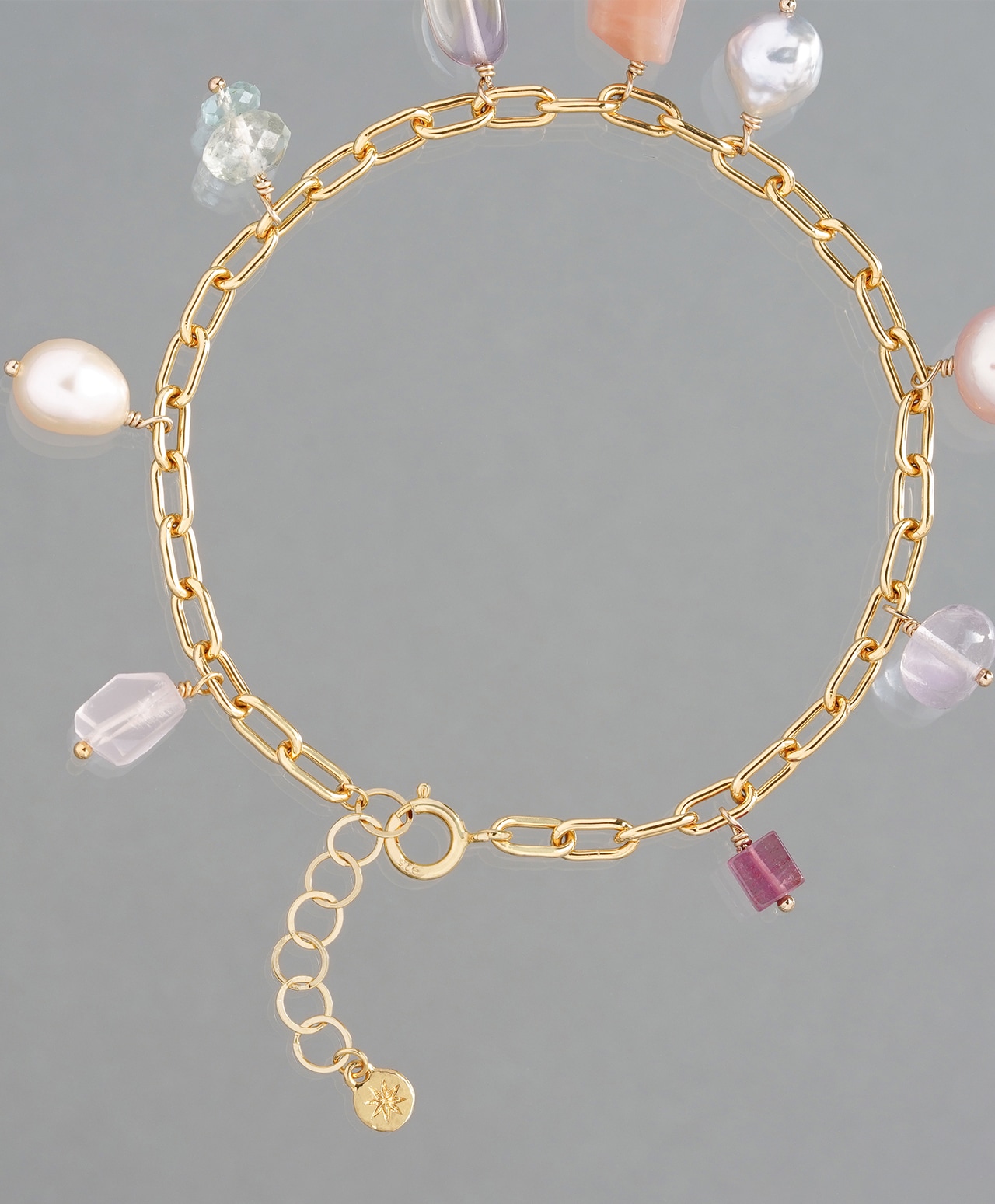 チェーンの細やかな揺れに合わせて、それぞれの石が光を返し、手元にやわらかなリズムを生み出します。