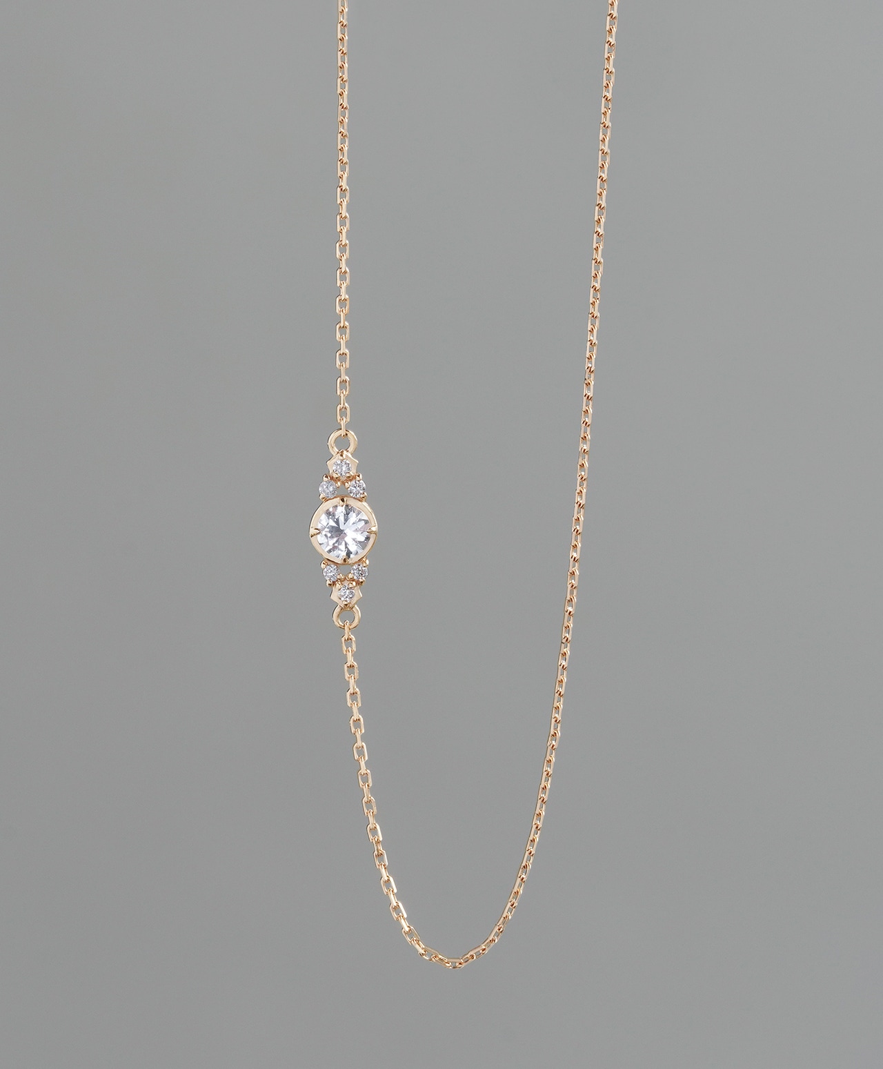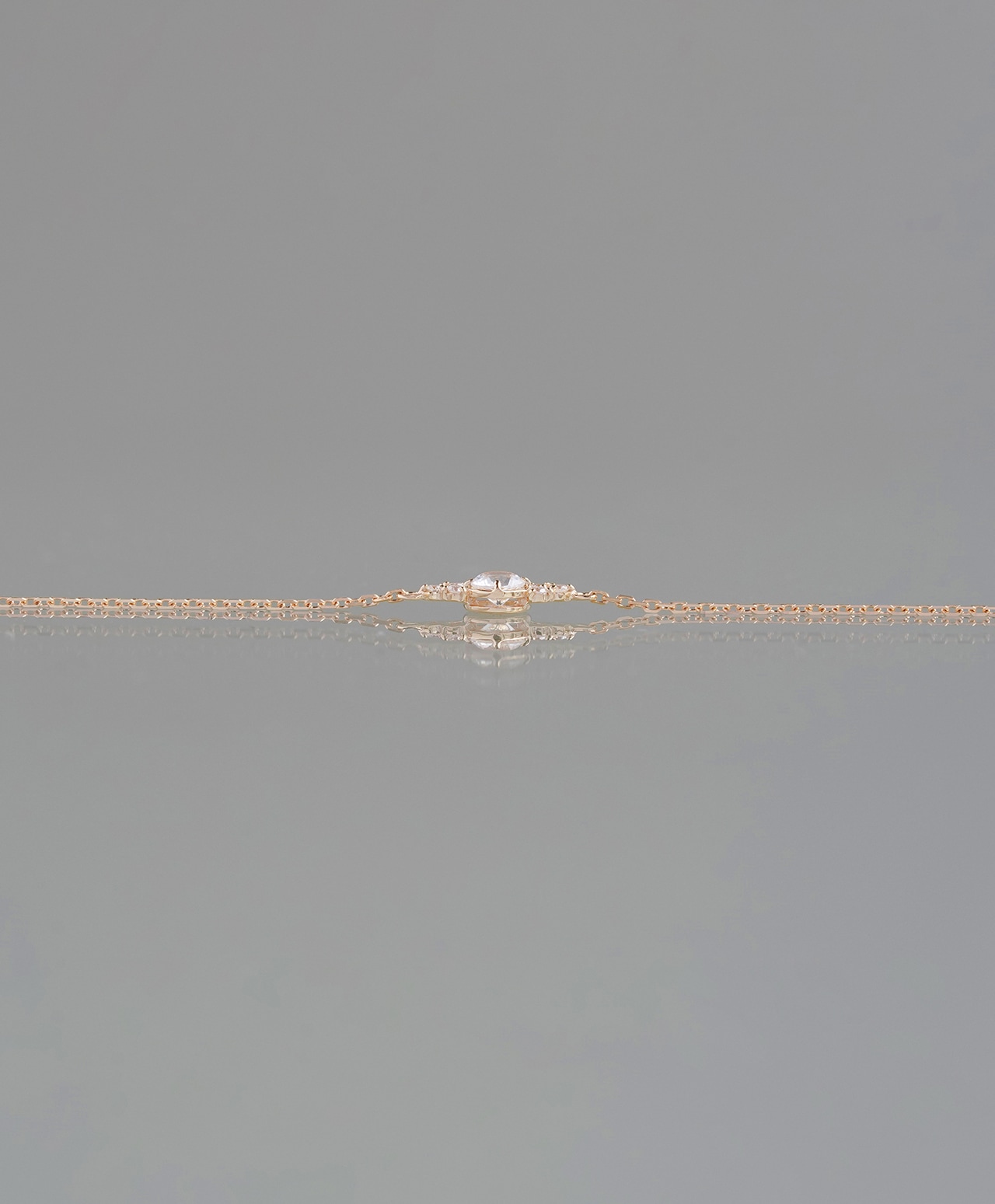 中央に配されたロシア産フェナカイトは、無色透明の高い純度を湛え、高い屈折率によって白い光を内側から放ちます。ダイヤモンドのように外へ弾ける煌めきとは異なり、光そのものが結晶化したかのような、静かで奥行きのある輝きが特徴です。