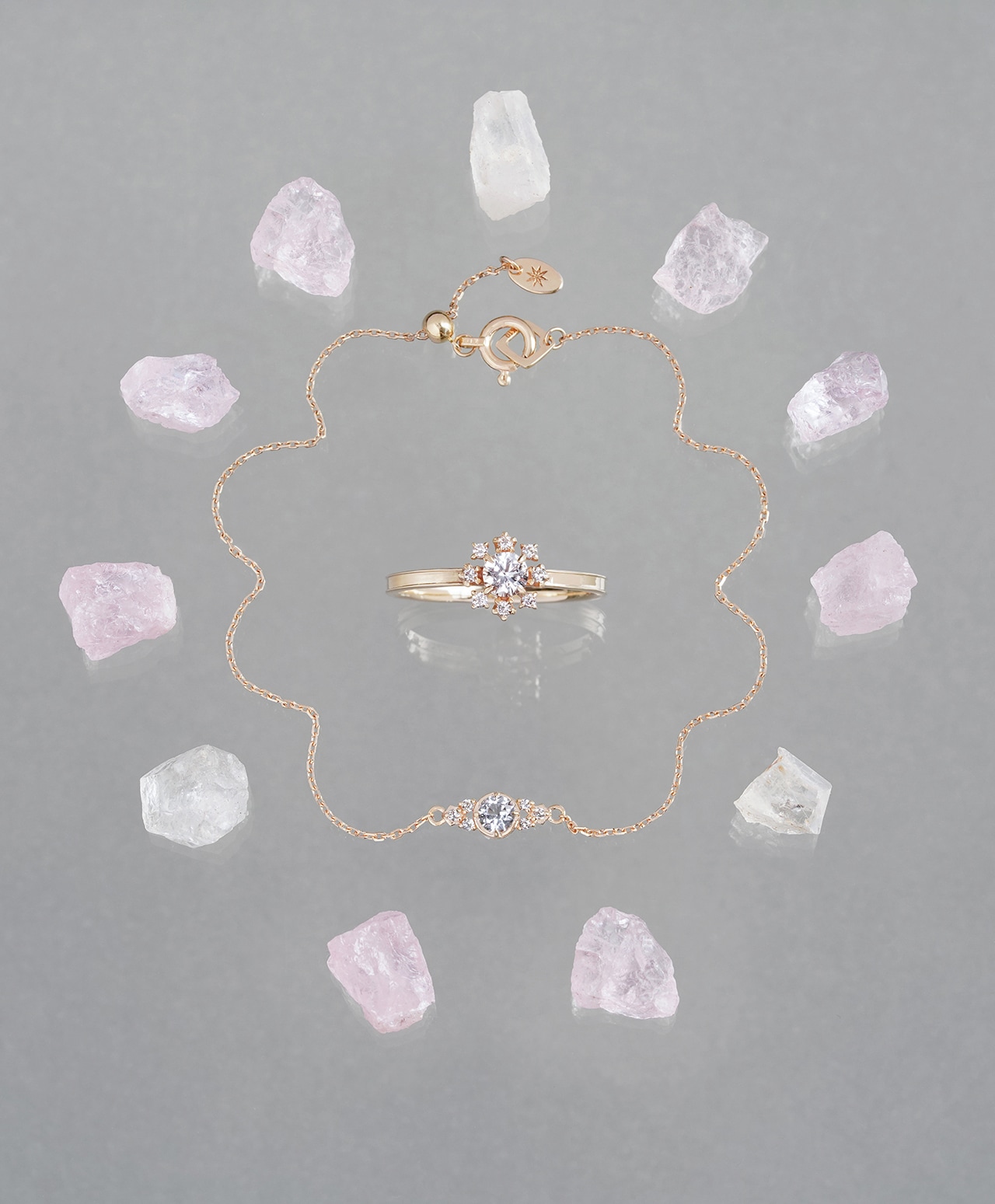そのフェナカイトを起点に連なる繊細なダイヤモンドは、白い光が波紋となり、輪となって広がっていく情景を描き出します。光は脈打つことなく、後光〈Halo〉として身に着ける人の周囲をやさしく包み込みます。