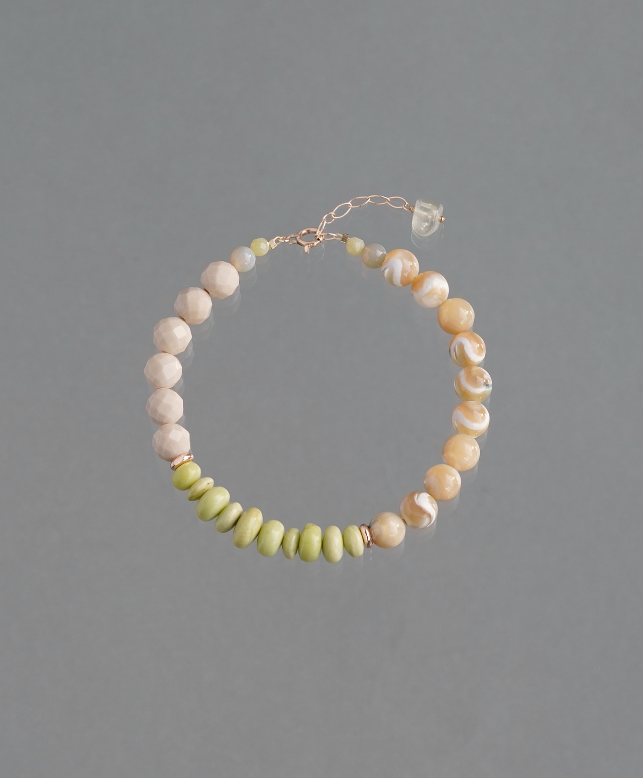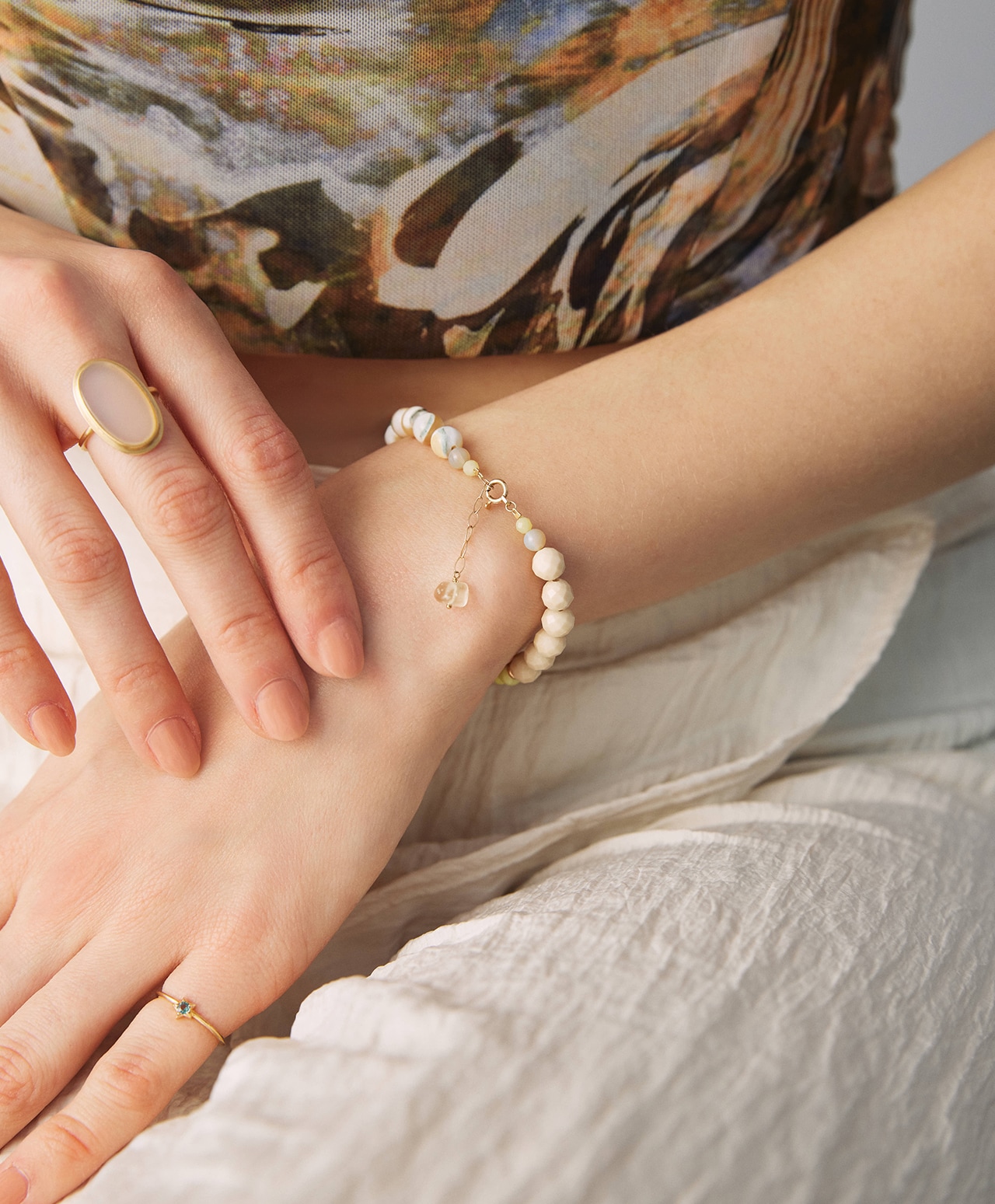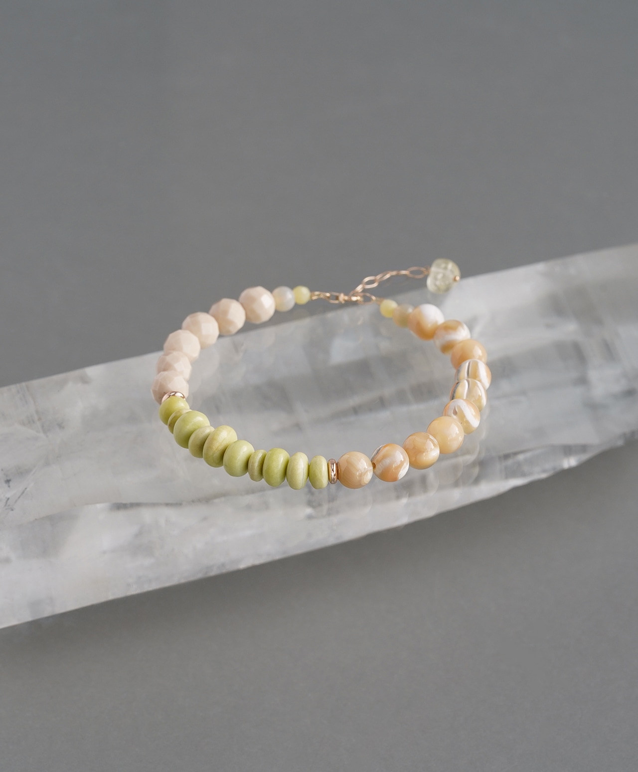その特別な石を中心に、夜光貝や隕石由来のリビアングラスを配し、淡いイエローとベージュが静かに溶け合う、ナチュラルで穏やかな気配を纏ったブレスレットです。