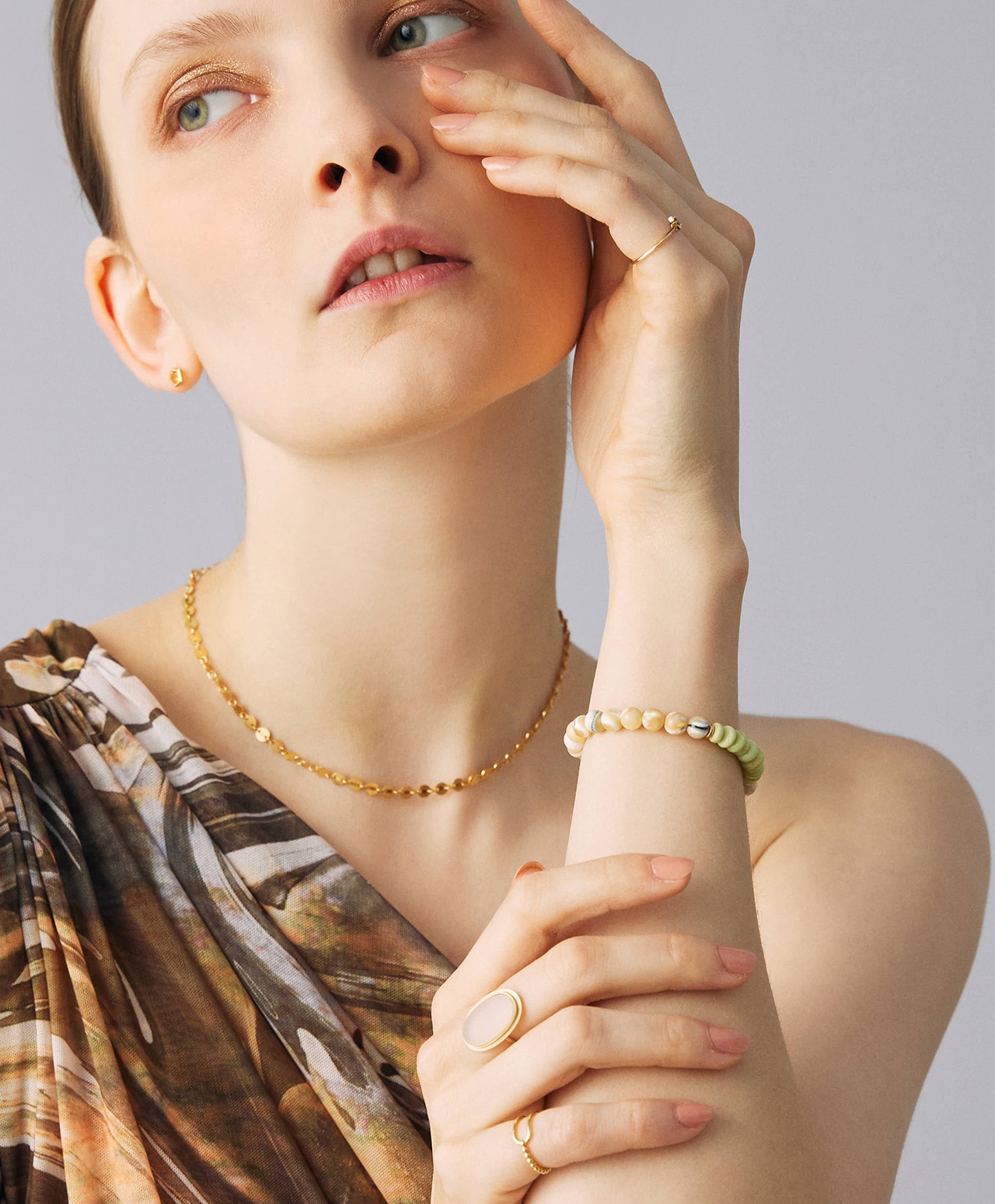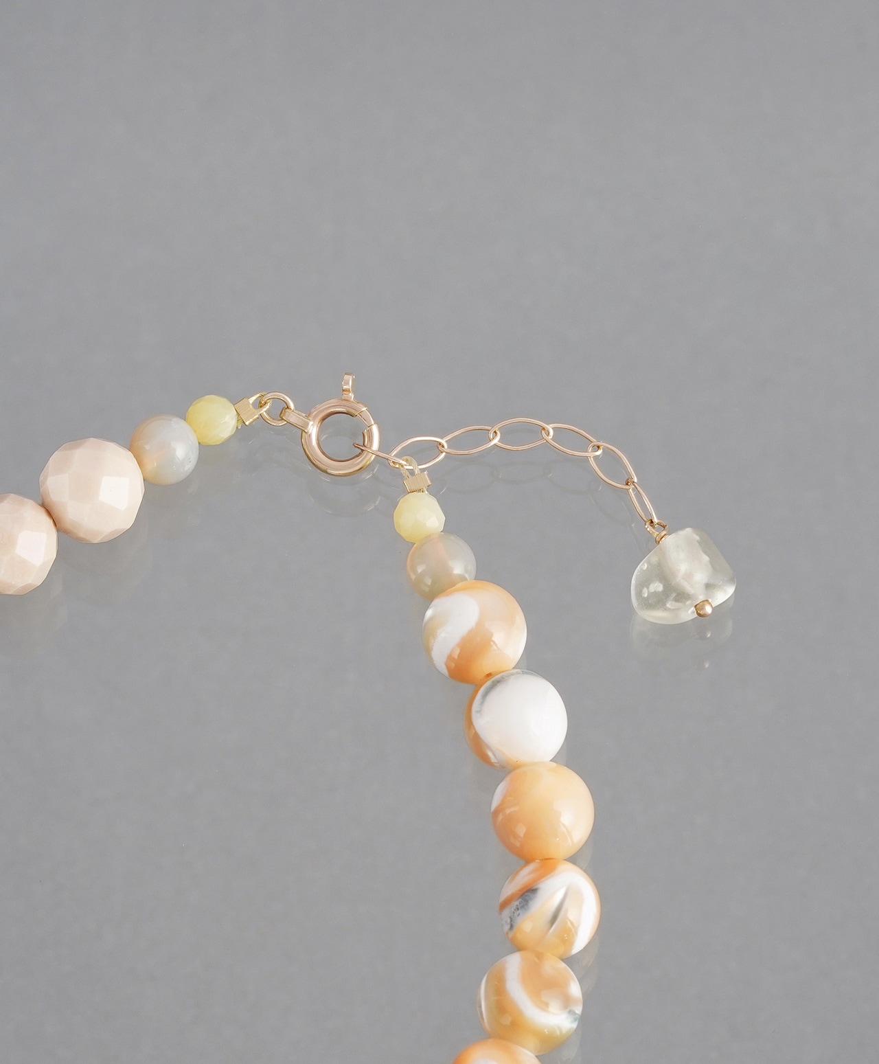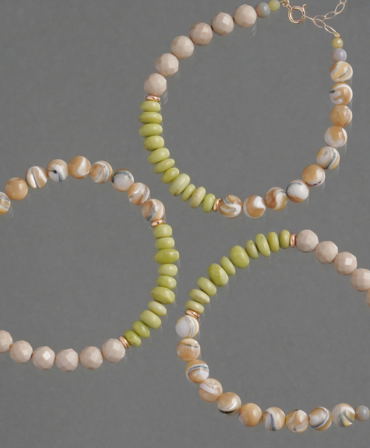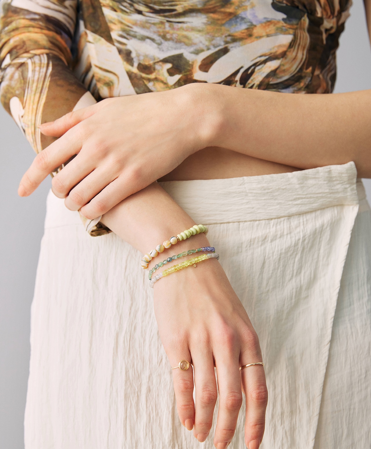 その特別な石を中心に、夜光貝や隕石由来のリビアングラスを配し、淡いイエローとベージュが静かに溶け合う、ナチュラルで穏やかな気配を纏ったブレスレットです。