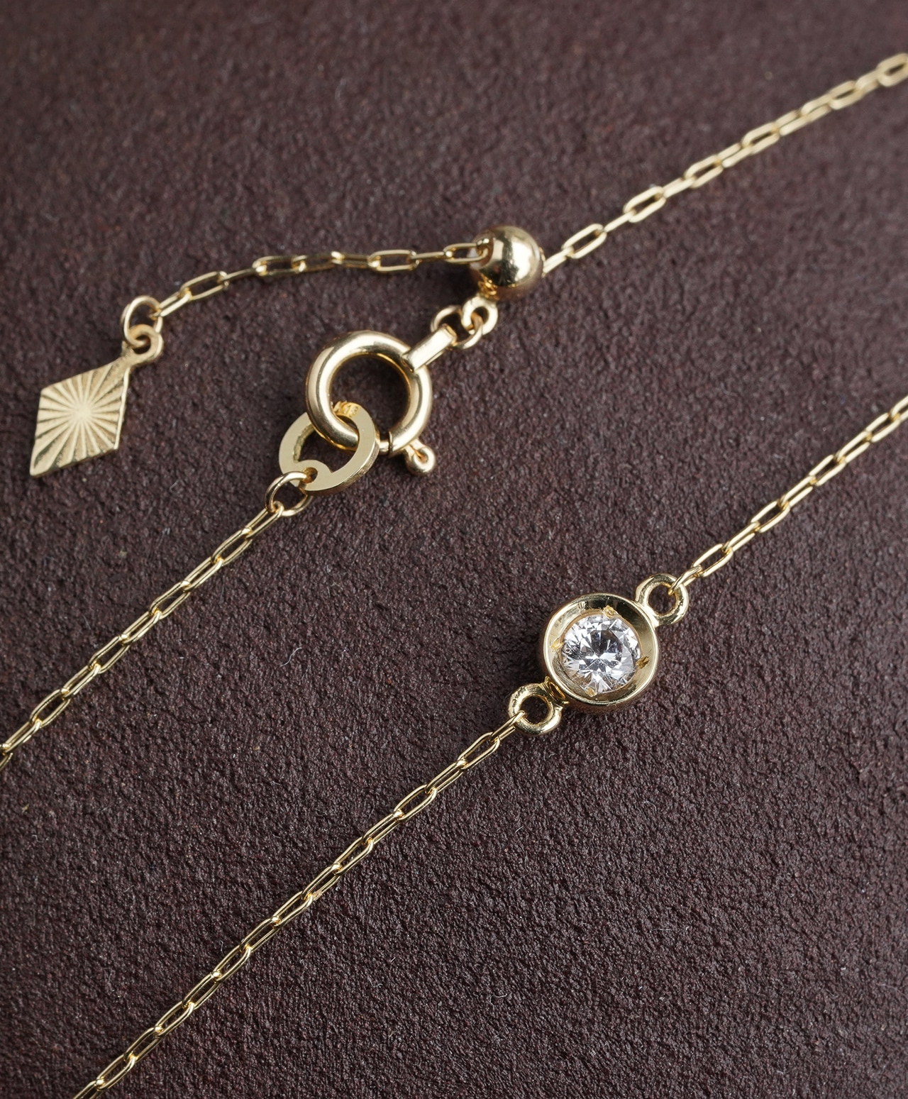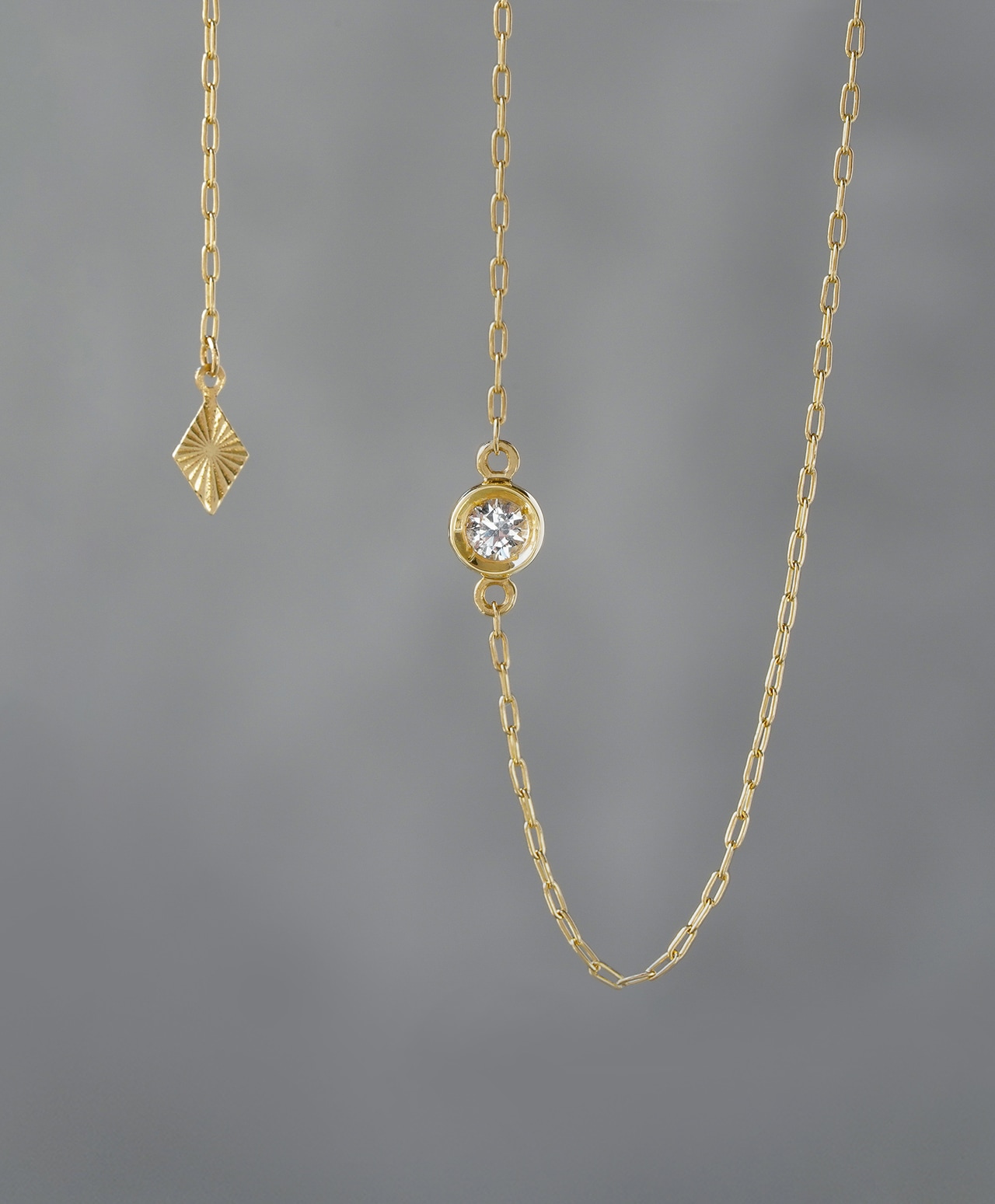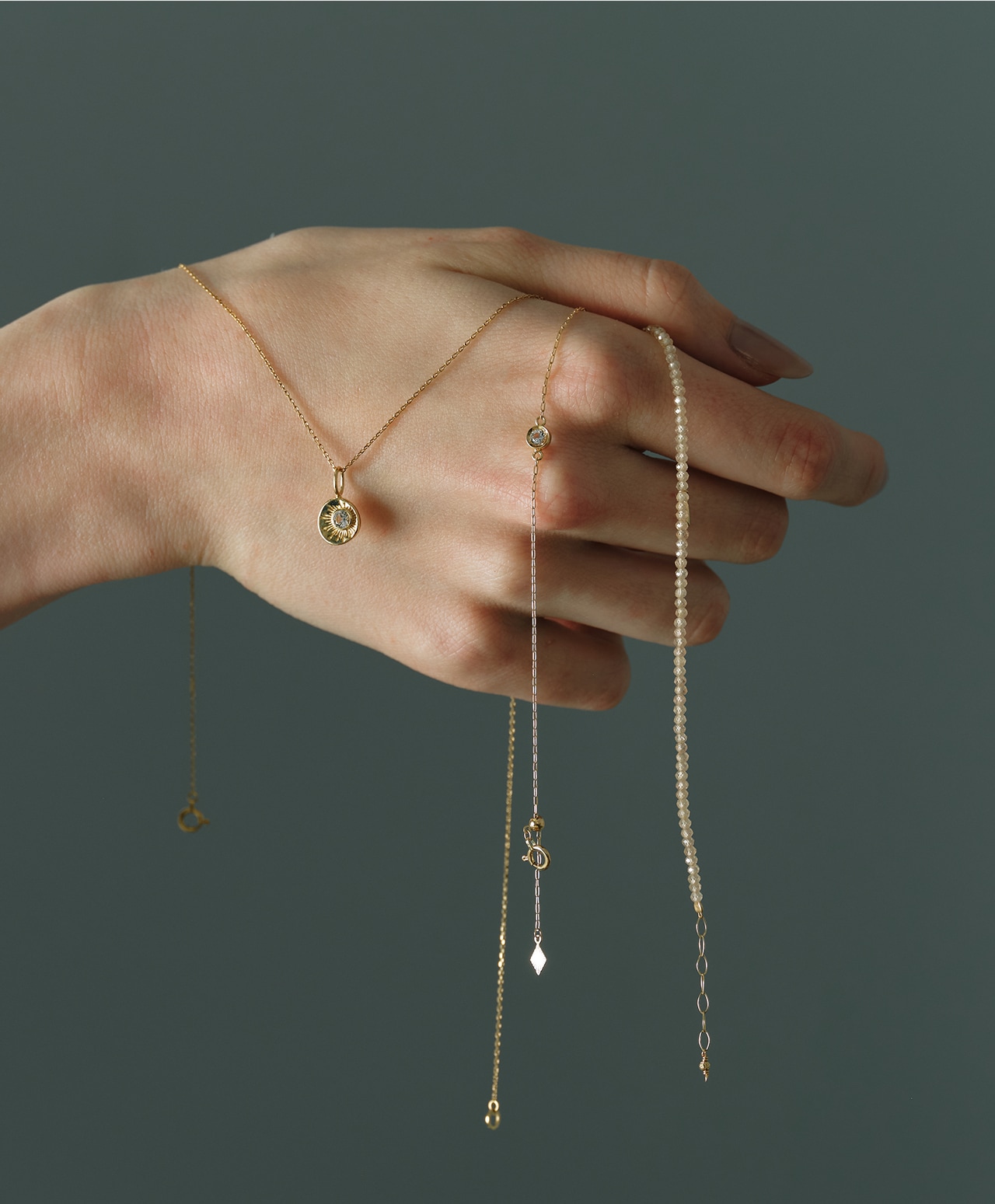 さらに、チェーンの先にはフェナカイトのエネルギーを表すキーワードの1つである「スパーク」をイメージした、テクスチャーを施したチャームを付けています。また、スライドボールでお好きな長さに調整可能です。