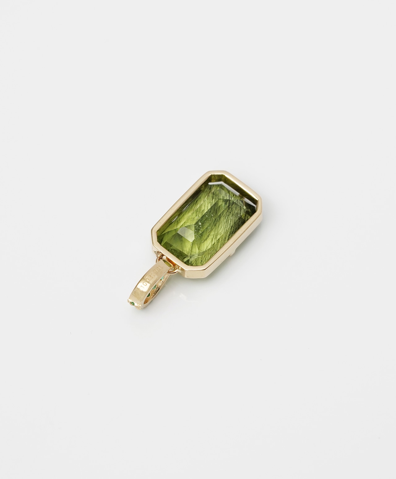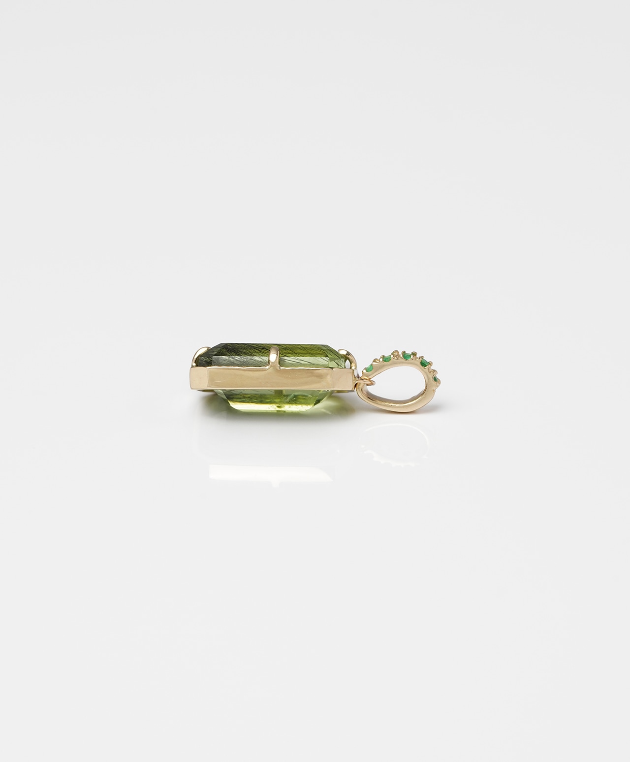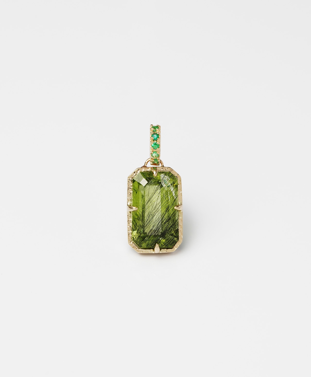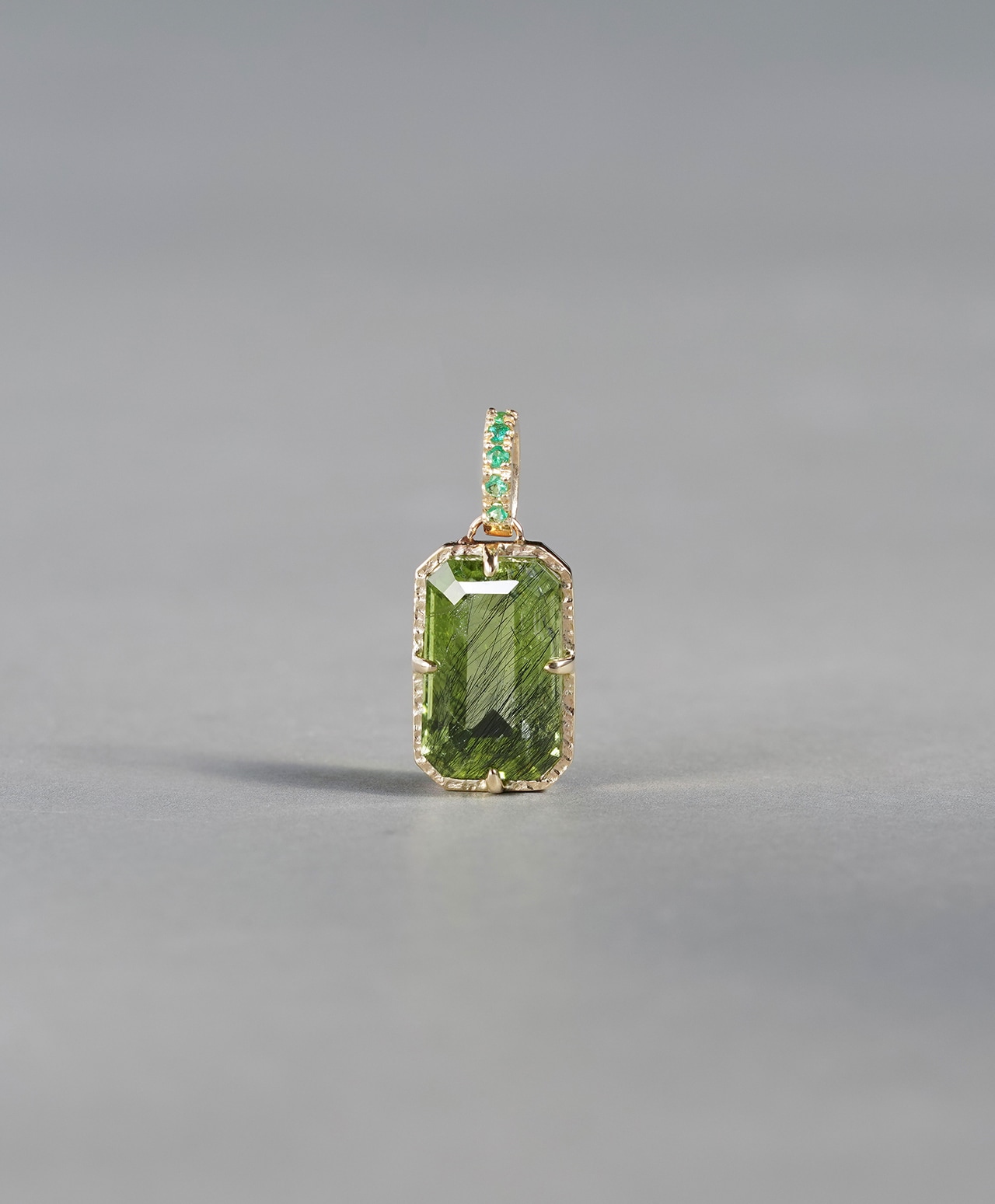 パキスタン産ルートヴィガイト・イン・ペリドットとコロンビア産エメラルドを、1点もののチャームにしました。