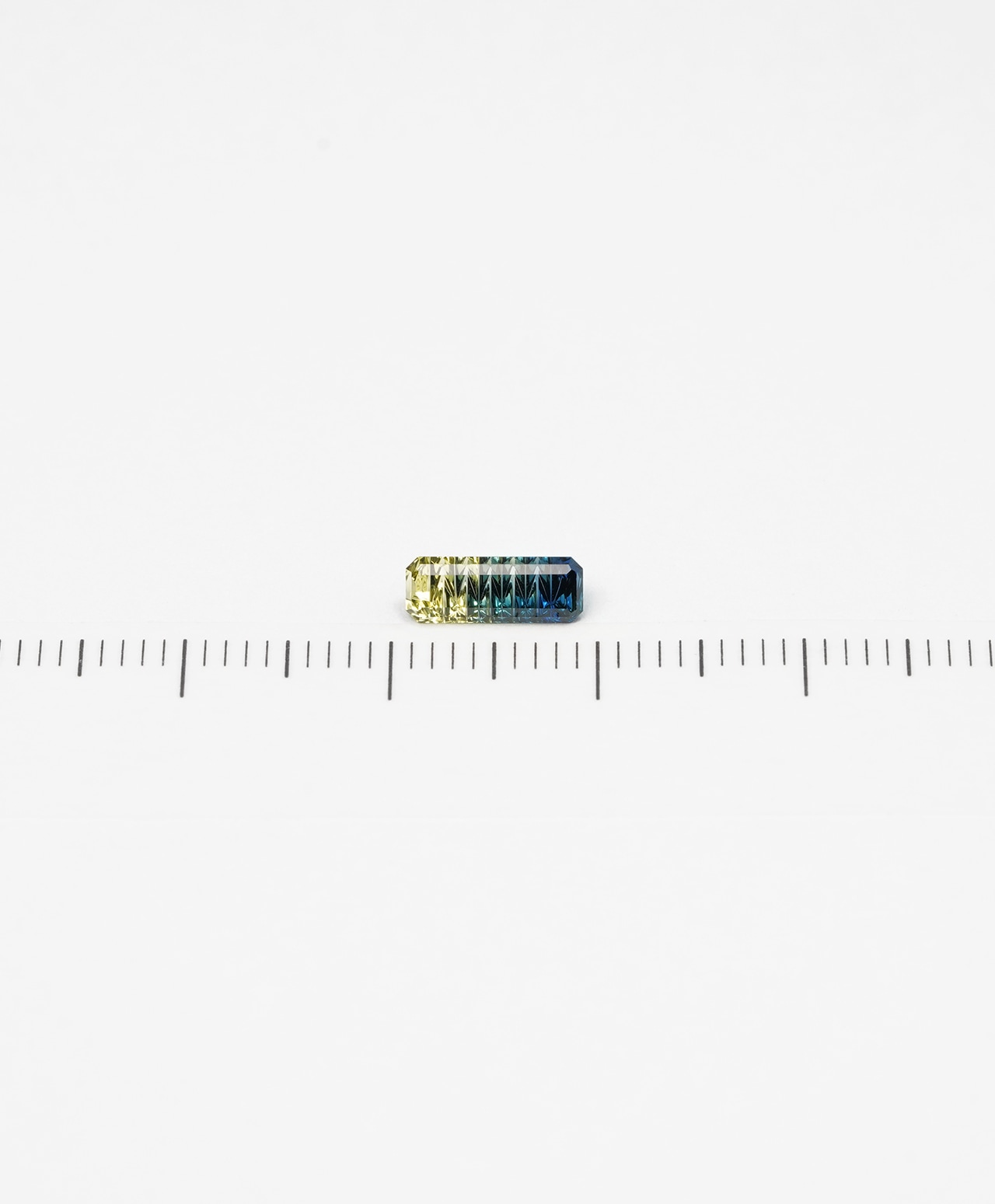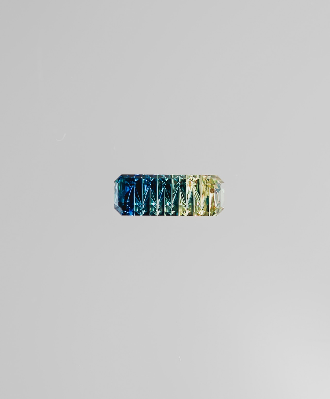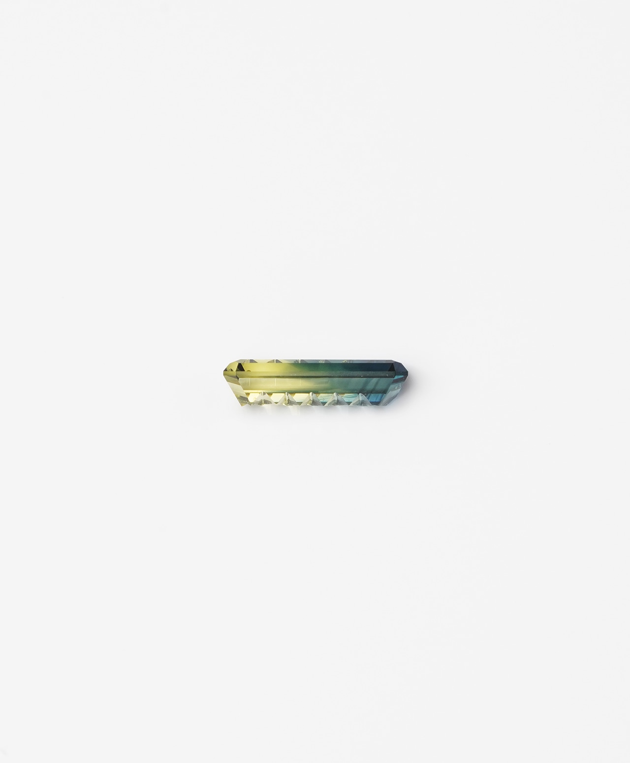 黄金色から深い青へと流れるグラデーションが美しいパーティカラーサファイア。夕陽が水平線に沈む瞬間の空と、波立つ海を一粒に閉じ込めたような、相反する色彩の共存が息を呑むような美しさを湛えています。