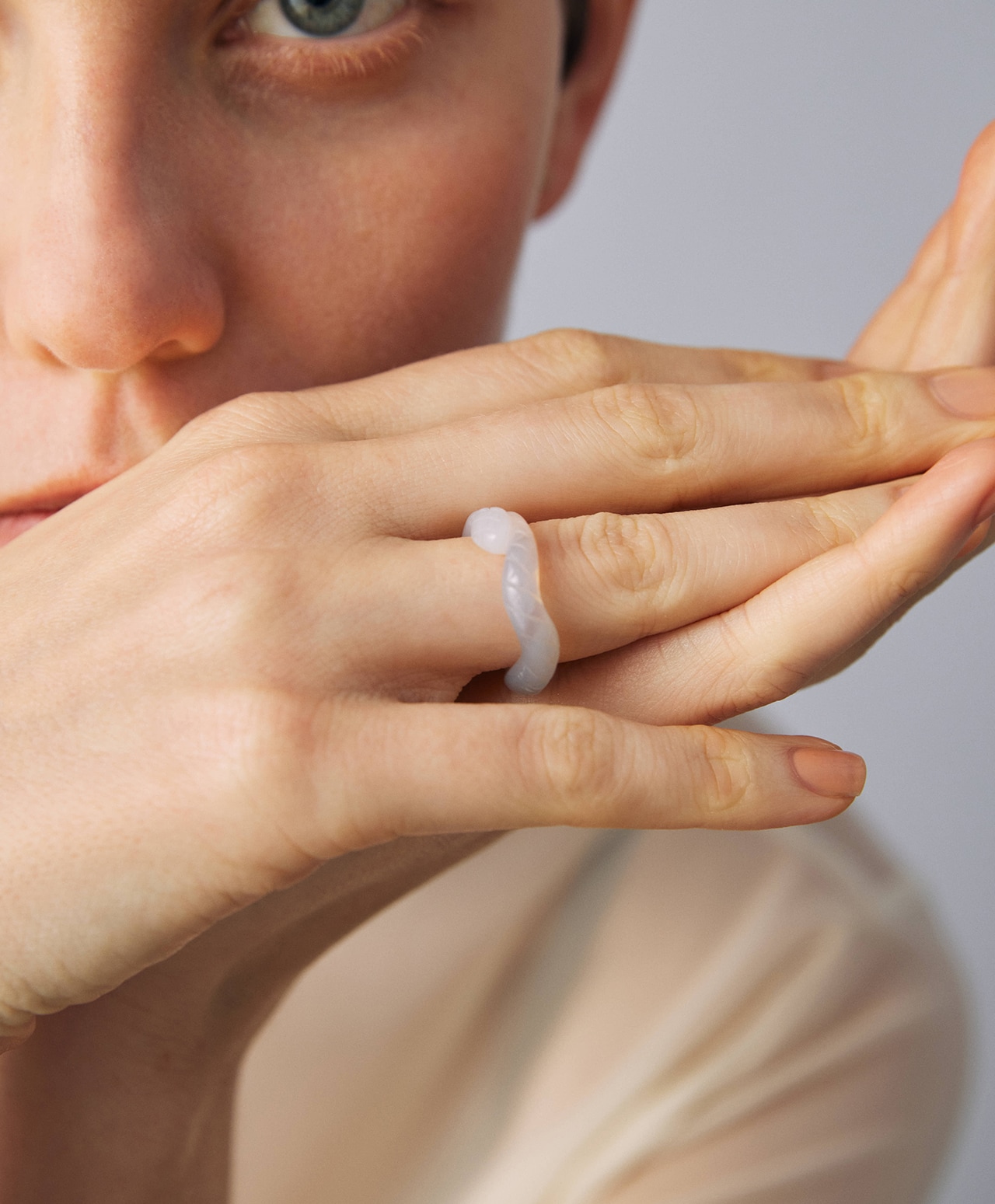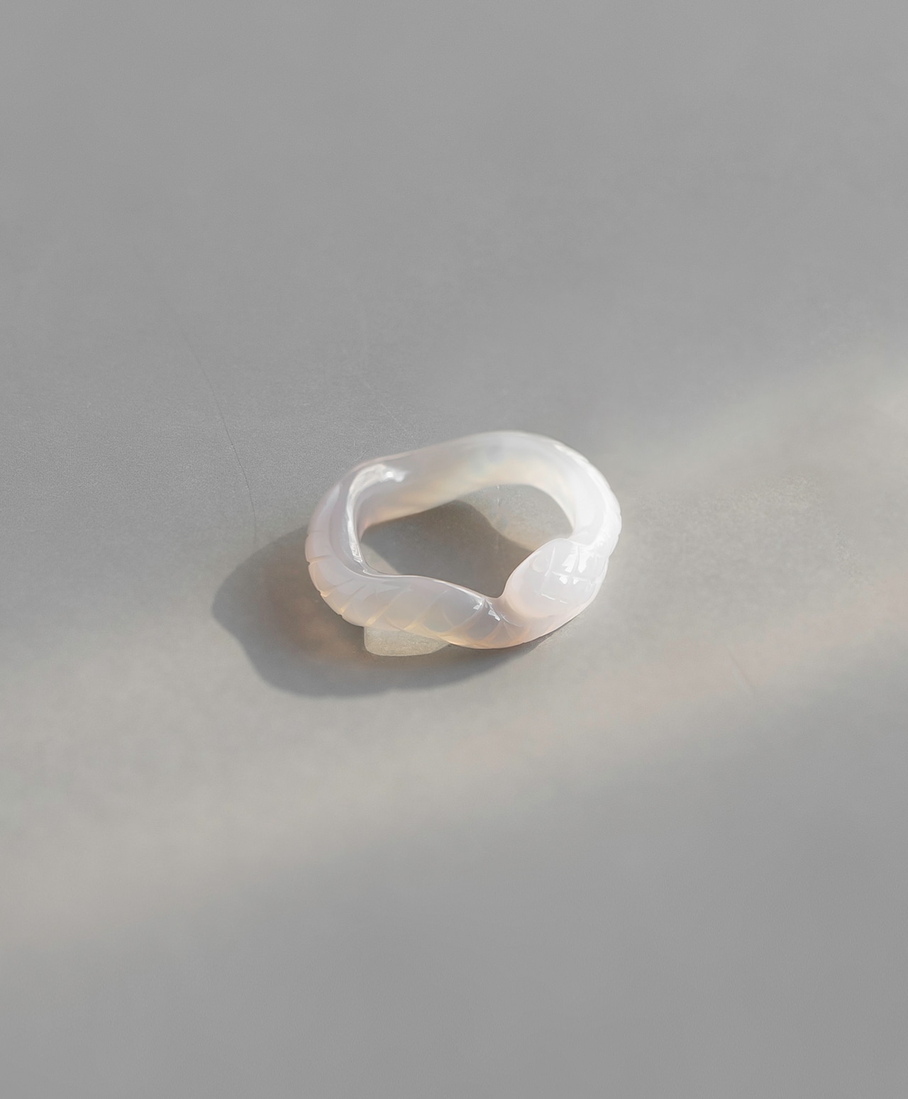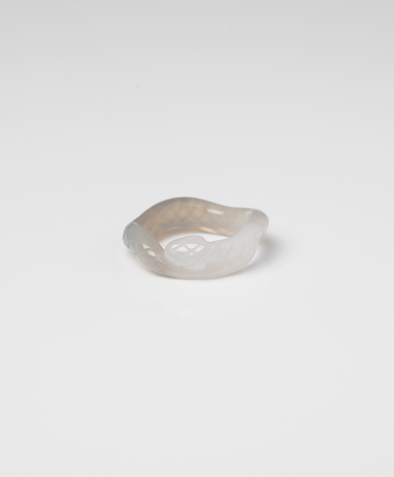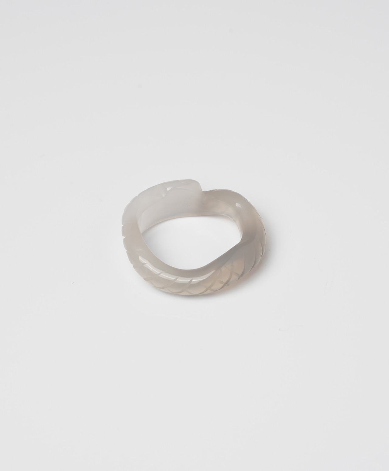 白と灰色が美しく層をなすカルセドニーカルセドニー(ブラジル産)から誂えられた、1点もののスネークリング。