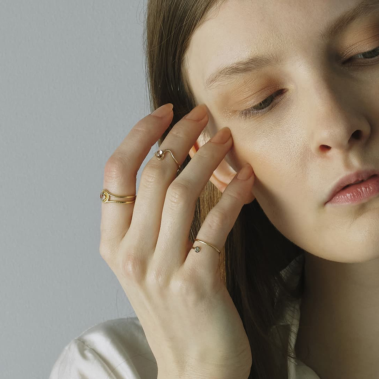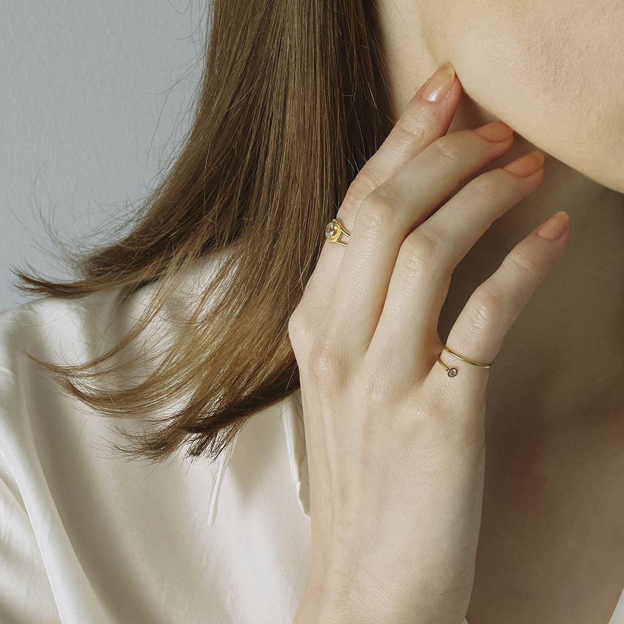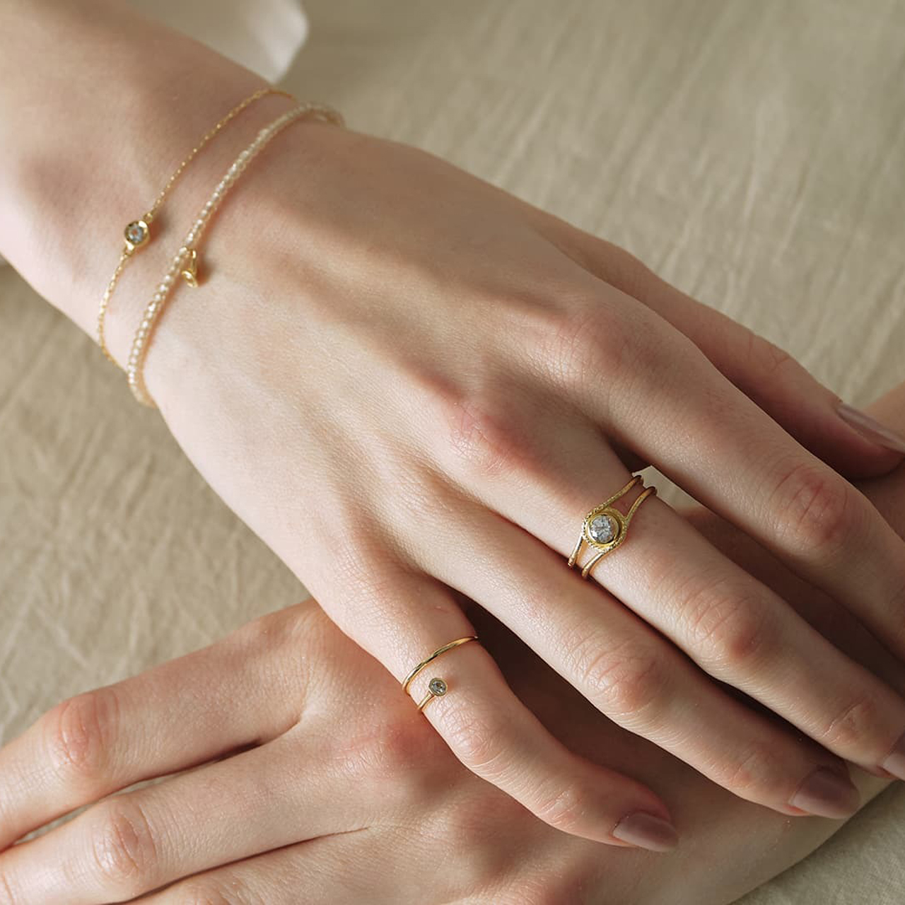 フェナカイトを指と指の間の位置にして着用しても素敵です。