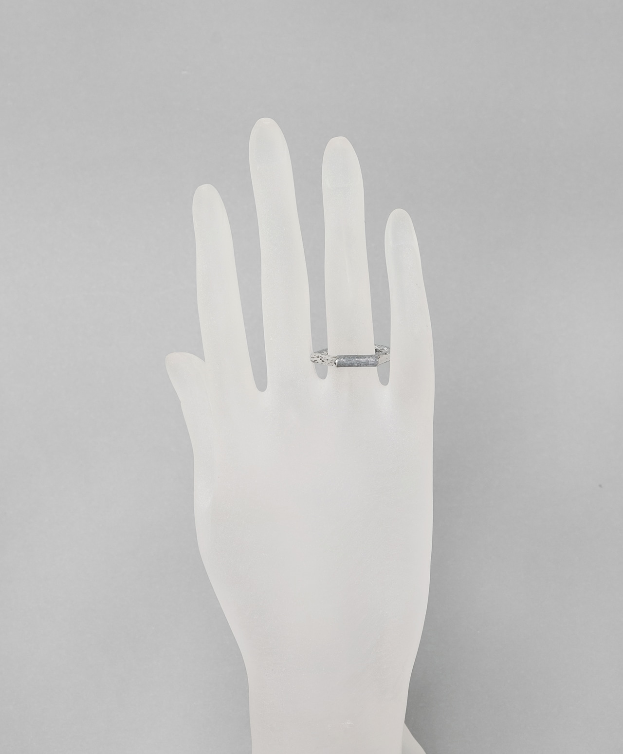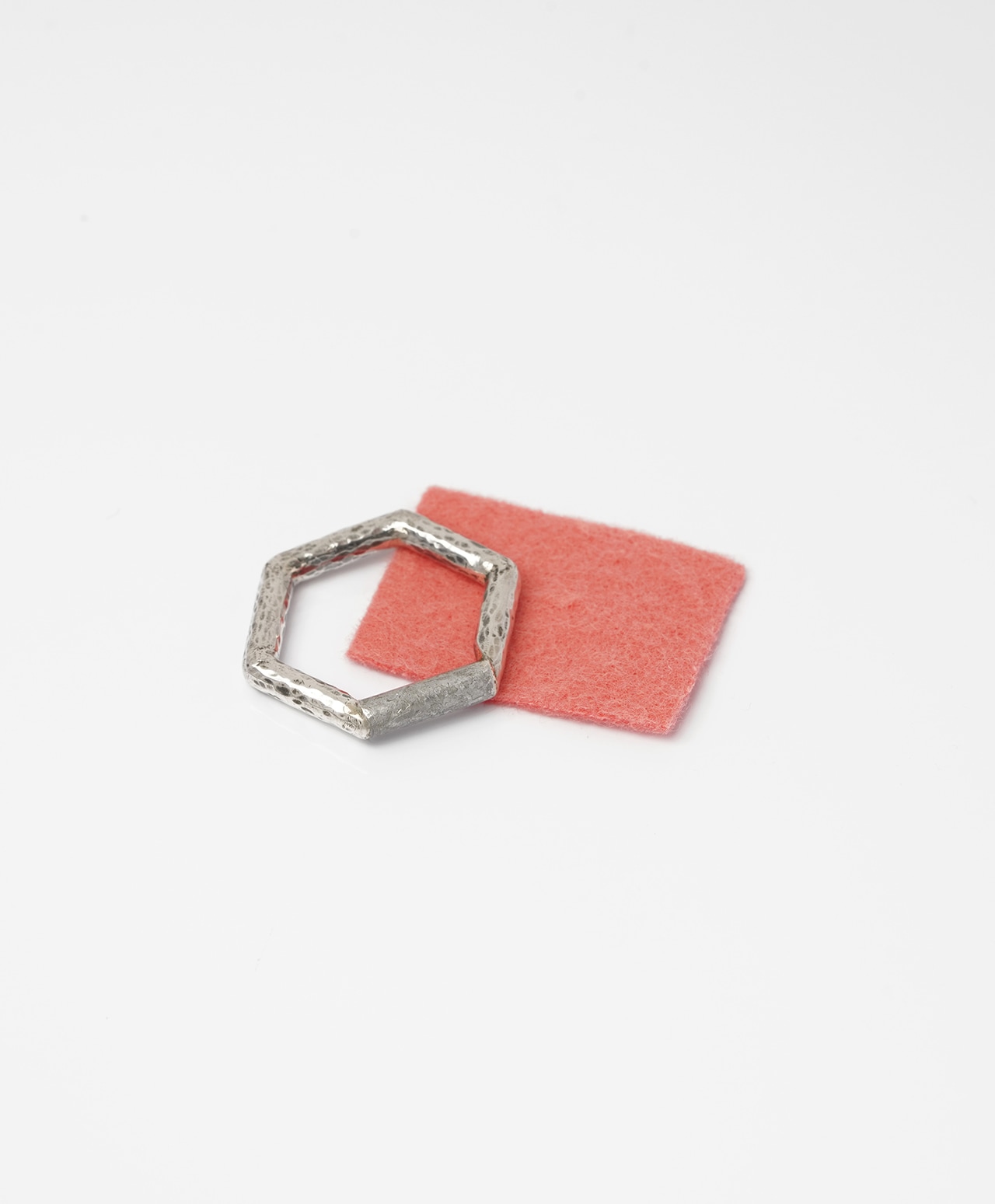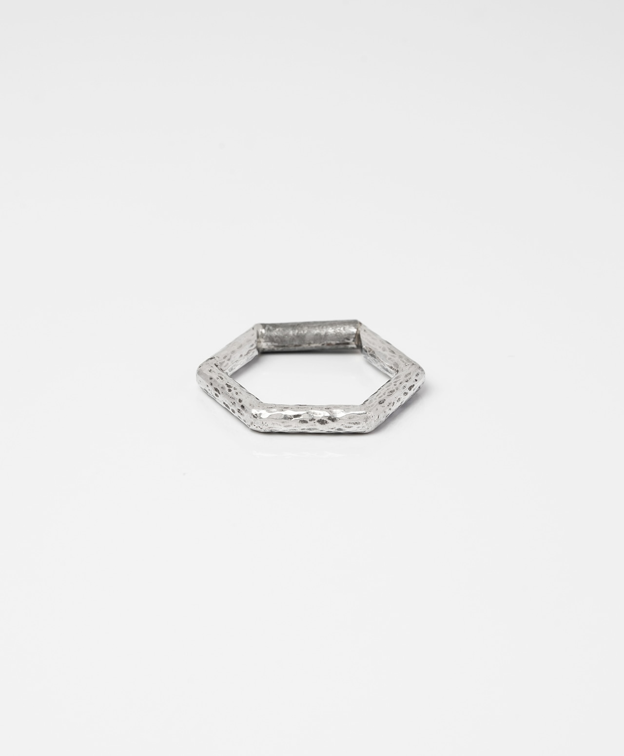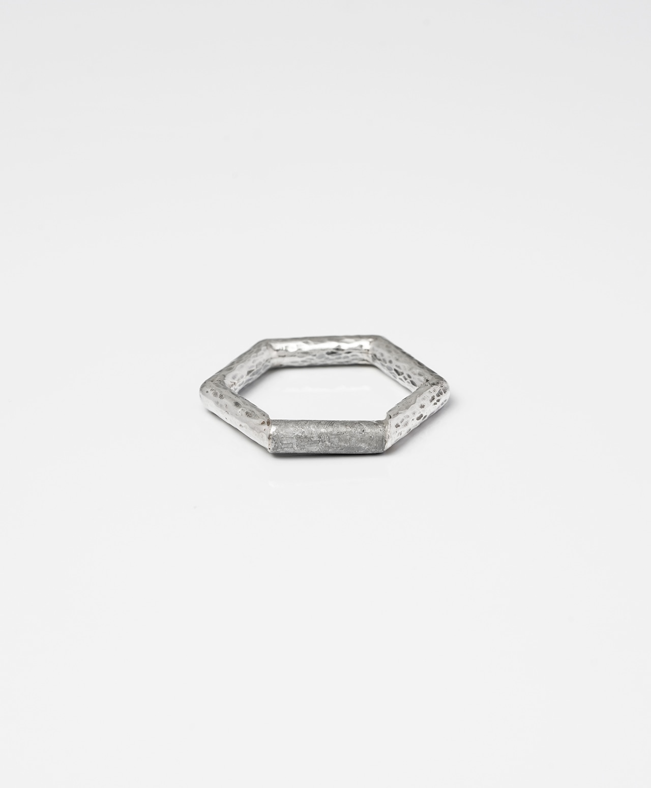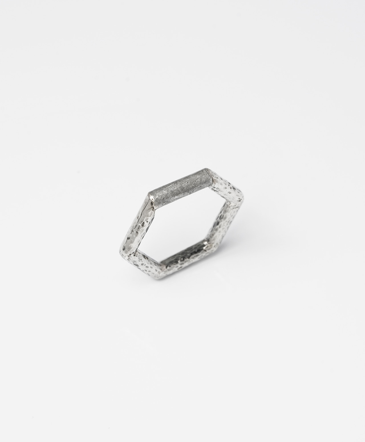 六角形のシルバーリングの正面部分に、ムオニナルスタ隕石を削り出してはめ込みました。幾何学的なフォルムと、隕石表面に浮かび上がる独特の網目模様が、手元にモダンで洗練された印象をもたらす逸品です。