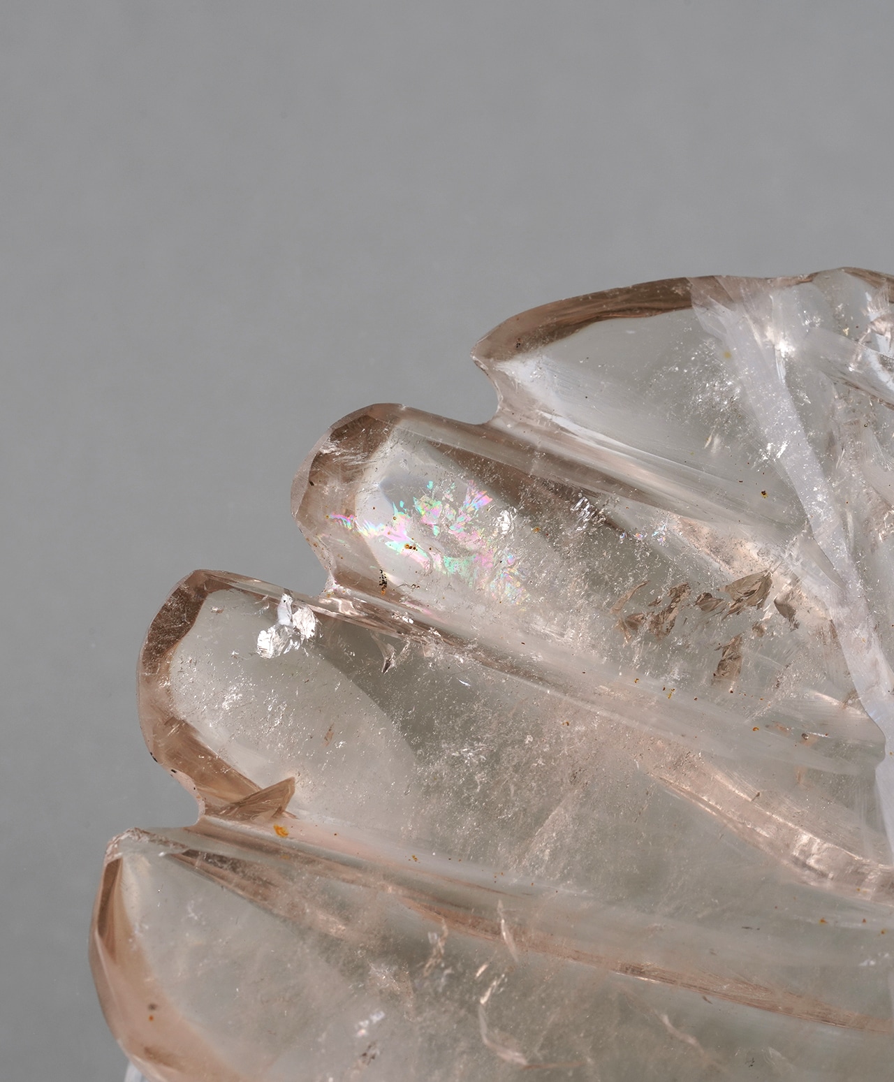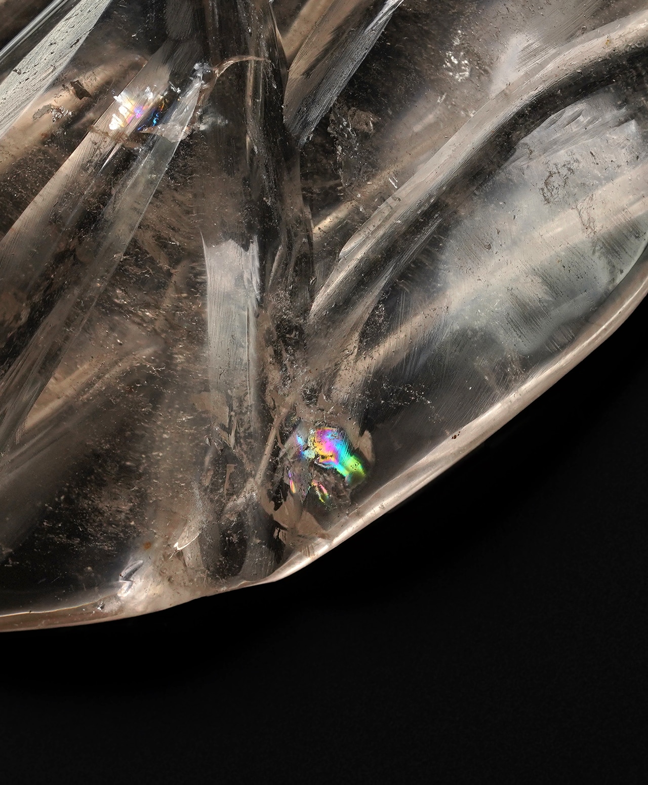 大地を背に風を受けて飛び立つ天使を思わせる、スモーキーブラウンの翼。透明からほんのりとした茶色へ、じんわりと滲むように色が移ろい、泡状の内包物が水彩画のような柔らかな景色を描いています。内部に宿る小さな虹色の輝きが祝福の光を添え、繊細でありながらも力強い存在感を放つ逸品です。