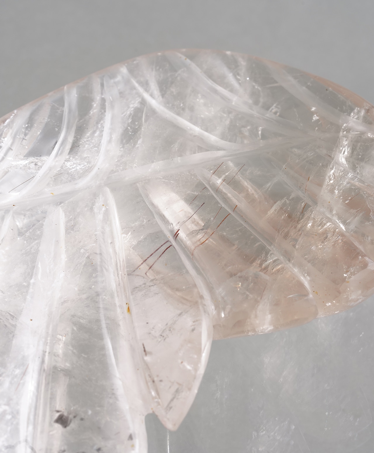 一枚一枚丁寧に彫り出された羽が、まるで今にも羽ばたきそうな躍動感を感じさせてくれる逸品です。黄金色の針状結晶が繊細に舞い、小さな虹色の輝きも見ることができます。