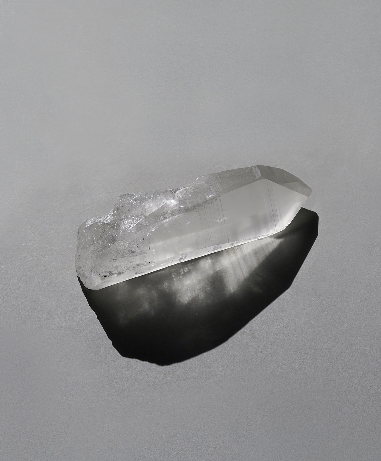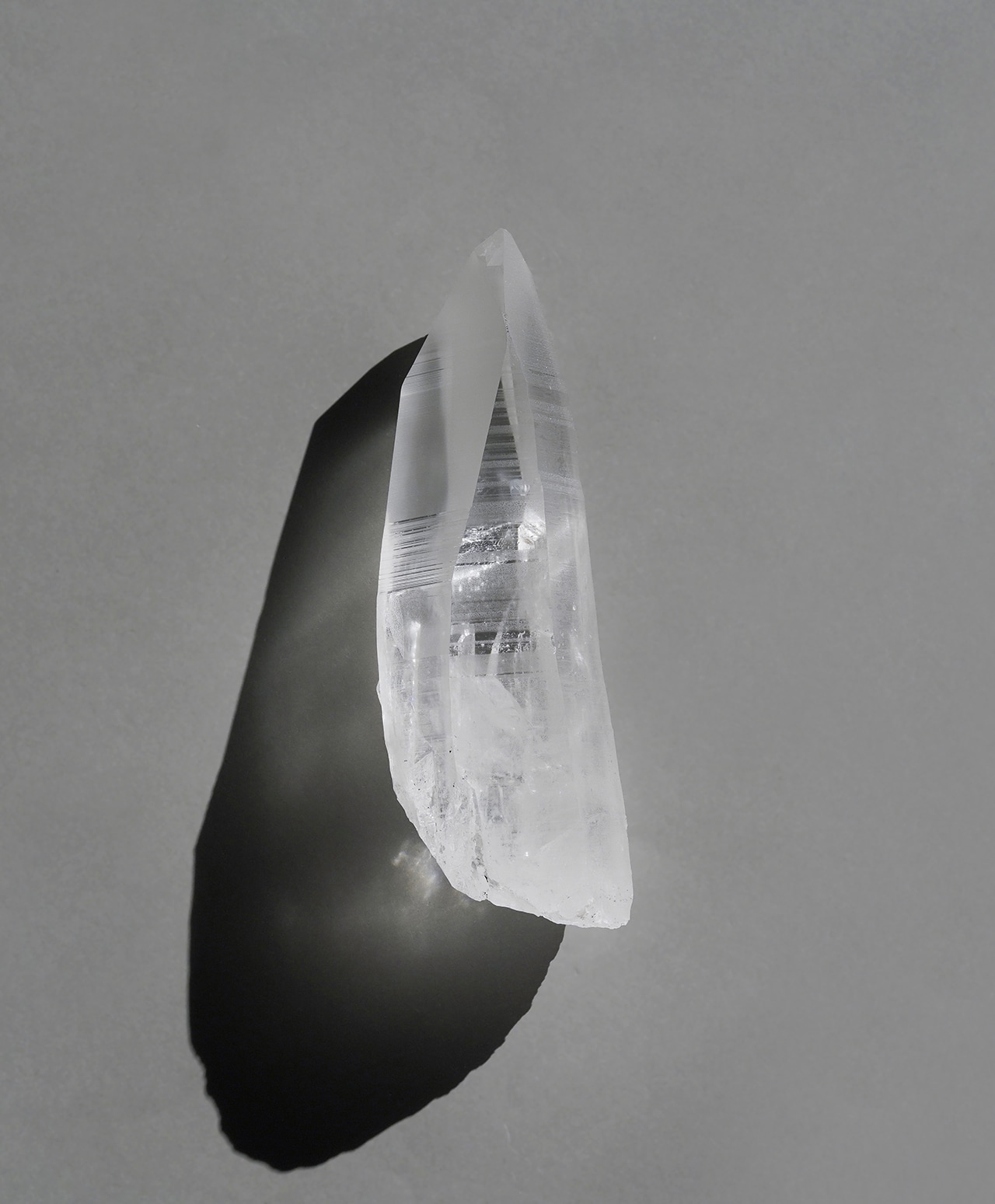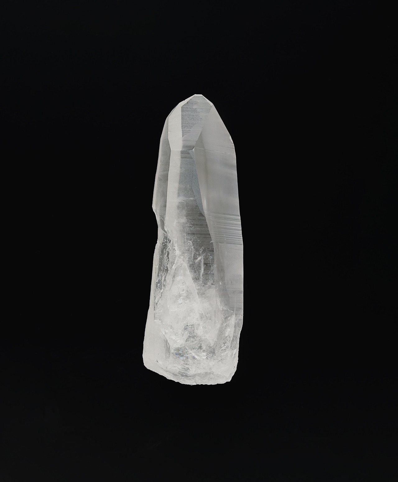 こちらは、氷柱のような清浄な透明感を湛えるレムリアンシードクォーツ。側面には、古代レムリア文明の叡智が記録されていると言われる条線(レムリアンリッジ)が刻まれ、まるで祈りの塔のような神聖な佇まいを見せています。