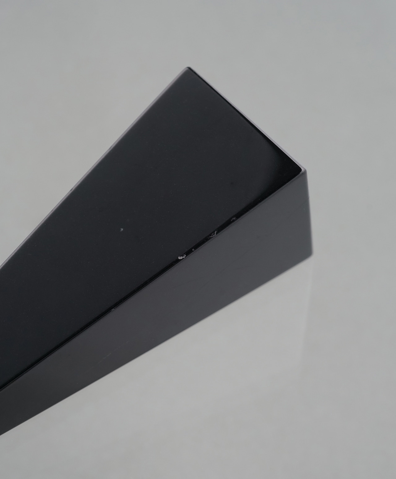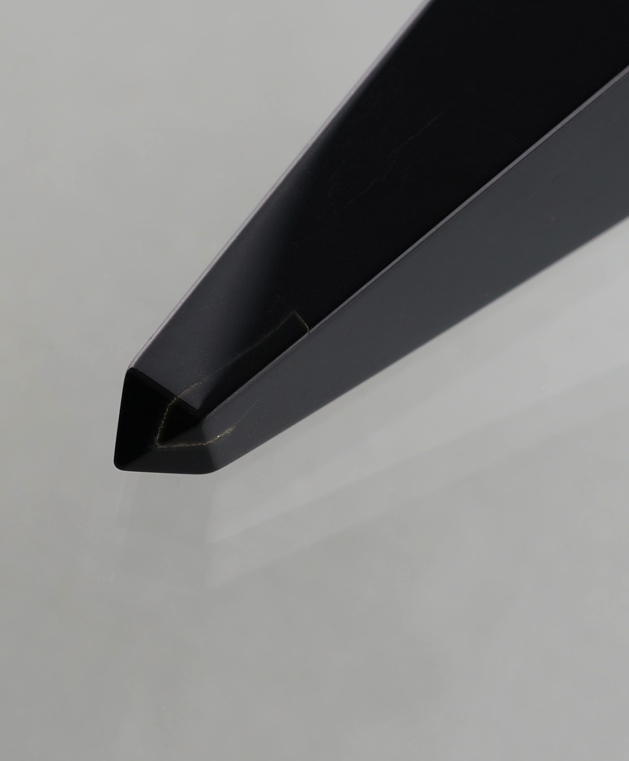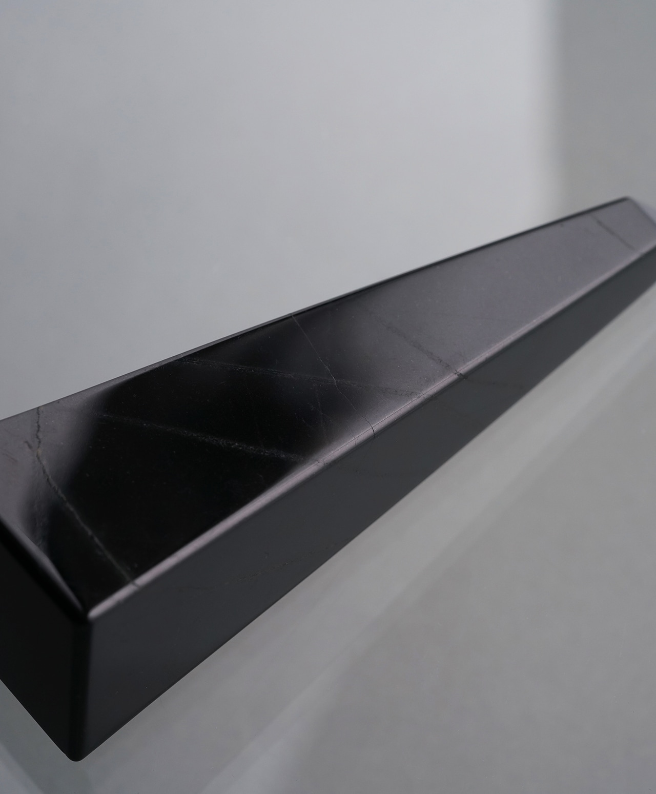 天然とは思えないほど均一で滑らかな漆黒の表面。光を深く吸い込みながらも、わずかな角度で静かに反射し、まるで夜の湖面のような深い艶を湛えています。