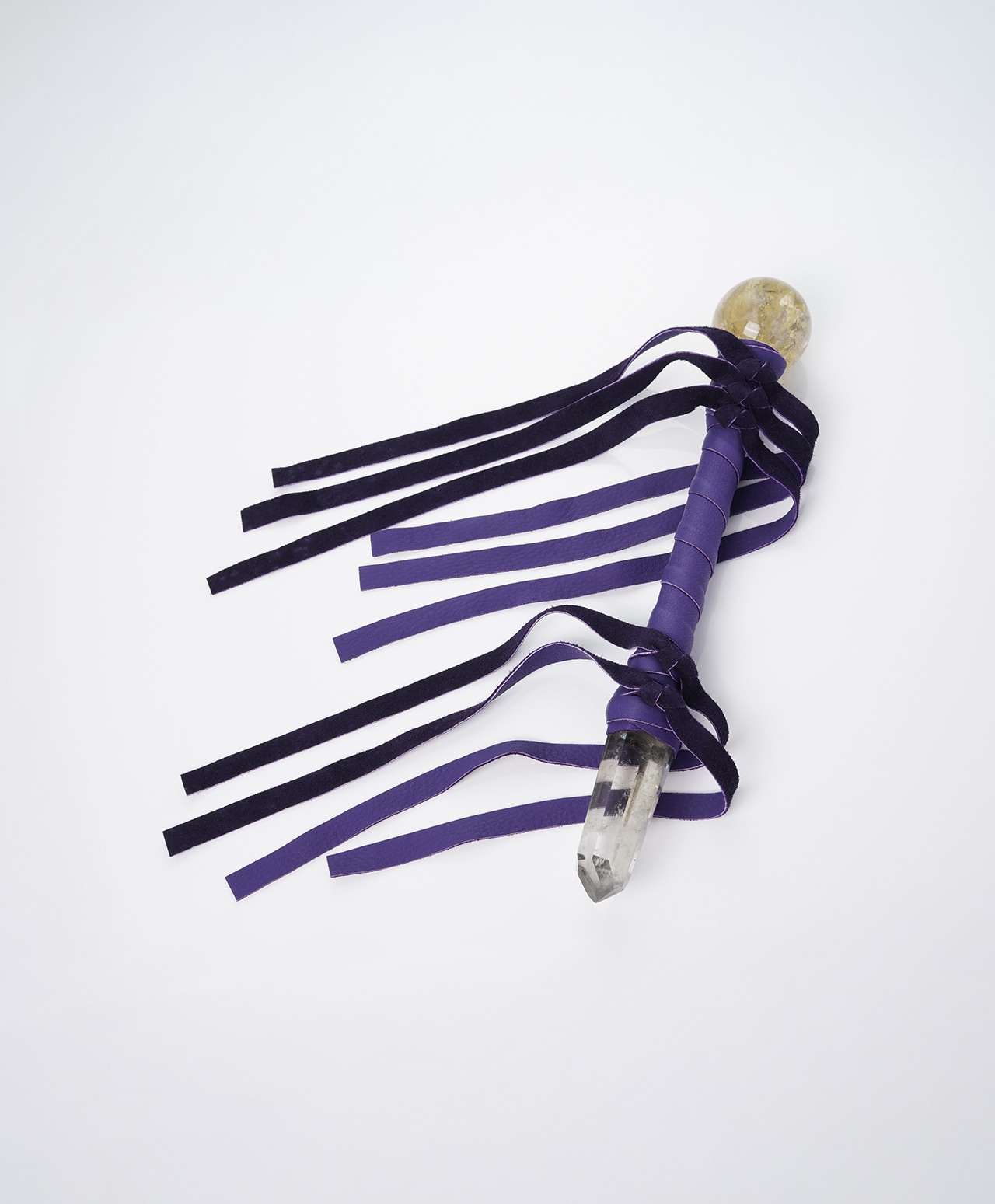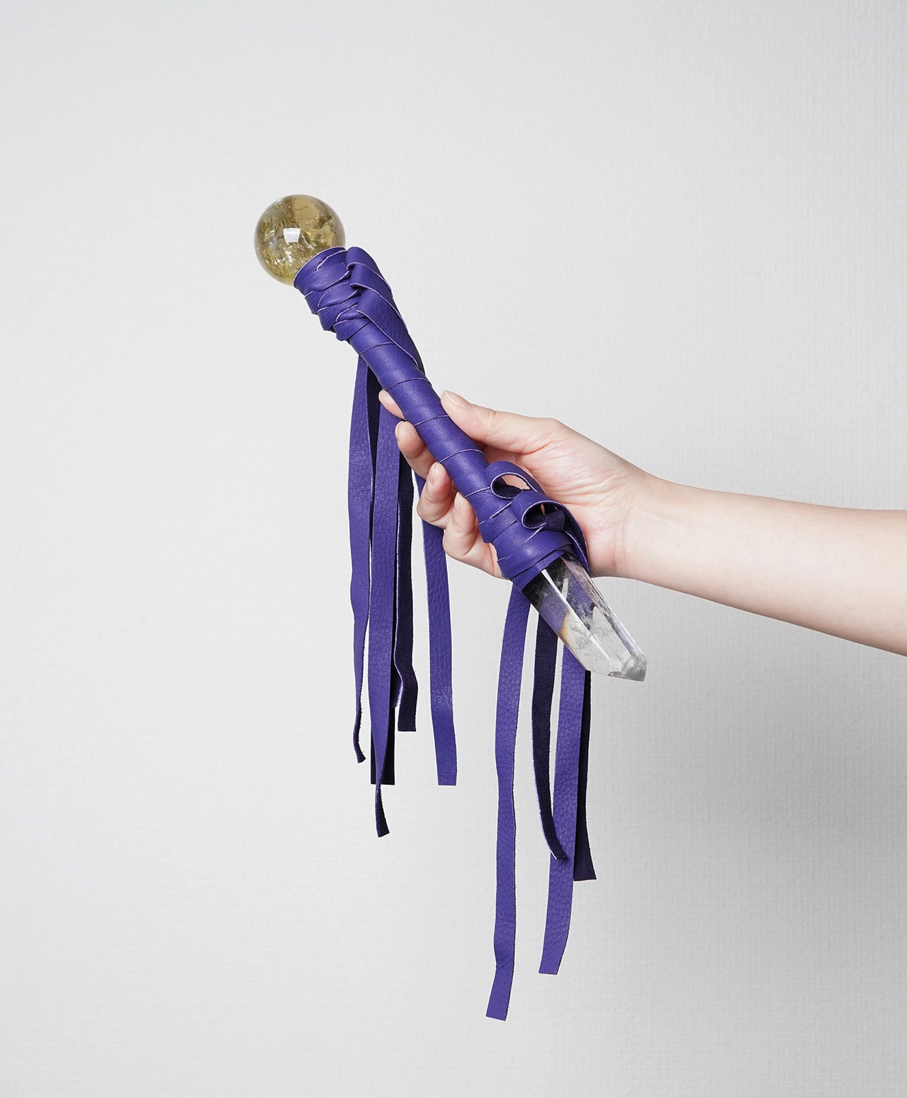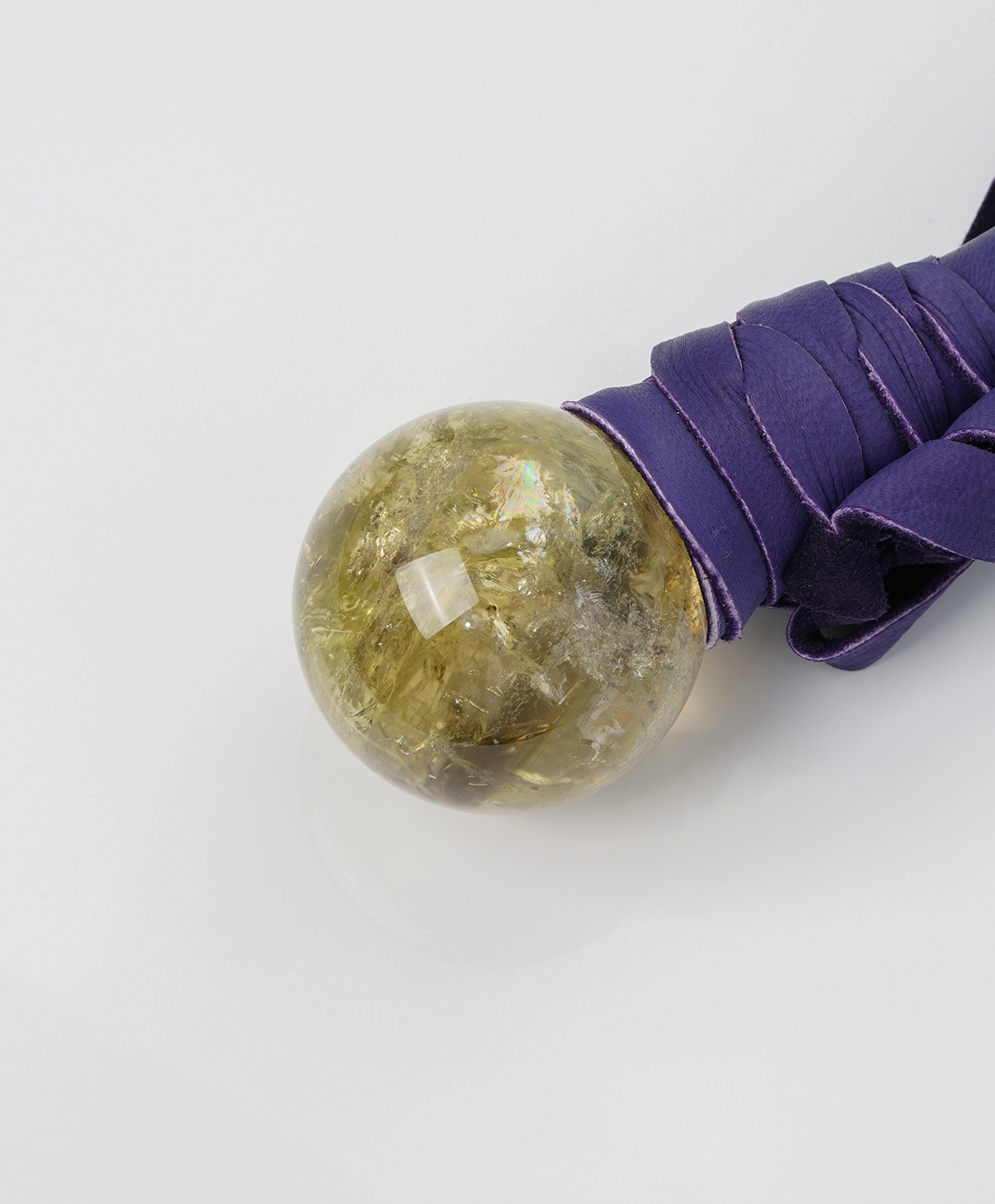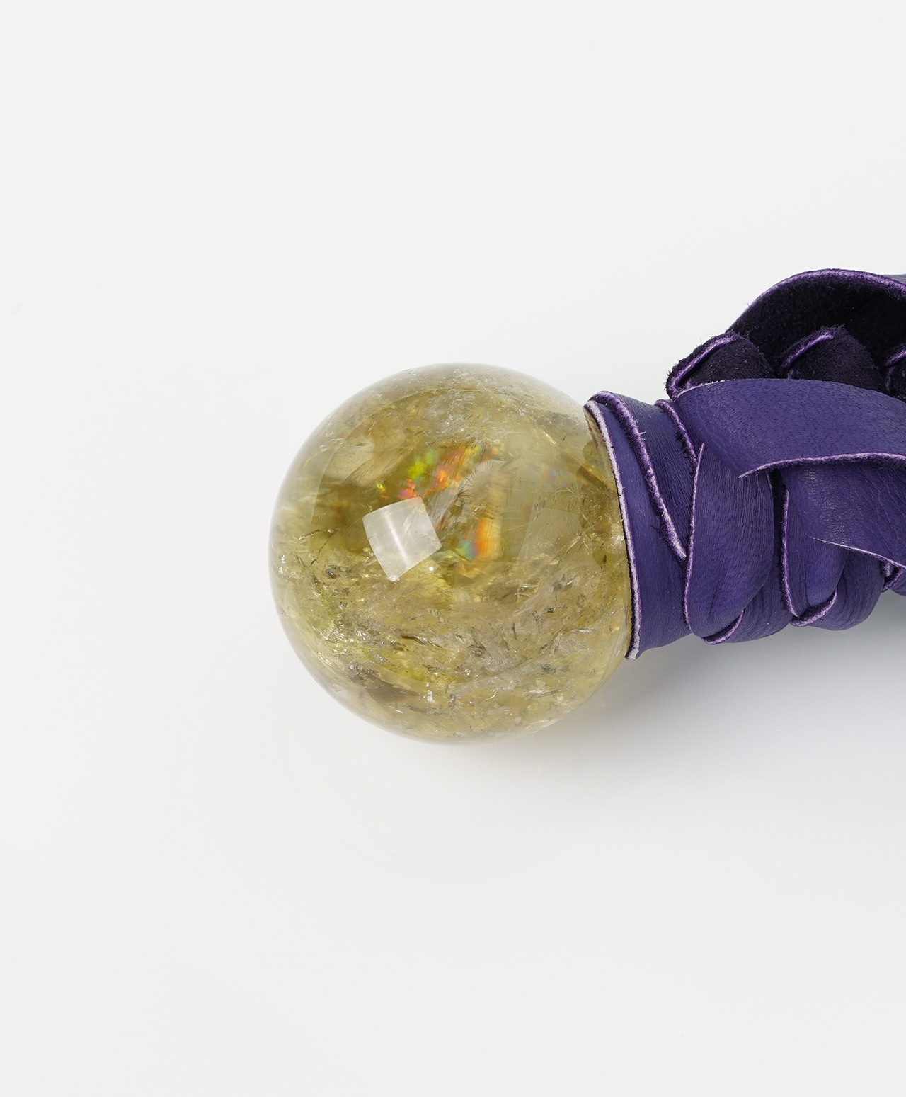 透明感と深みを湛えた球体の中には小さな虹が煌めき、その下には清冽な輝きを放つクォーツが力強く伸びています。深い青の鹿革で丁寧に巻かれたハンドル部分から、しなやかな革房が優雅に流れ、黄金の輝きと透明な光を静かに結びます。
