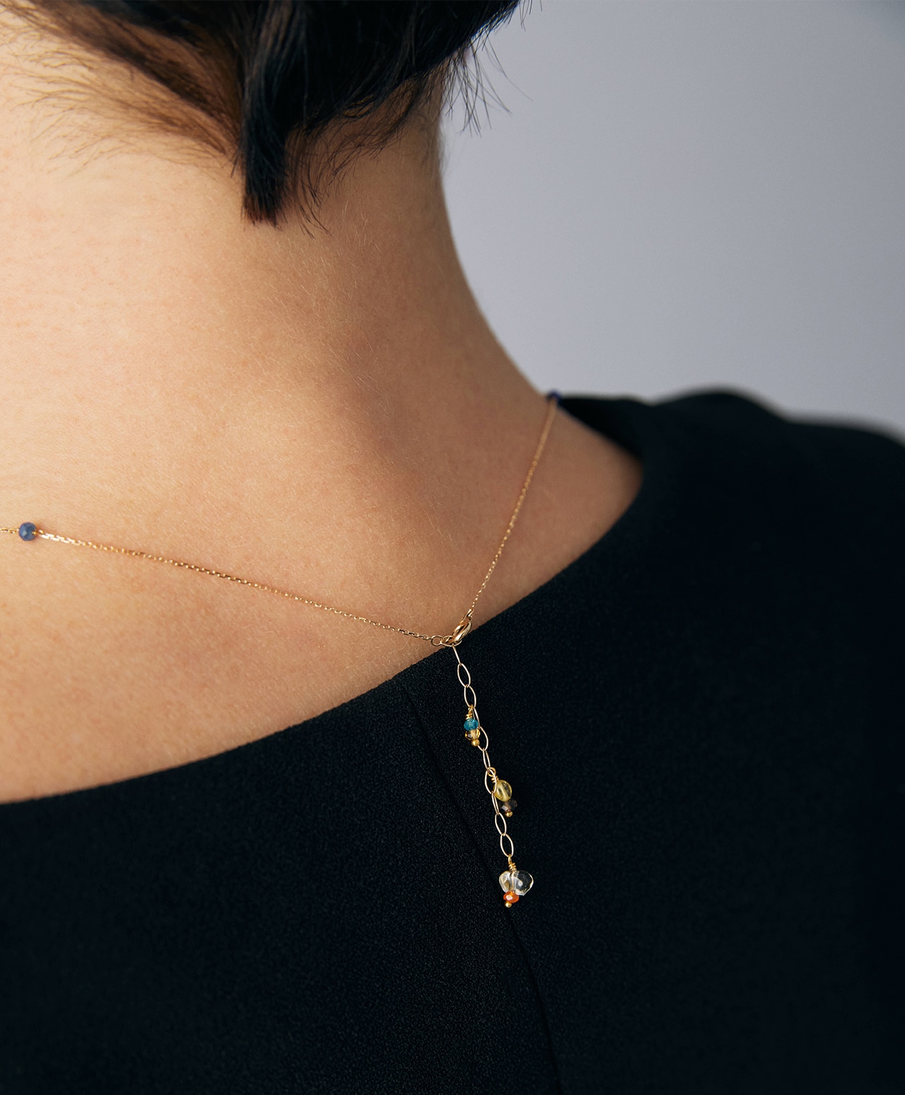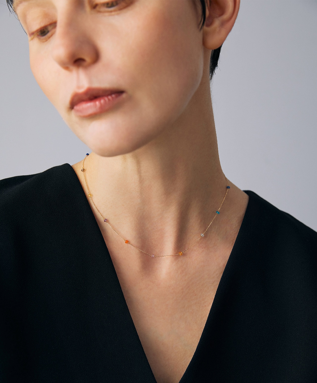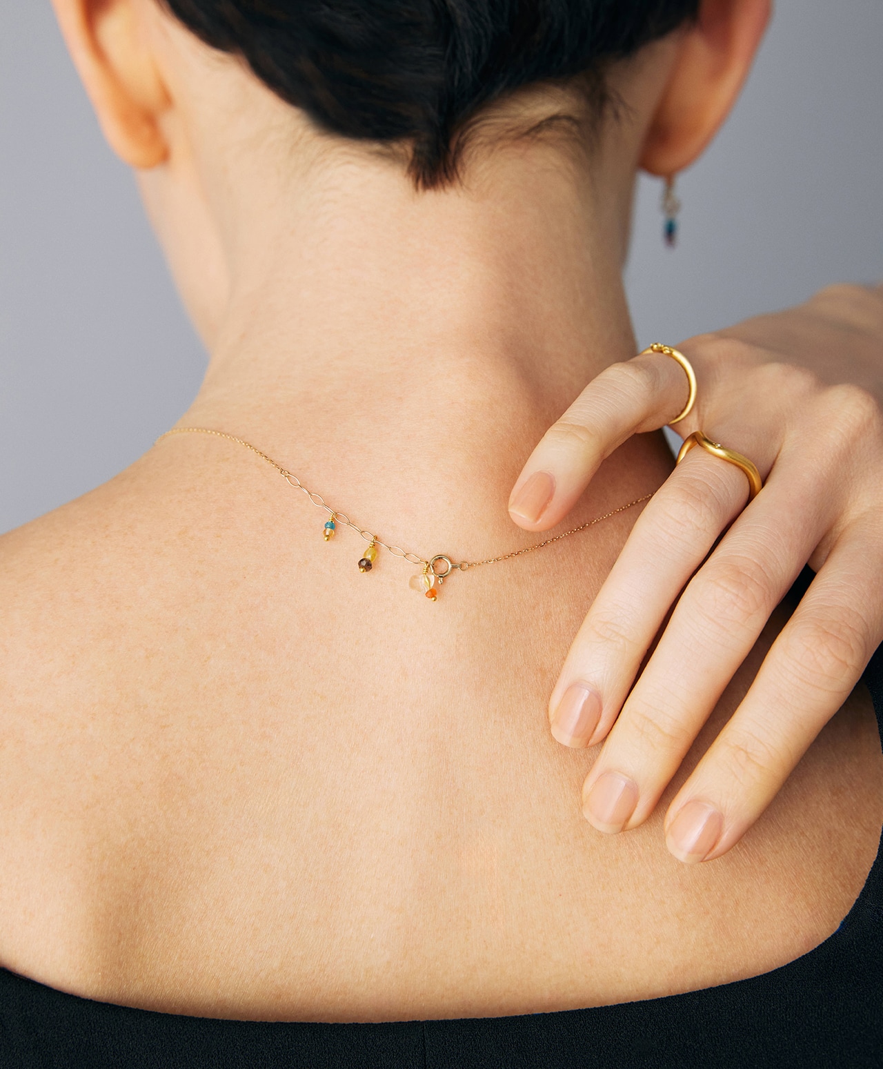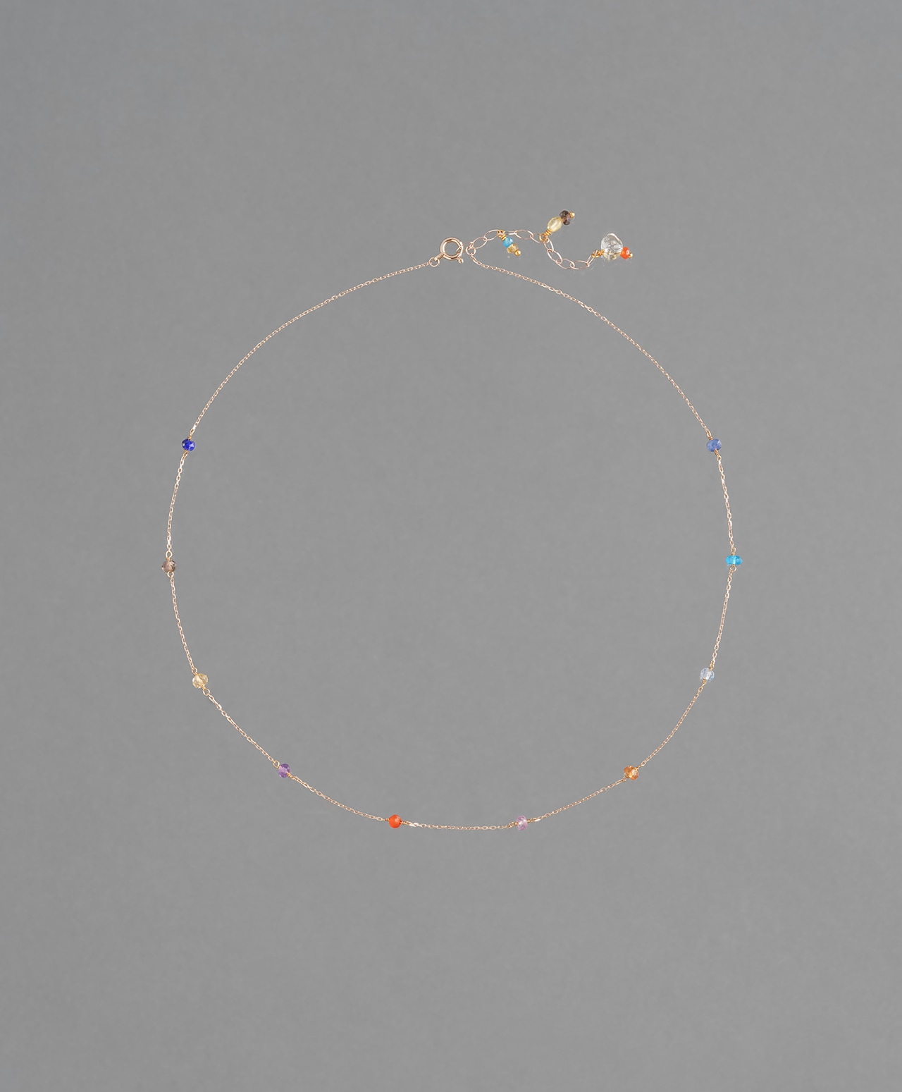 カラフルなストーンたちが肌の上で軽やかに輝き、アジャスターチェーンにも石をあしらうことで、後ろ姿までも美しく演出します。短めの作りは他のチェーンとの重ね付けにも相性が良く、コーディネートの幅を広げてくれます。