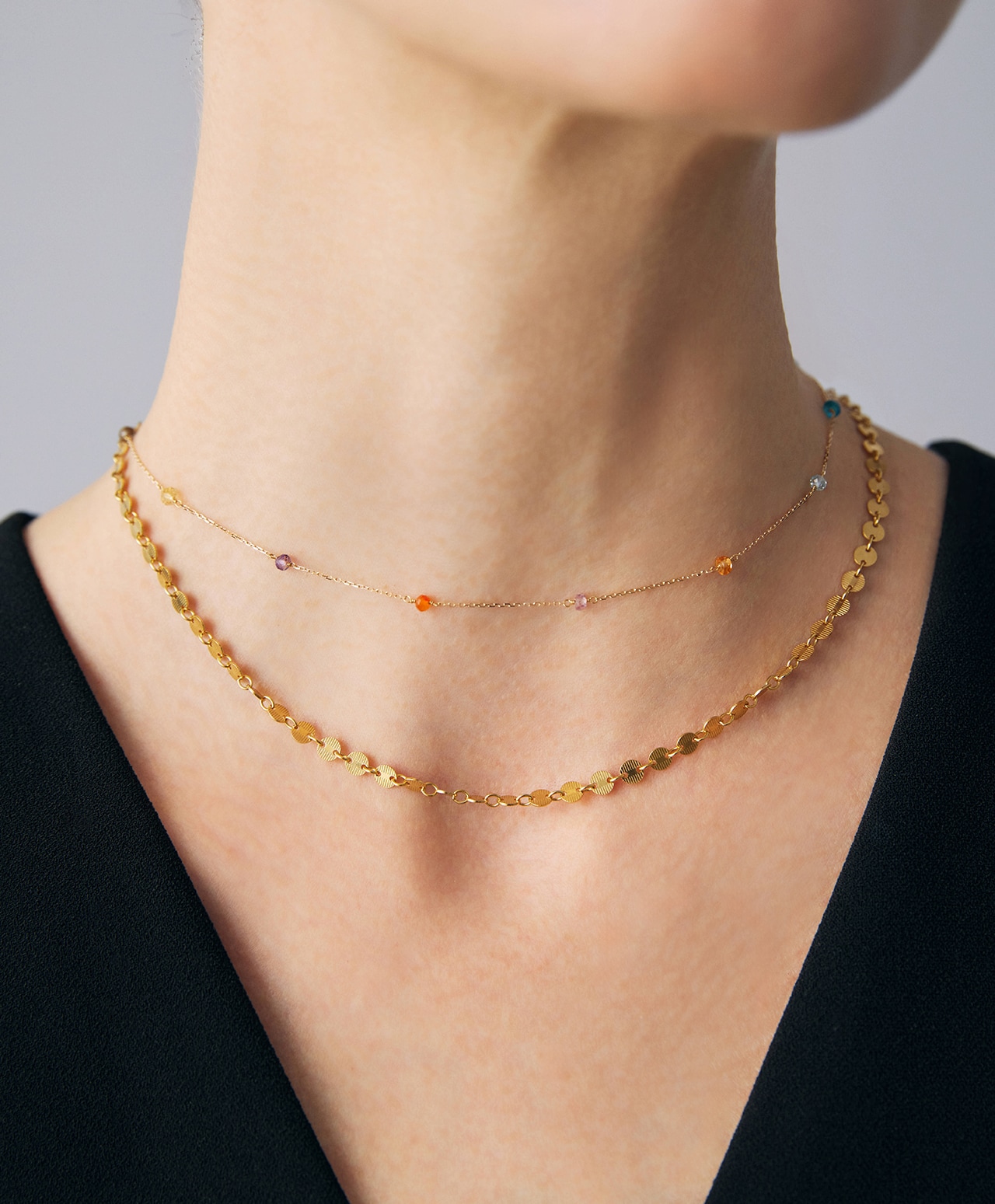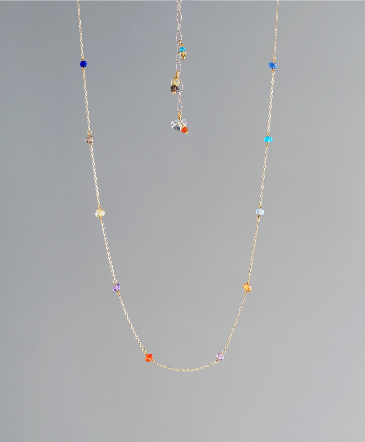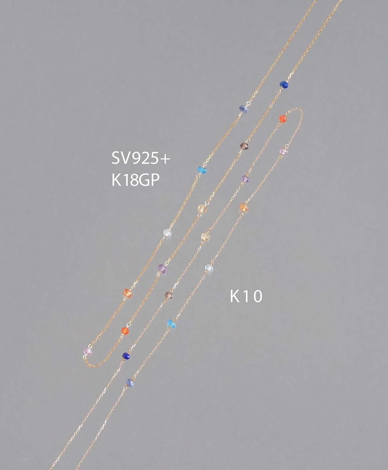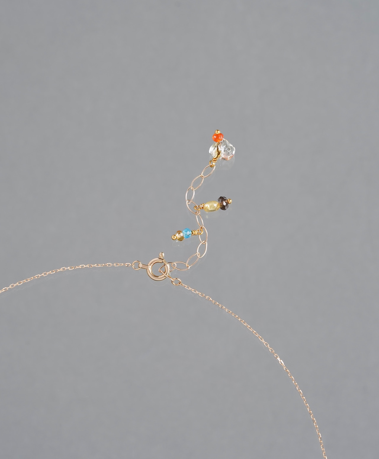カラフルなストーンたちが肌の上で軽やかに輝き、アジャスターチェーンにも石をあしらうことで、後ろ姿までも美しく演出します。短めの作りは他のチェーンとの重ね付けにも相性が良く、コーディネートの幅を広げてくれます。