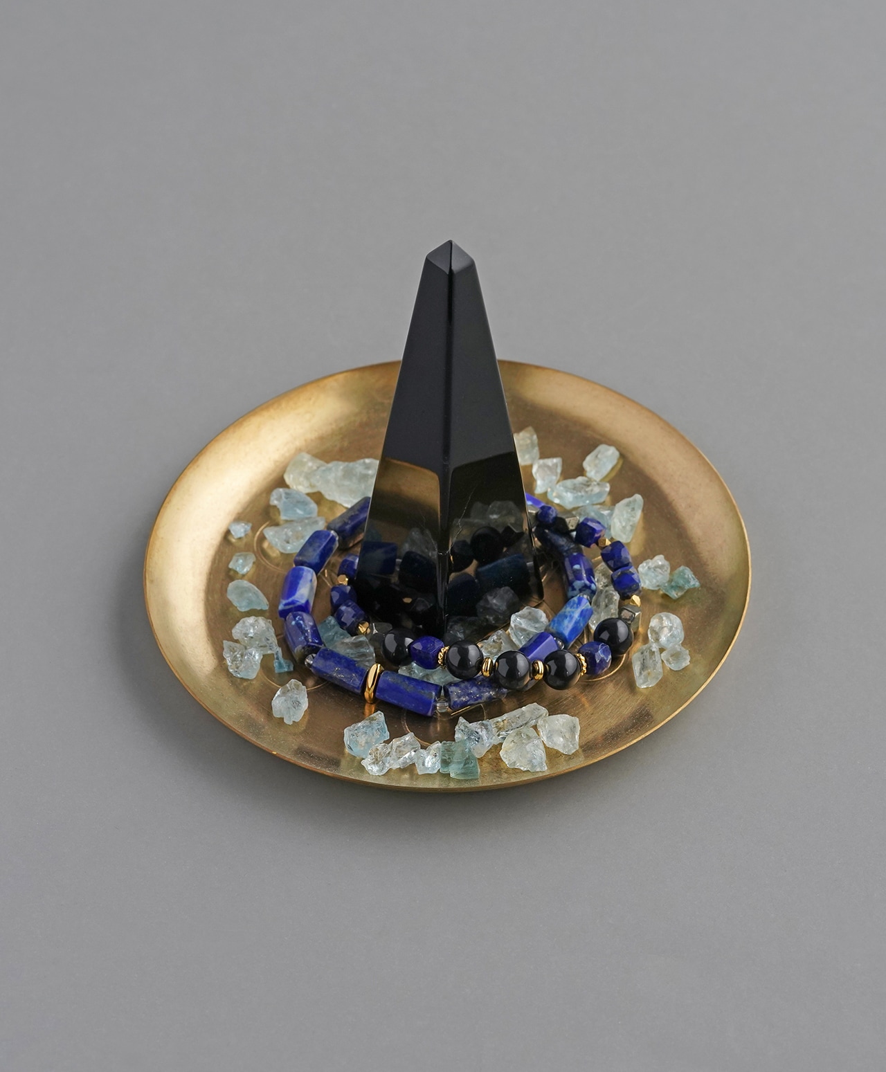 夜の帳が静かに降りる瞬間の空を思わせる深い群青のラピスラズリの間には、透明なクォーツをあしらいました。澄んだクォーツの輝きがラピスラズリの深い青をやわらかく引き立て、腕に沿うなだらかなラインを描きます。