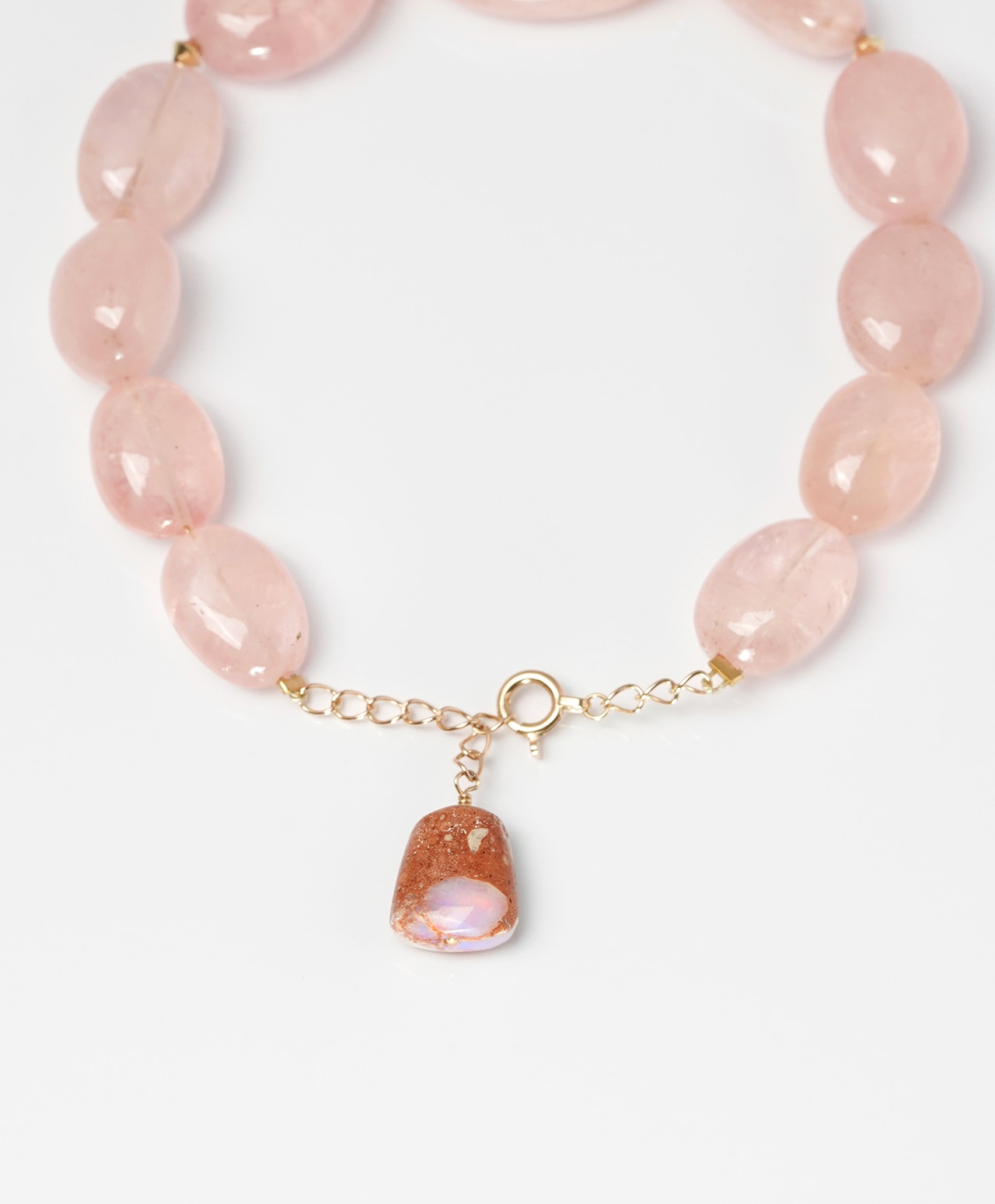 艶やかに研磨された、素晴らしいボリュームのビーズたち。エンドチェーンの先端には、オーストラリア産のボルダーオパールという豪華な脇役を配置しました。