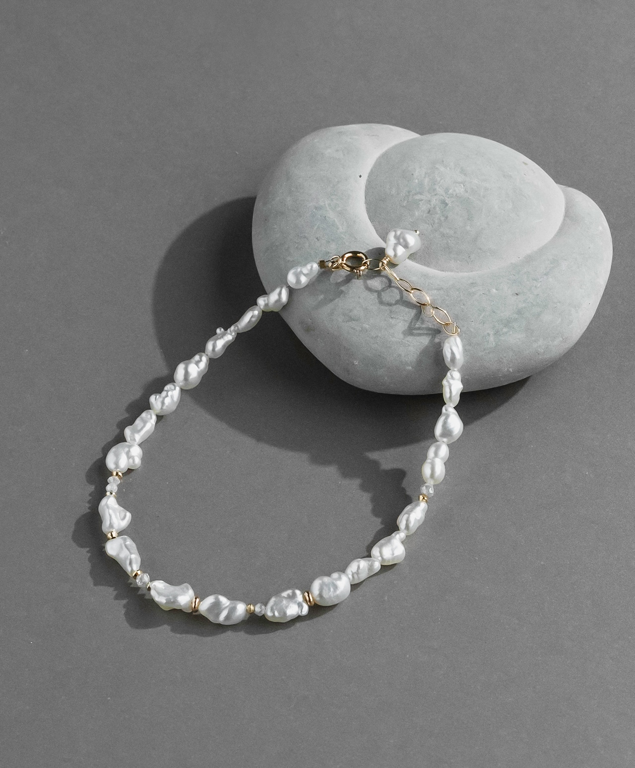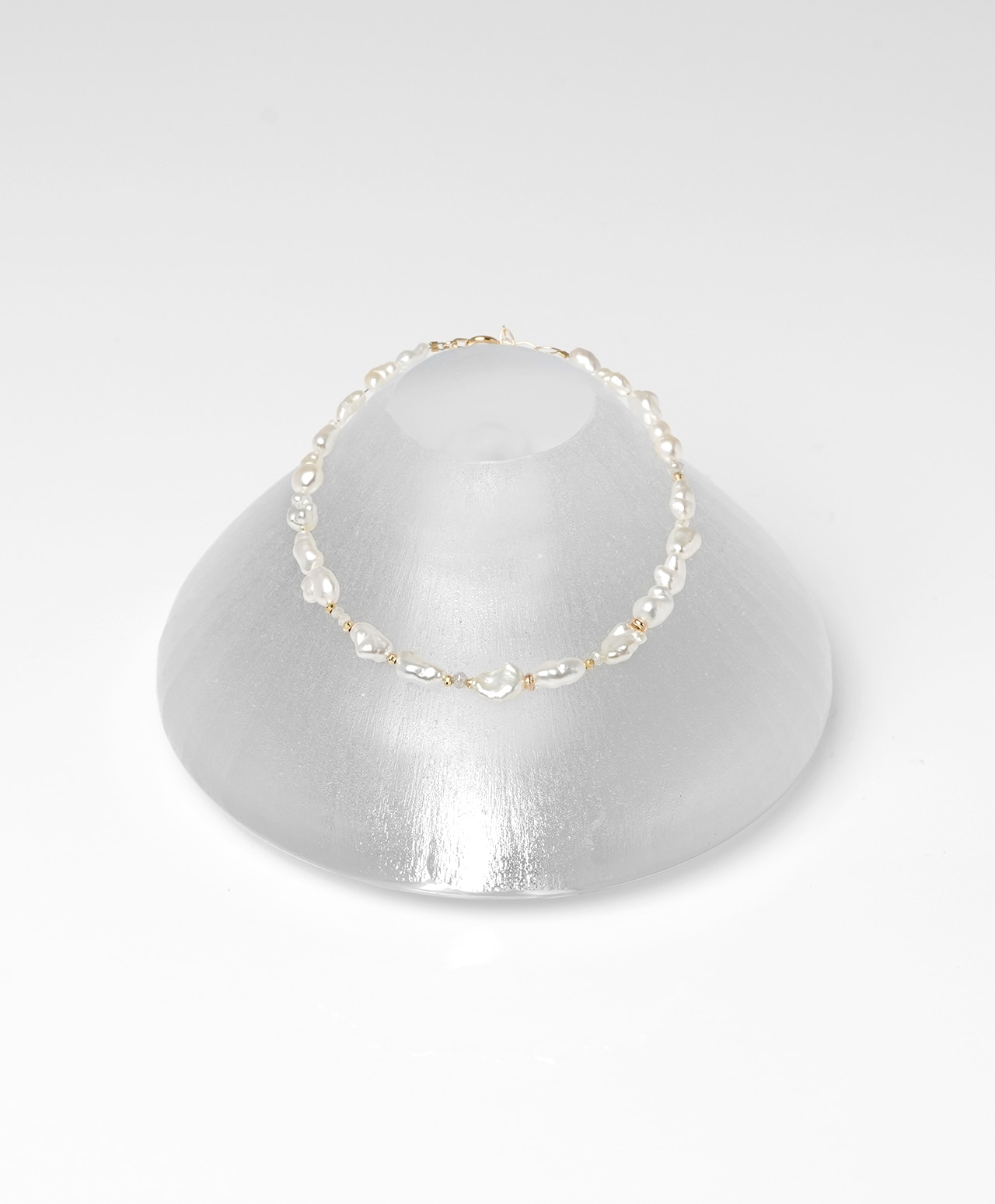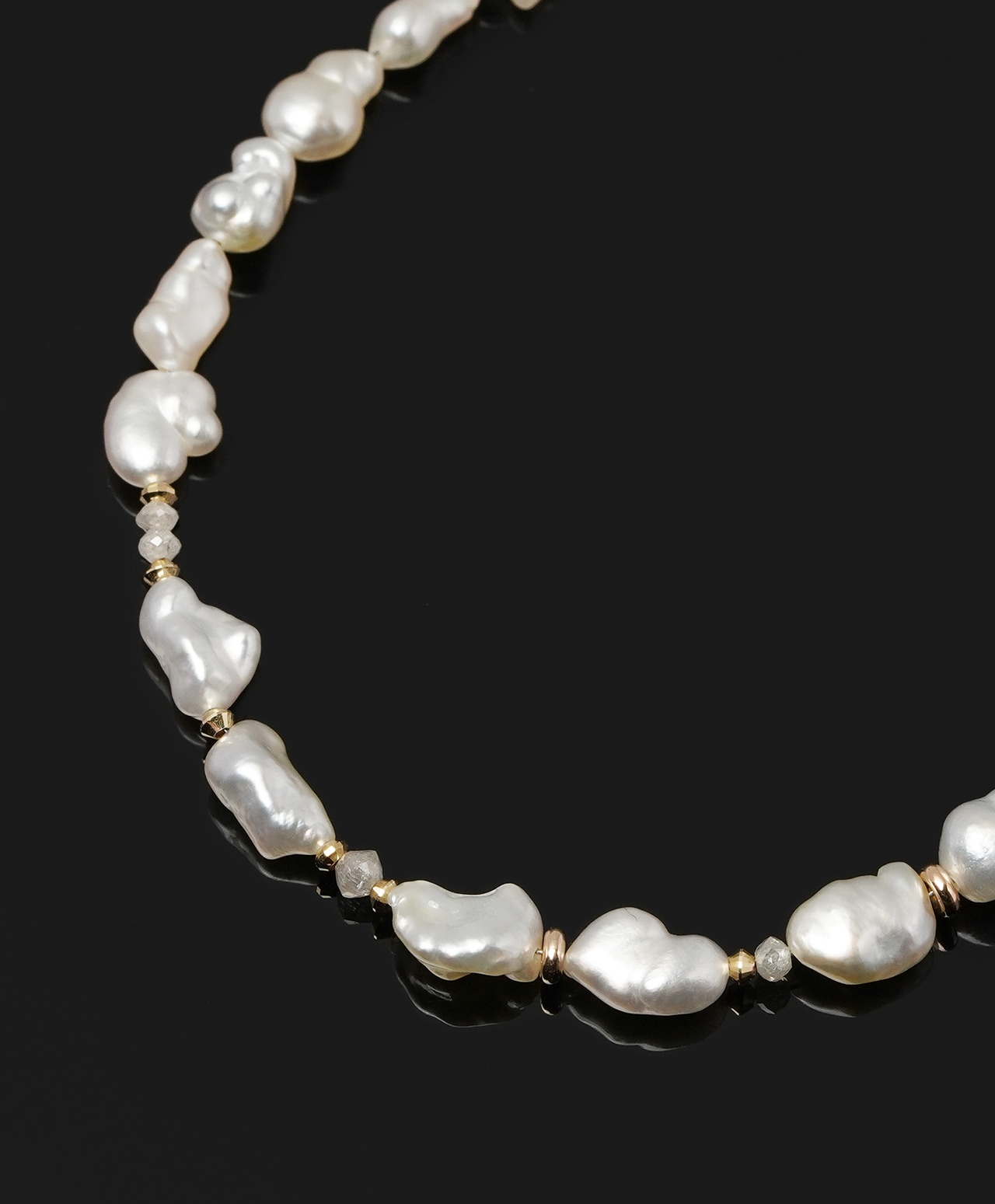不規則なフォルムのひとつひとつが個性的な真珠光沢を放ち、間にあしらわれたグレーダイヤモンドの控えめな煌めきが、白の純粋さを静かに引き立てています。