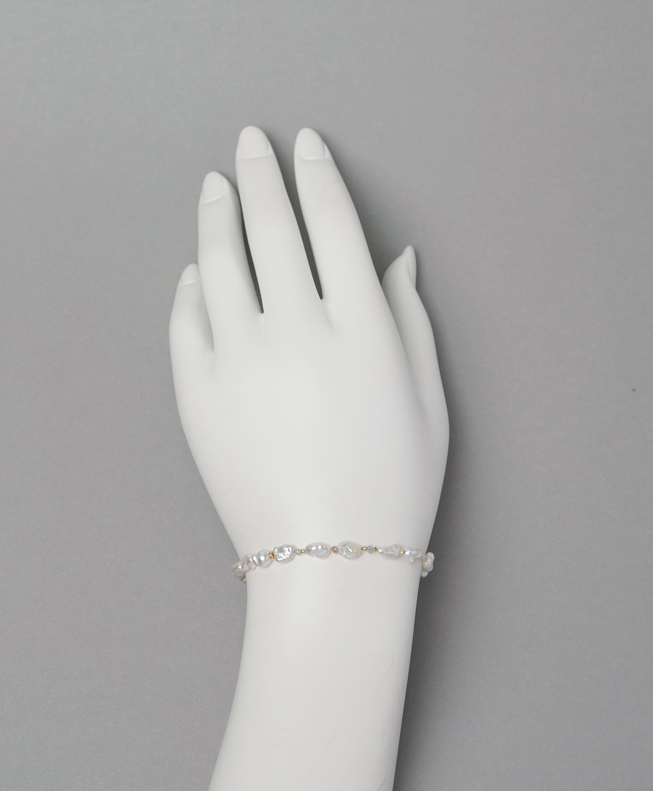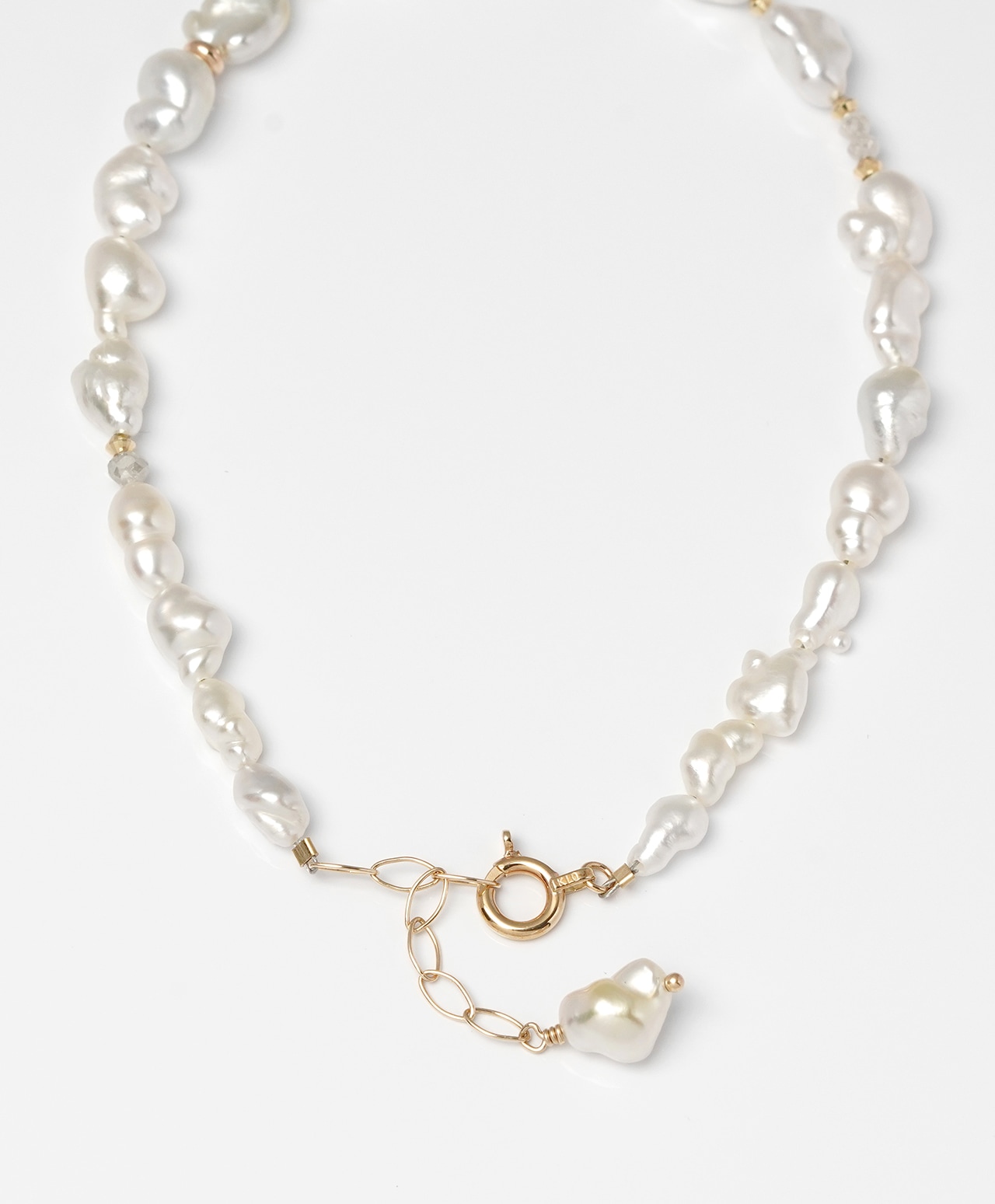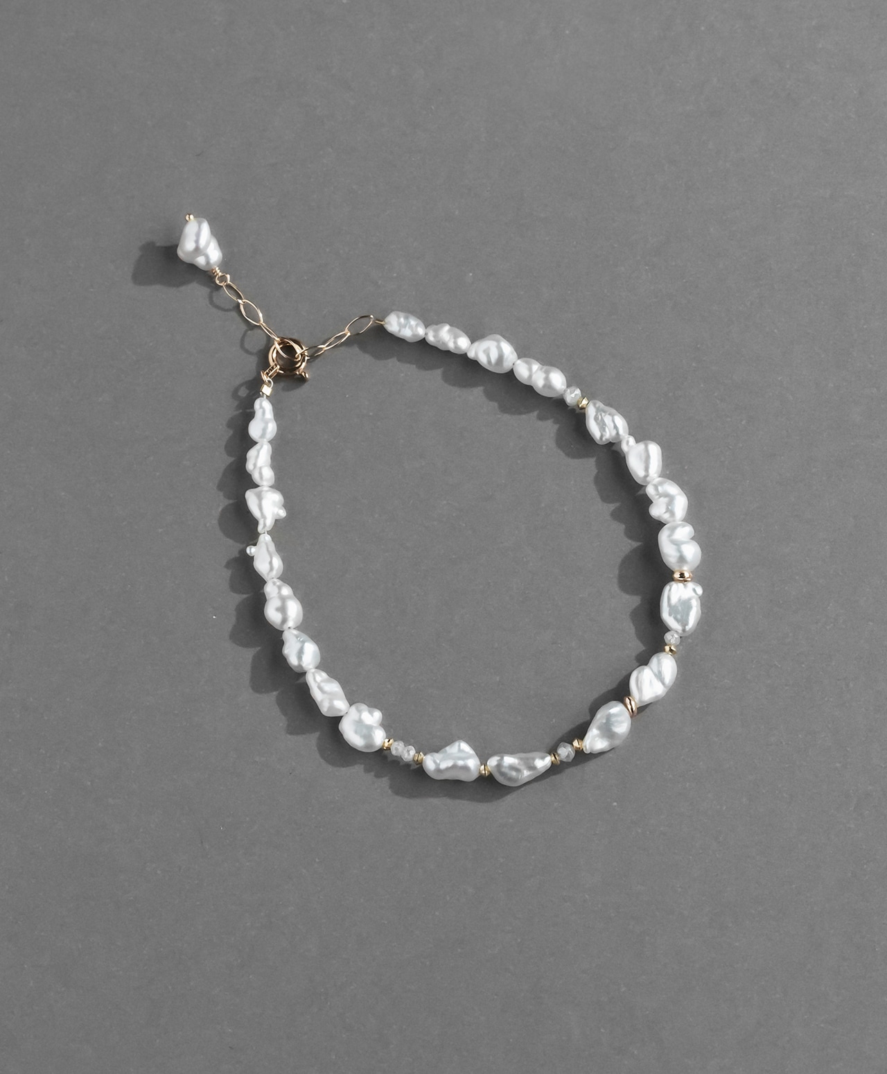 不規則なフォルムのひとつひとつが個性的な真珠光沢を放ち、間にあしらわれたグレーダイヤモンドの控えめな煌めきが、白の純粋さを静かに引き立てています。