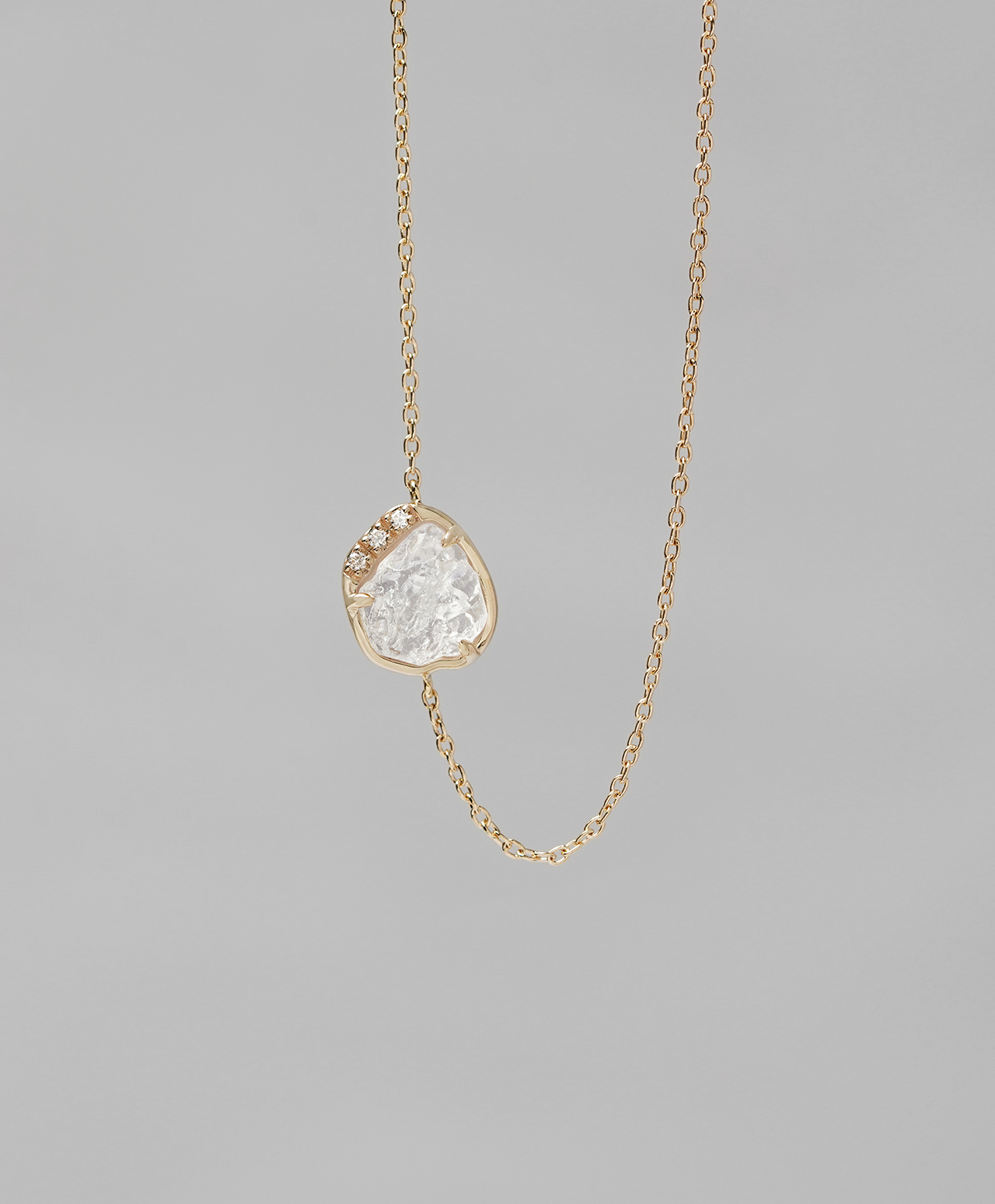 原石と馴染むよう、石座はあえてアシンメトリーに仕立てしました。石座にあしらわれた3石のダイヤモンド(クリア)が、フェナカイトの神秘性を一層引き立てる特別な逸品です。