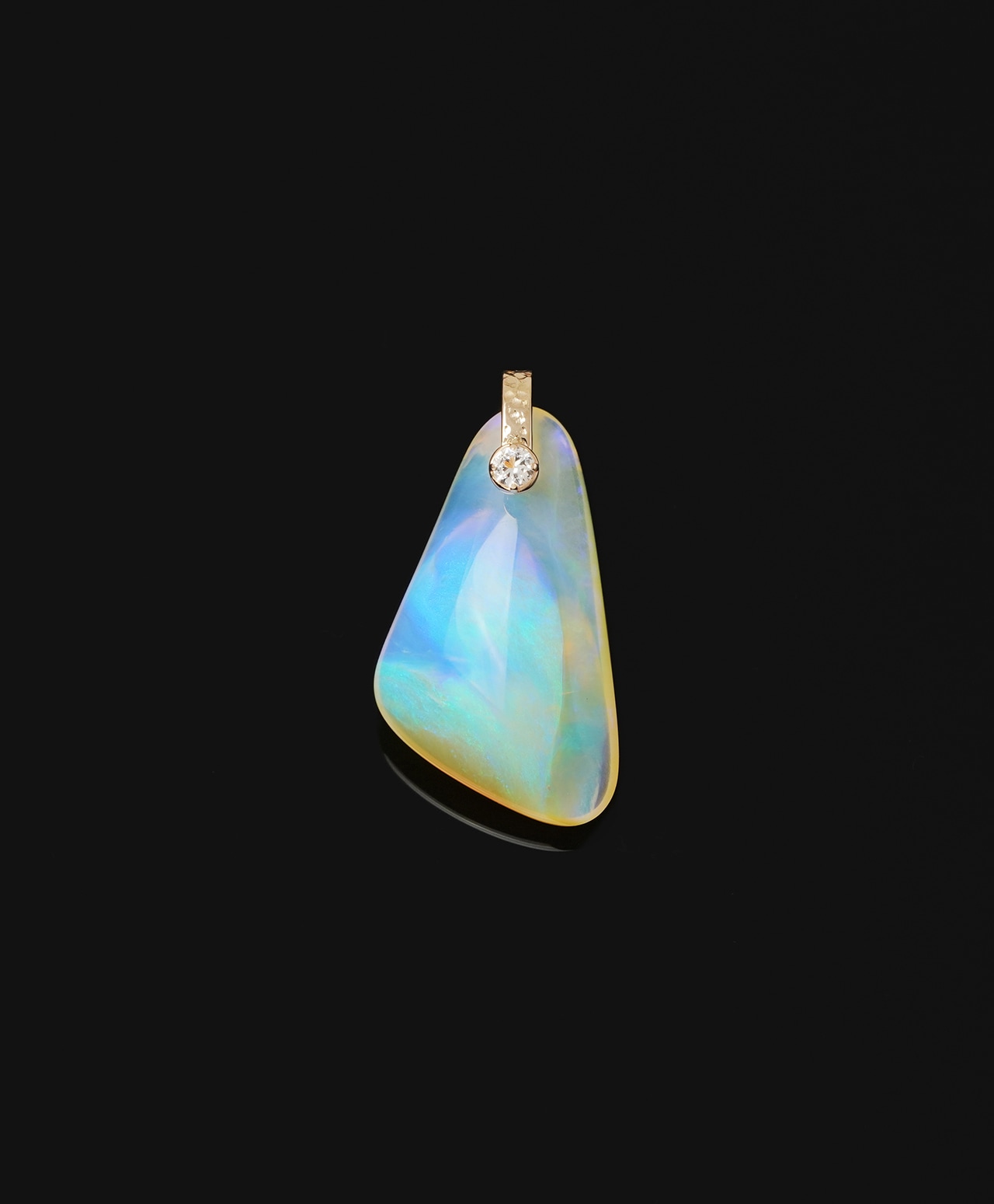 夜空を彩るオーロラを閉じ込めたような、幻想的な遊色効果を放つクリスタルオパール。透明感のある地色に、黄色、青、緑の光が角度によって神秘的に踊ります。