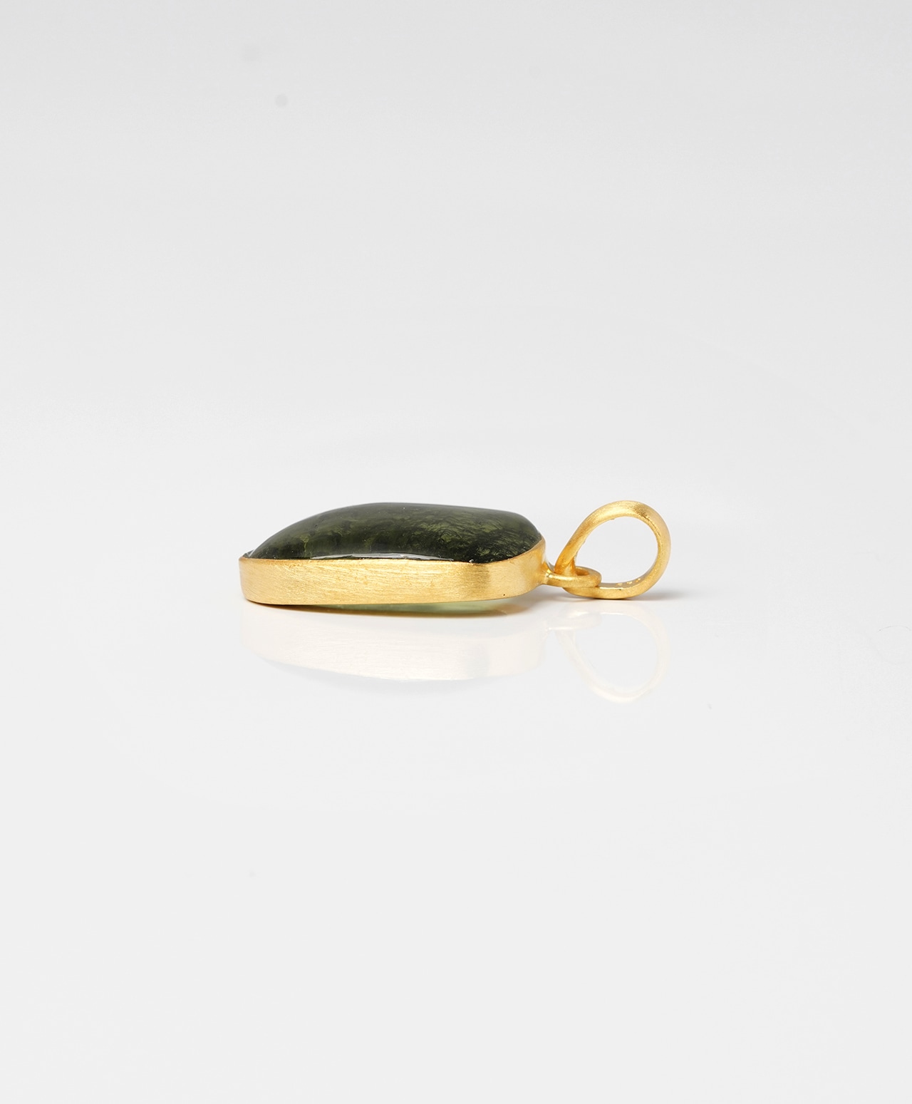 原石の状態では、まるで針葉樹の広がる大地が隆起したような力強い外見をしていますが、研磨すると透明度の高いミステリアスな深緑色が輝き出します。