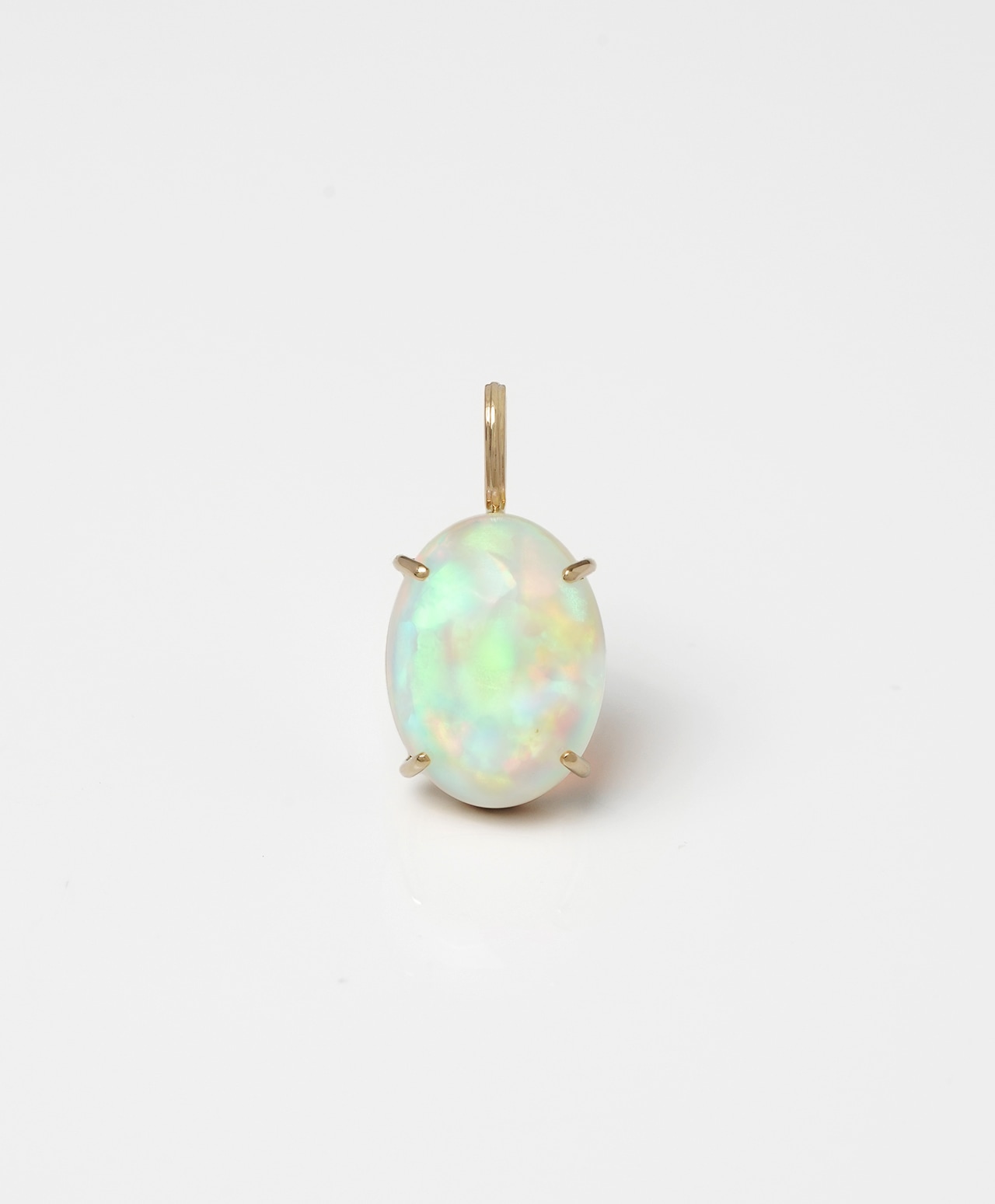 乳白の地色に多彩な遊色が踊るストーン。光を受けるたびにグリーンやイエロー、オレンジの鮮やかな色彩が浮かび上がります。