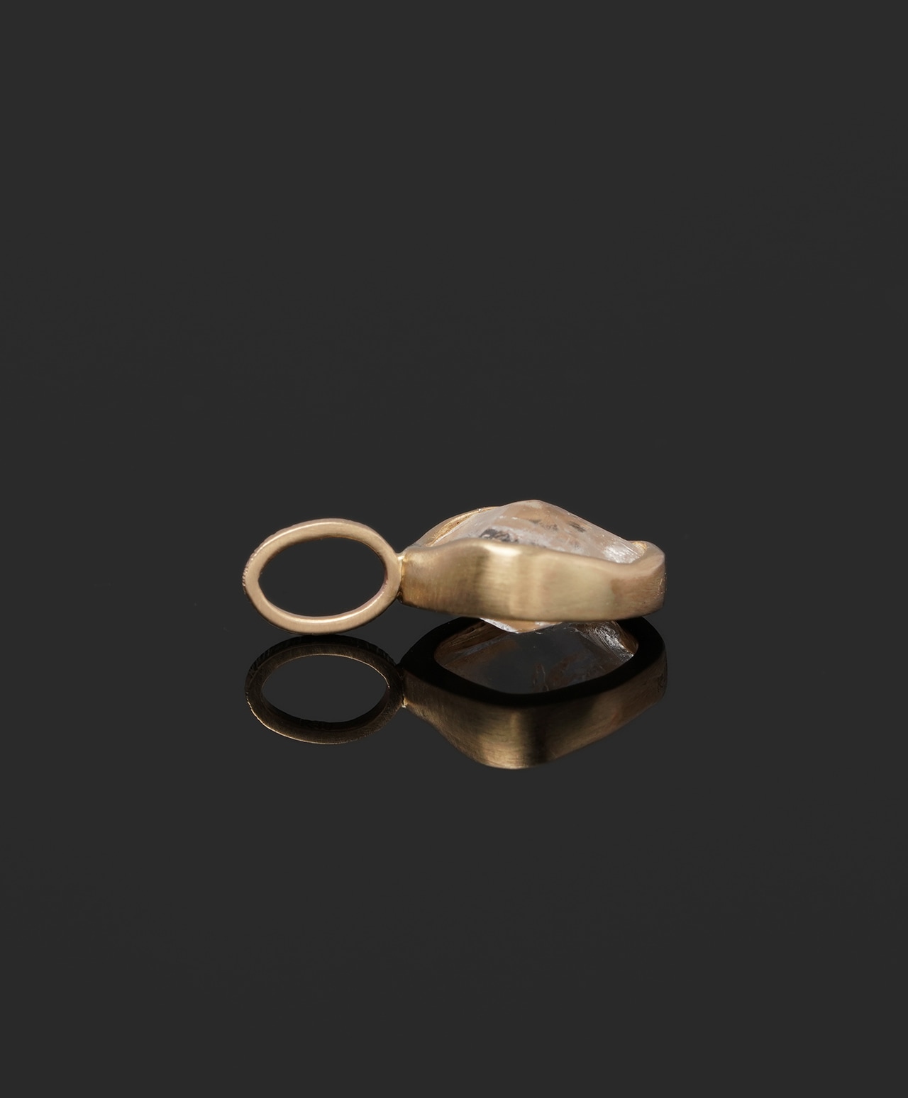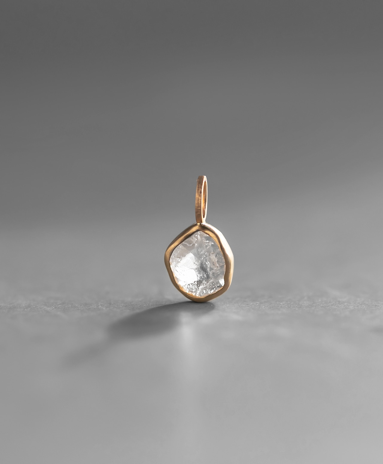 荒削りにも思えるプリミティブなフォルムが、この石の唯一無二の表情となり、光を通すたびに透明感の美しさを際立たせます。