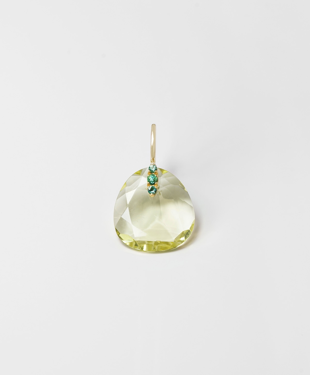 レモン果汁を思わせる透明感溢れるレモンクォーツ。柔らかなシルエットとバチカンに連なる鮮やかな緑のエメラルドが、まるでレモンと若葉のような愛らしさで胸元を彩ります。
