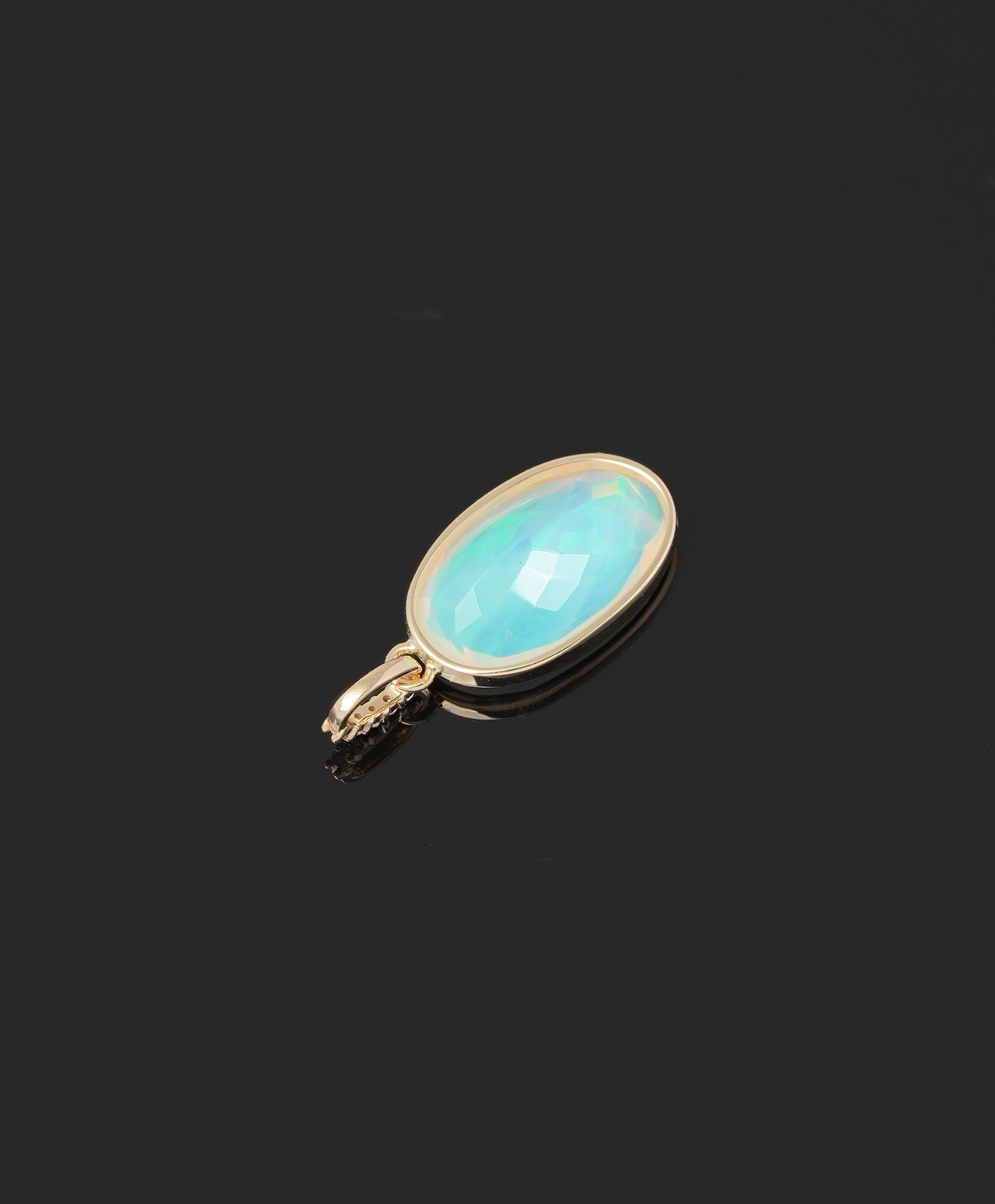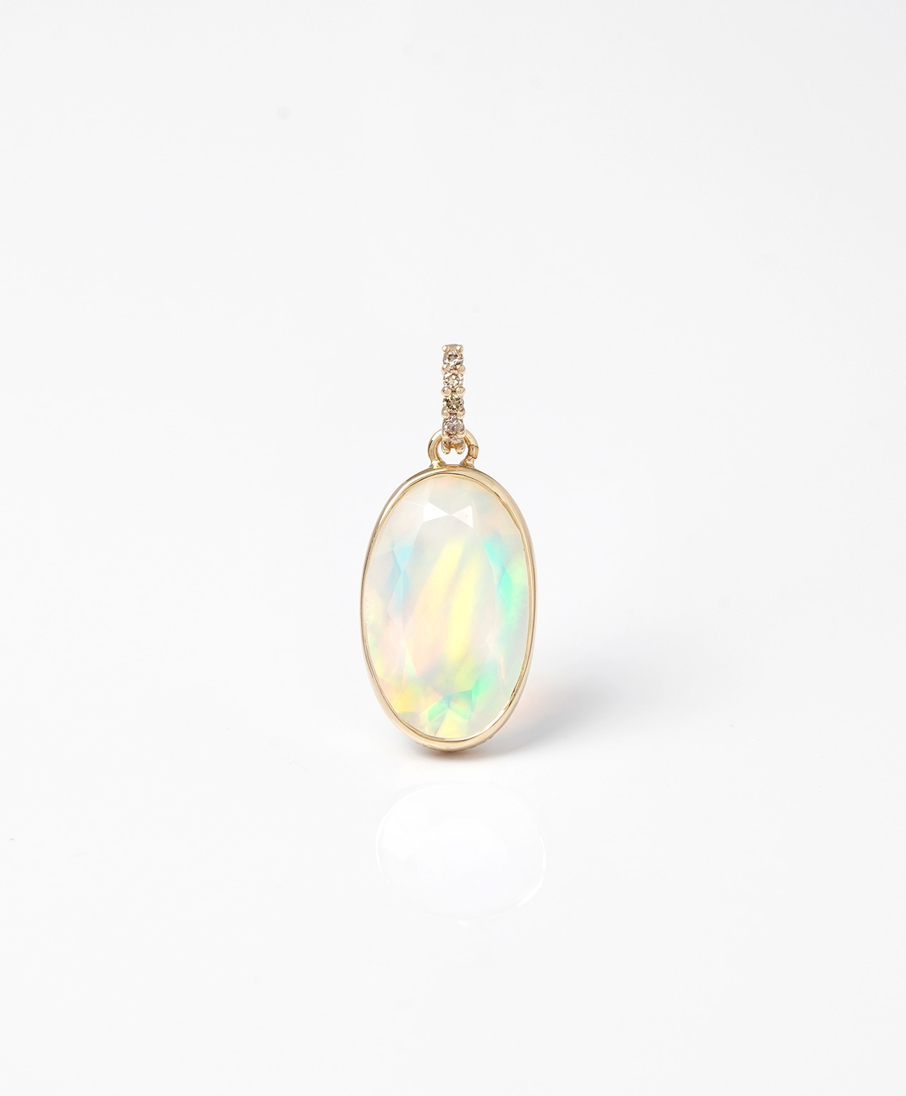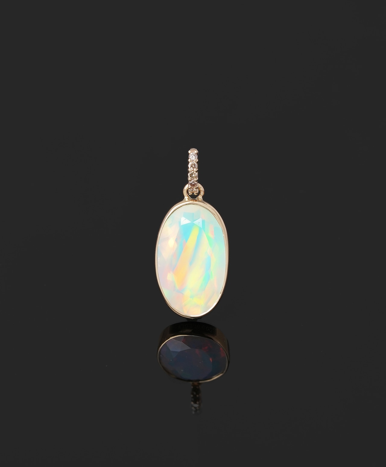 乳白色の地色に青、黄、オレンジ、ピンクの遊色効果が神秘的に揺らめくウォーターオパール。バチカンに散りばめられたブラウンダイヤモンドの温かな輝きが、幻想的な美しさに洗練されたアクセントを添えています。