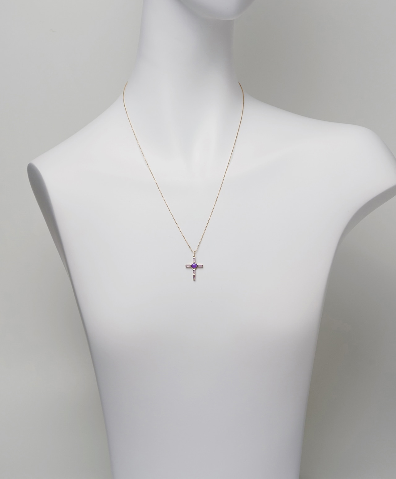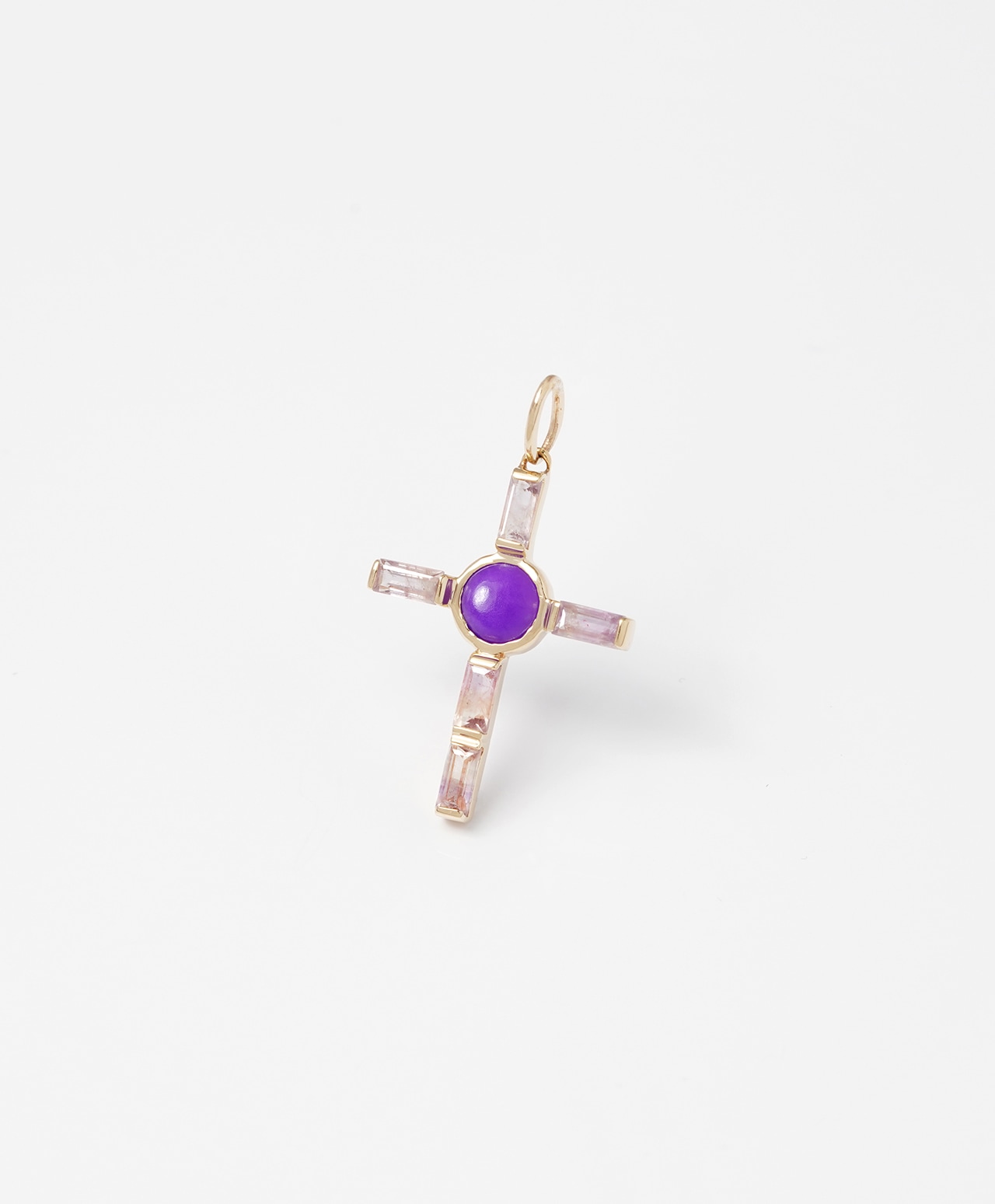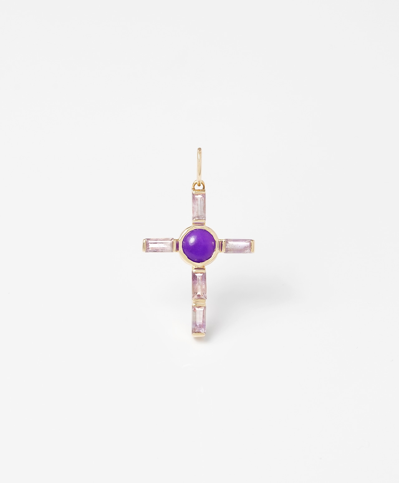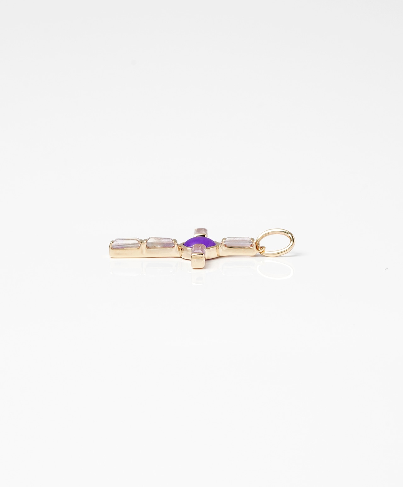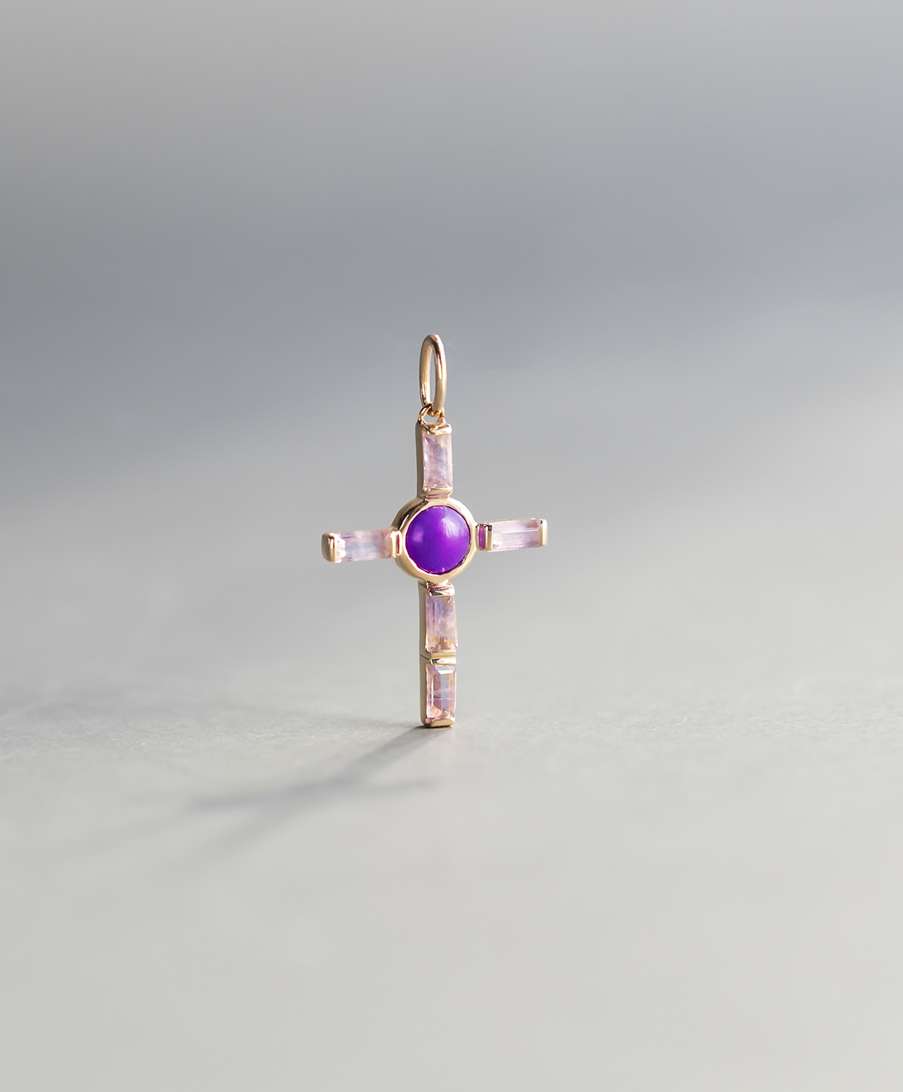 十字架の中心には、深く濃密な紫色のスギライトが静かな存在感を放ち、その周囲を淡く透明感のあるオーラライトがやさしく包み込んでいます。