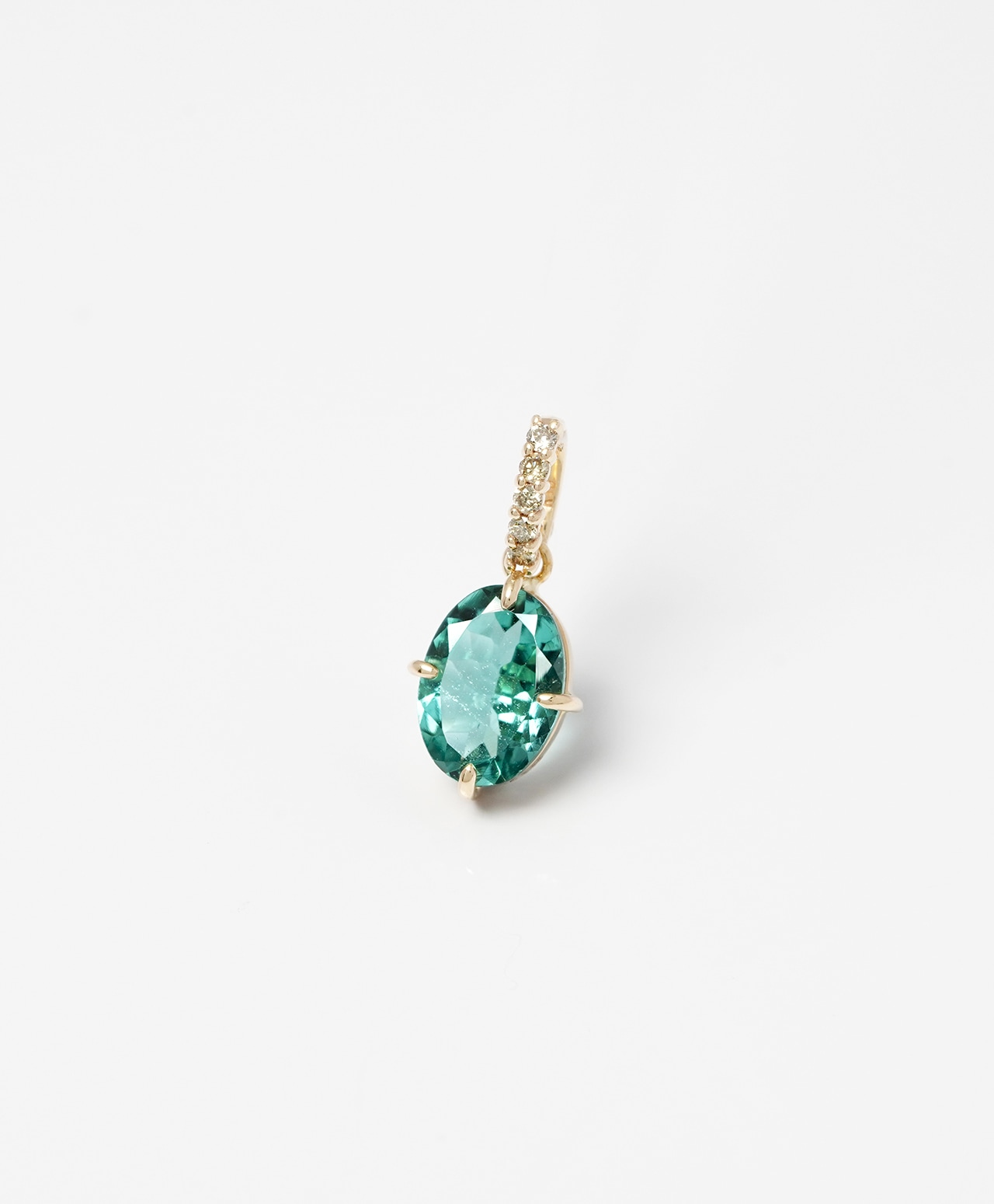 深い森の湖底を思わせる、神秘的なブルーグリーンのトルマリン。高い透明度が生み出す澄んだ輝きと、カットが放つ鮮やかな煌めきが美しく、ゴールドのバチカンにはブラウンダイヤモンドが洗練されたアクセントを添えています。