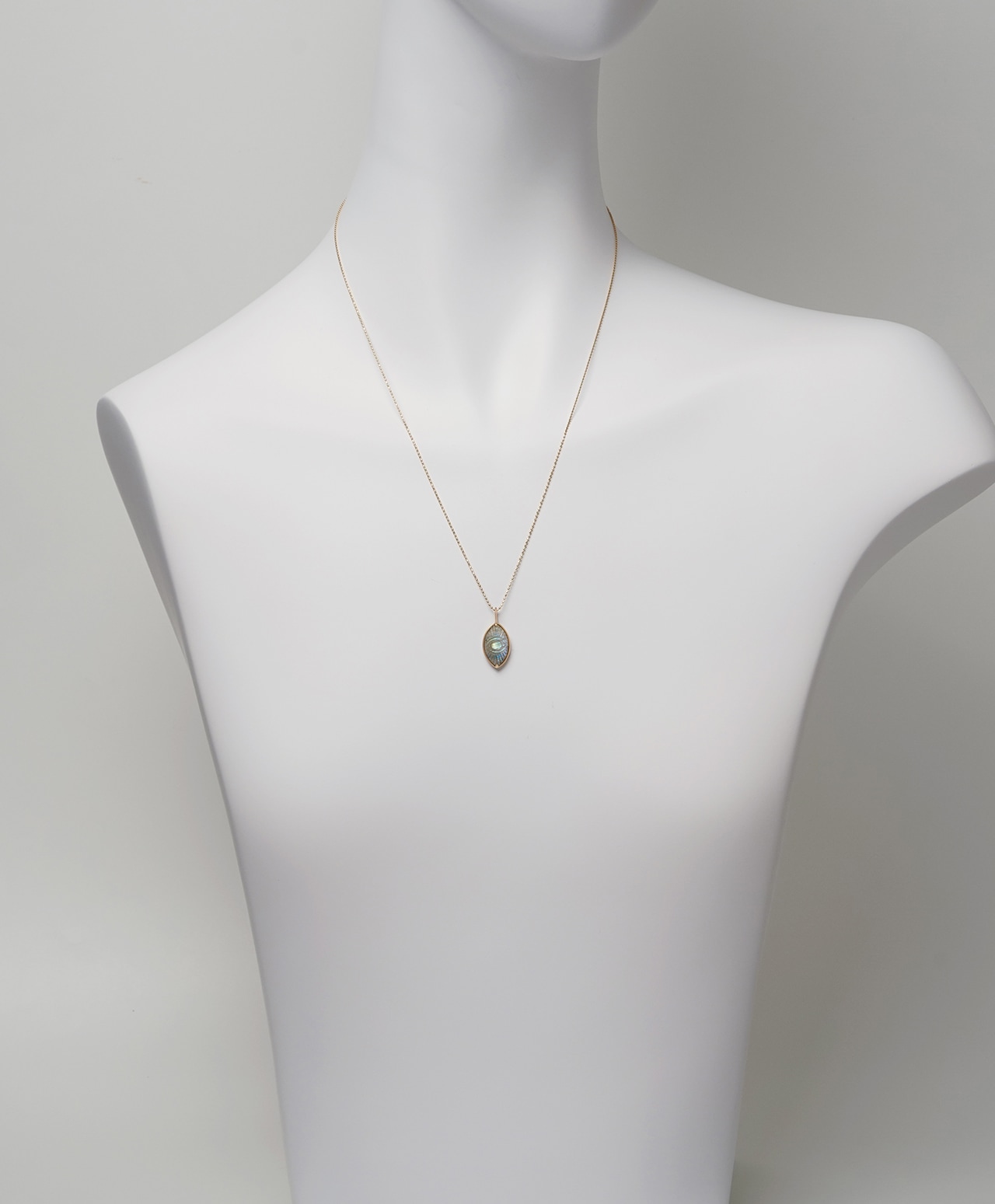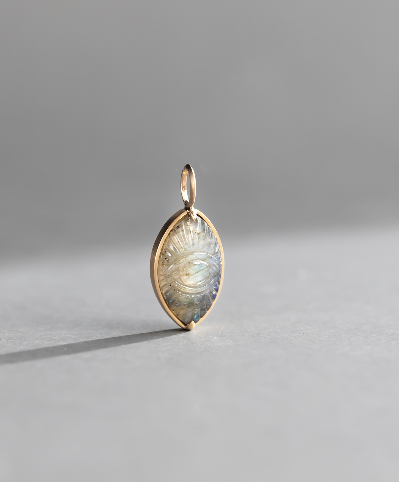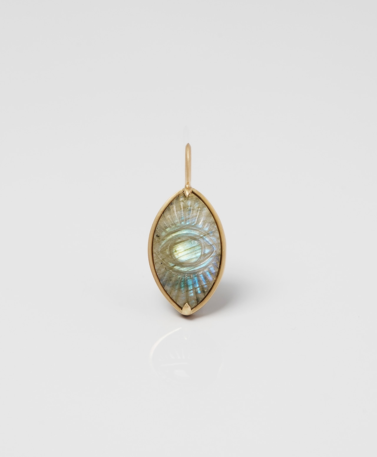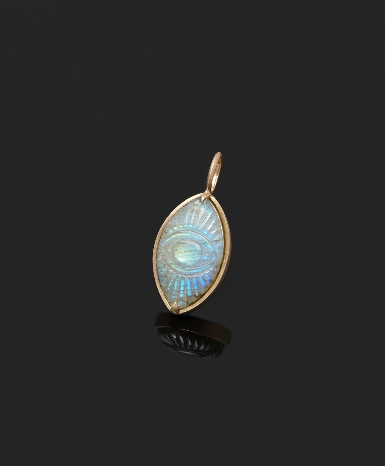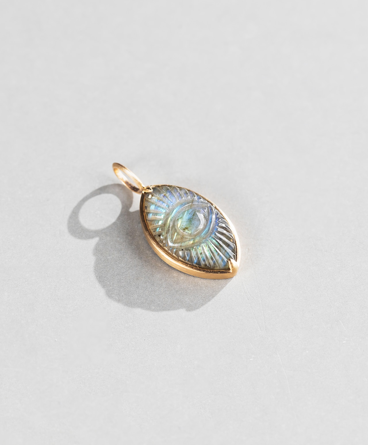 真実を見抜く瞳が刻まれた楕円の中心から、青いシラーが放射状に広がり、光の筋が浮かび上がる様子はまるで洞察の光が静かに放たれているよう。守護と叡智を宿す特別な眼差しを纏う、神聖な美しさを秘めています。