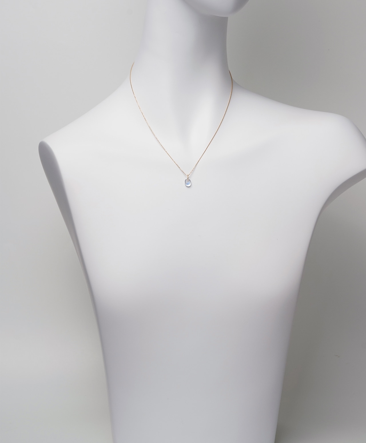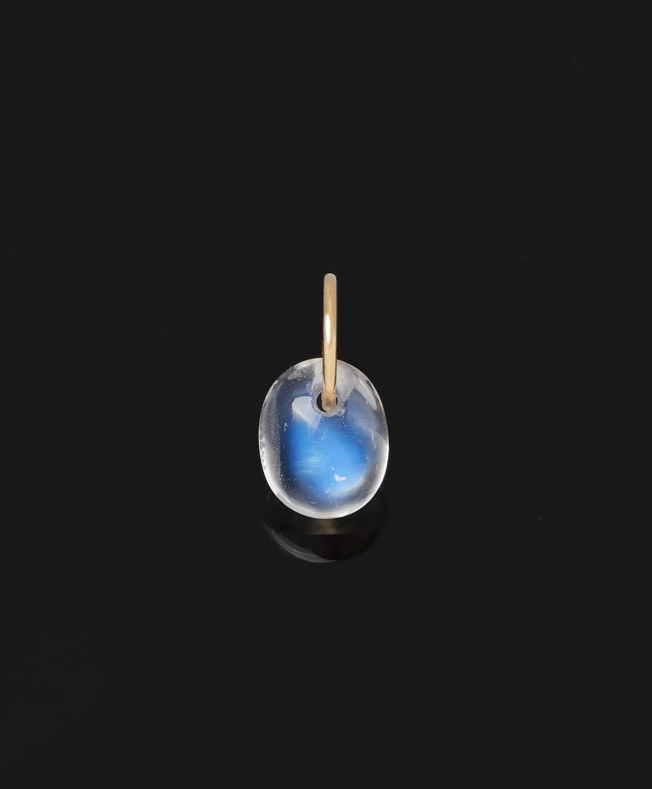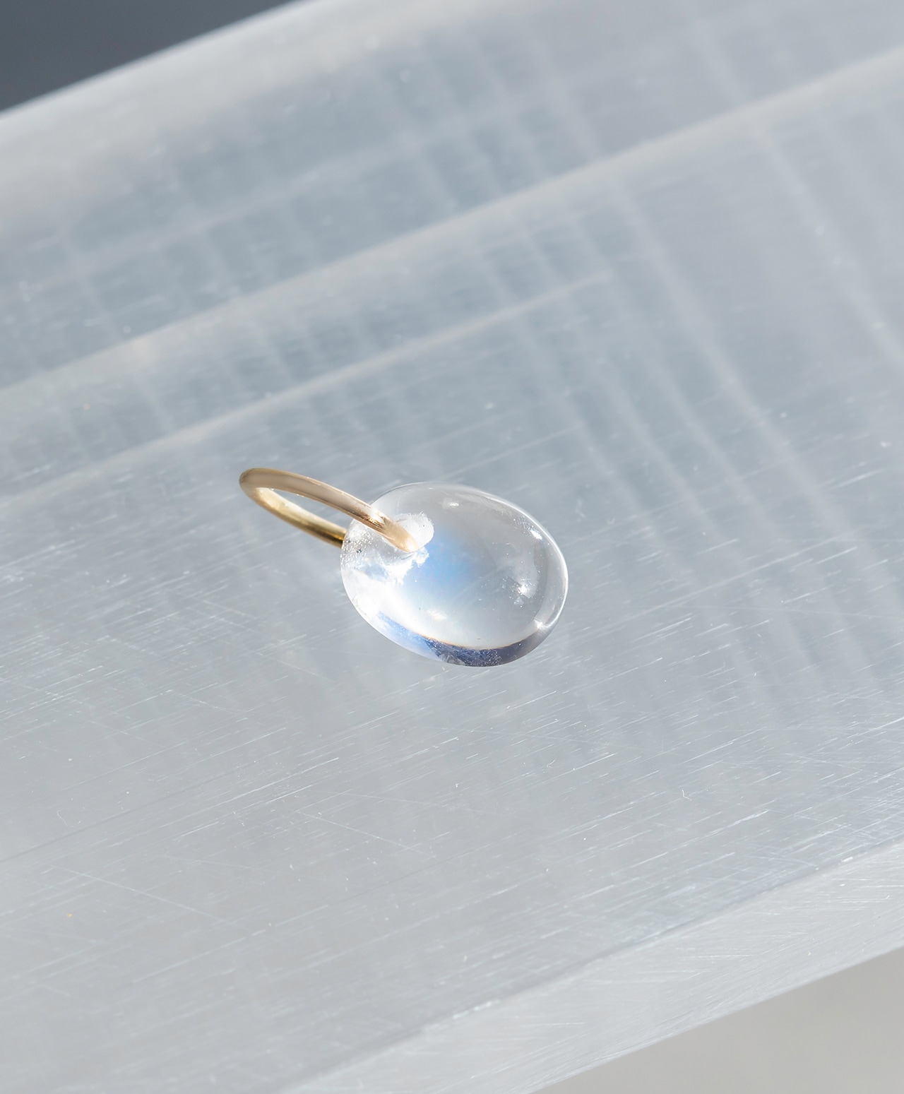 月明かりに照らされた静かな水面を思わせる、乳白色の透明感を湛えたレインボームーンストーン。その中心には、神秘的なブルーのシラーが浮かび上がり、光の角度によって幻想的に揺らめきます。
