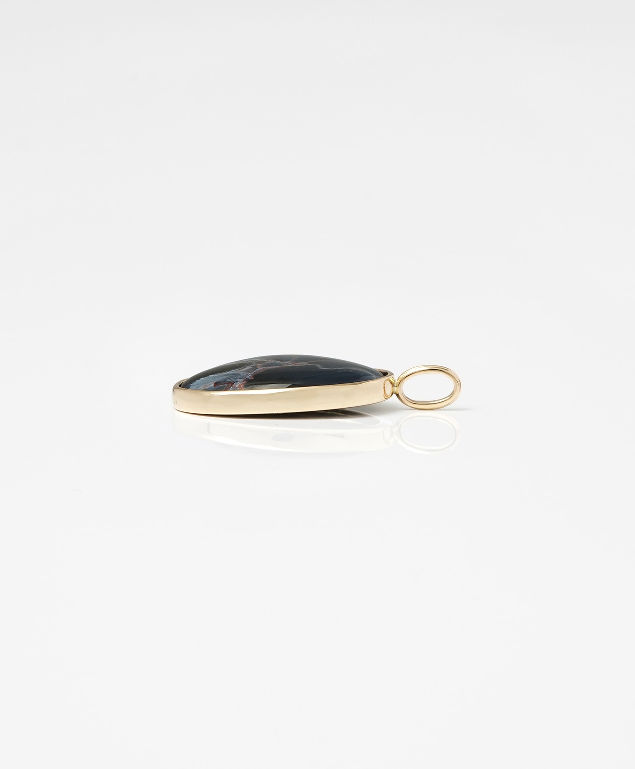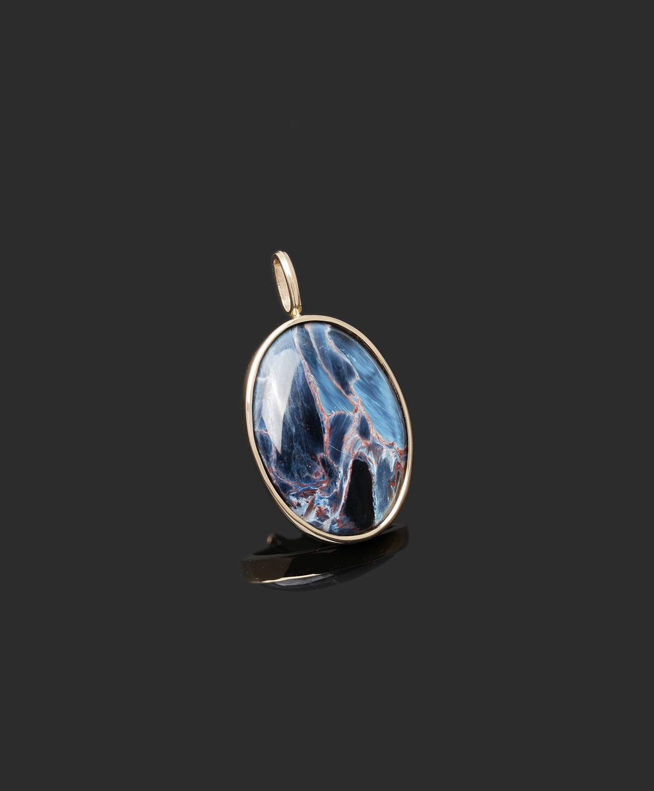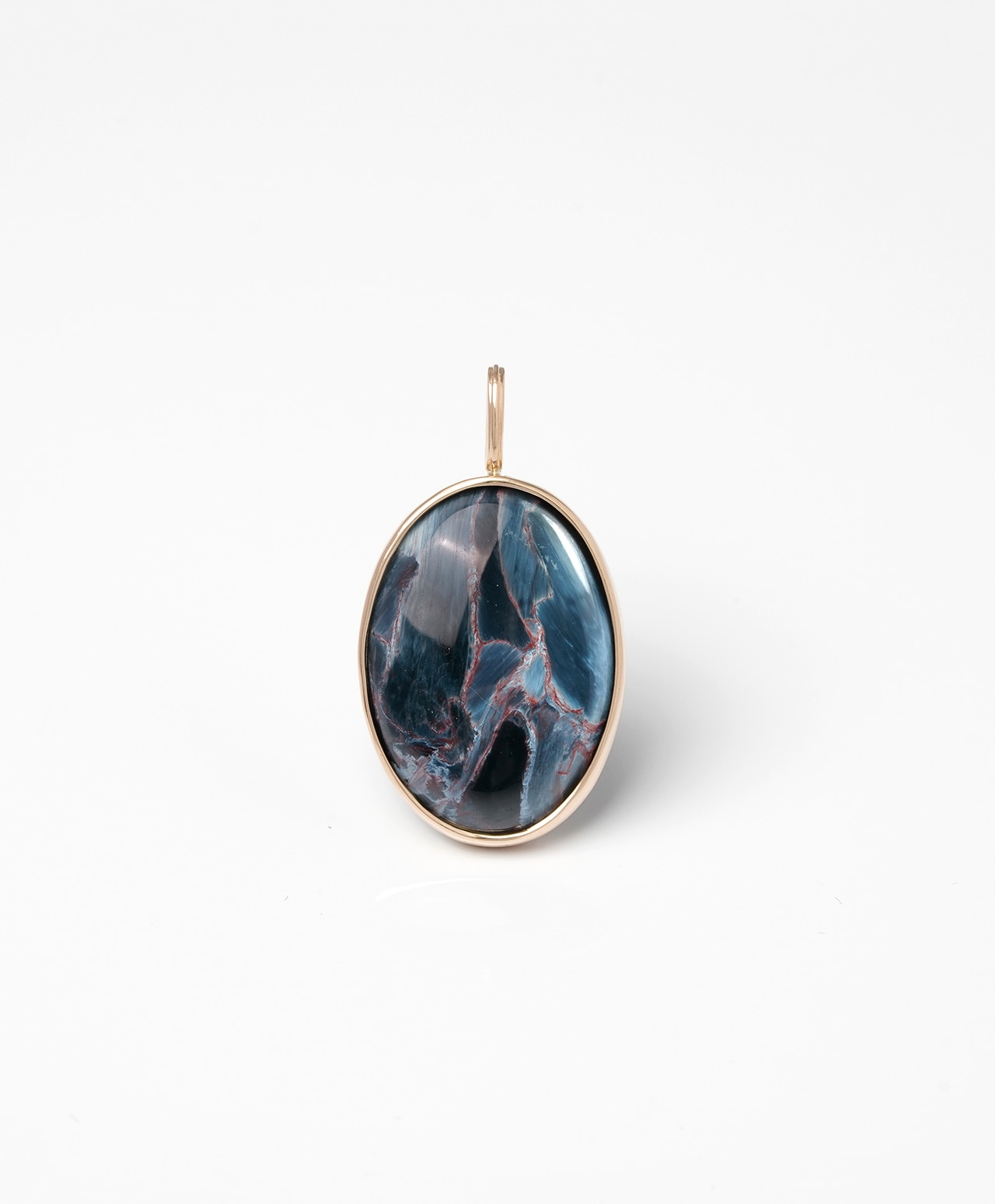 こちらはブルーの濃淡が美しい地色に、赤いインクルージョンが個性的な模様を作り出した石です。