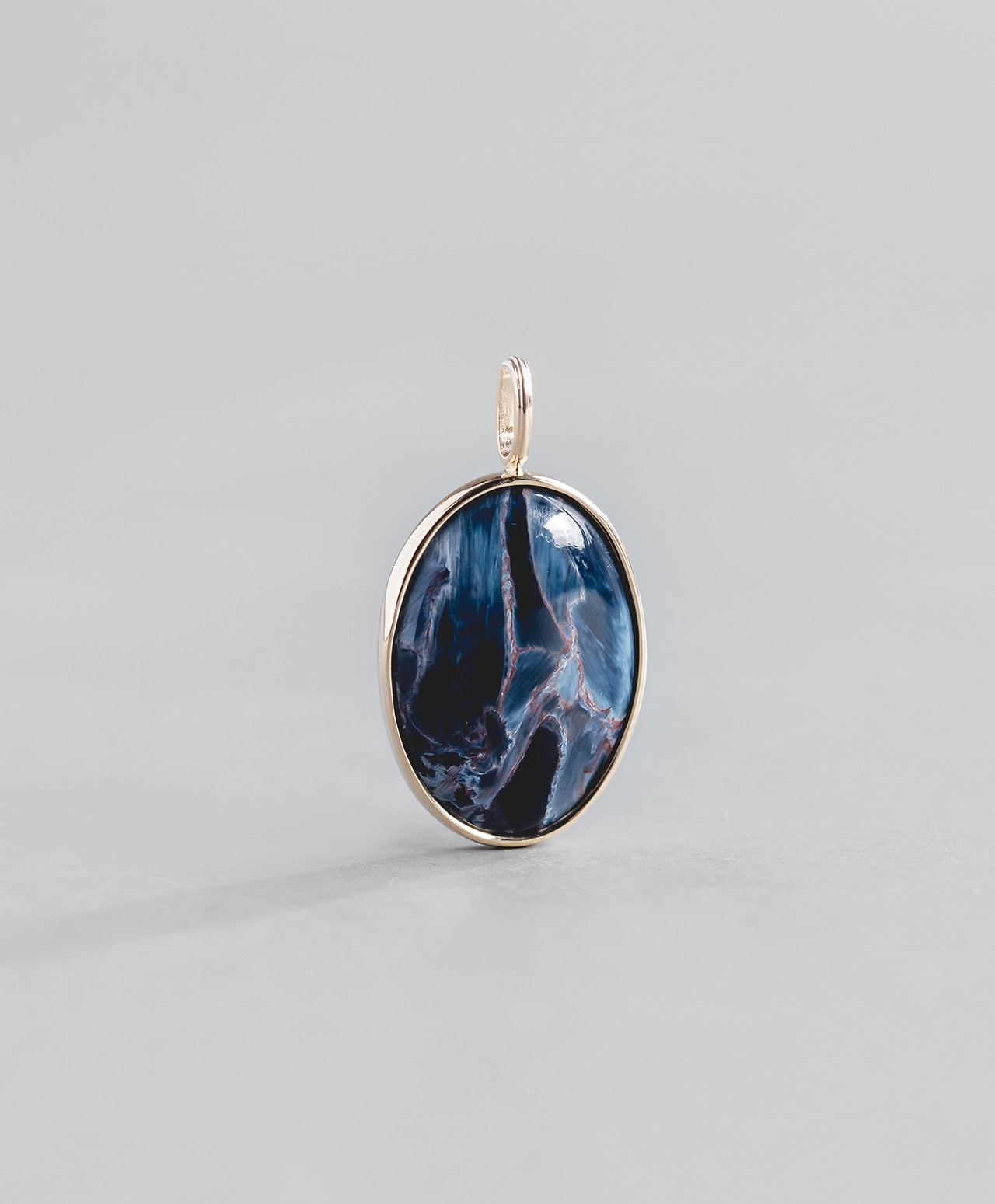 鉱物として見れば見た目はタイガーアイ(虎目石)と似ています。もともとはブルーカラーやイエローカラーのタイガーアイが、地殻変動により主成分である石英と混ざり合い硬化した結果、より複雑な模様を持つピーターサイトになるとされています。