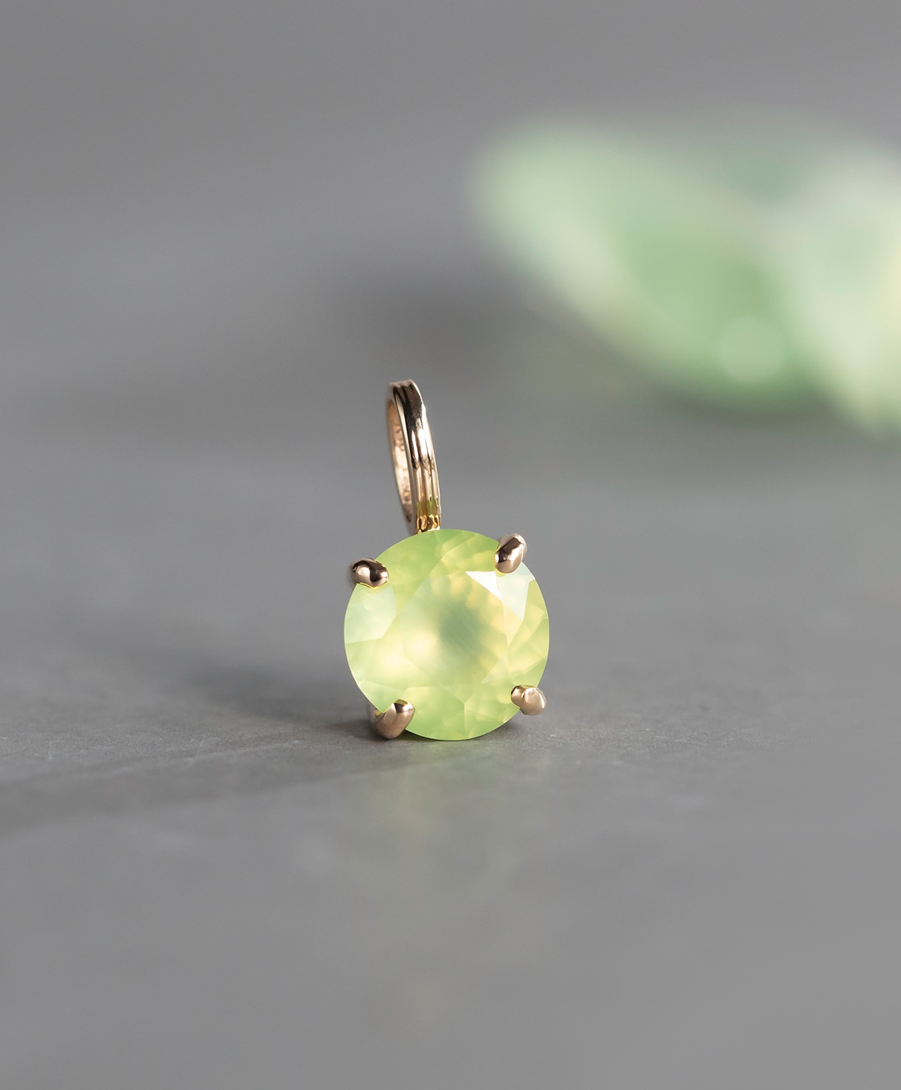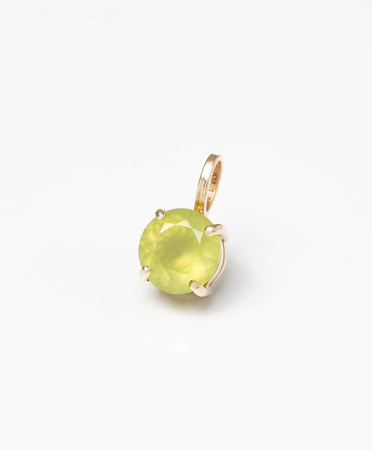 こちらは、若葉に朝露が宿ったような、みずみずしい黄緑色が目を引くアイドクレース。ラウンドカットが施された石の内側から柔らかな光が溢れ出し、マスカットの果実を思わせる爽やかな透明感を湛えています。