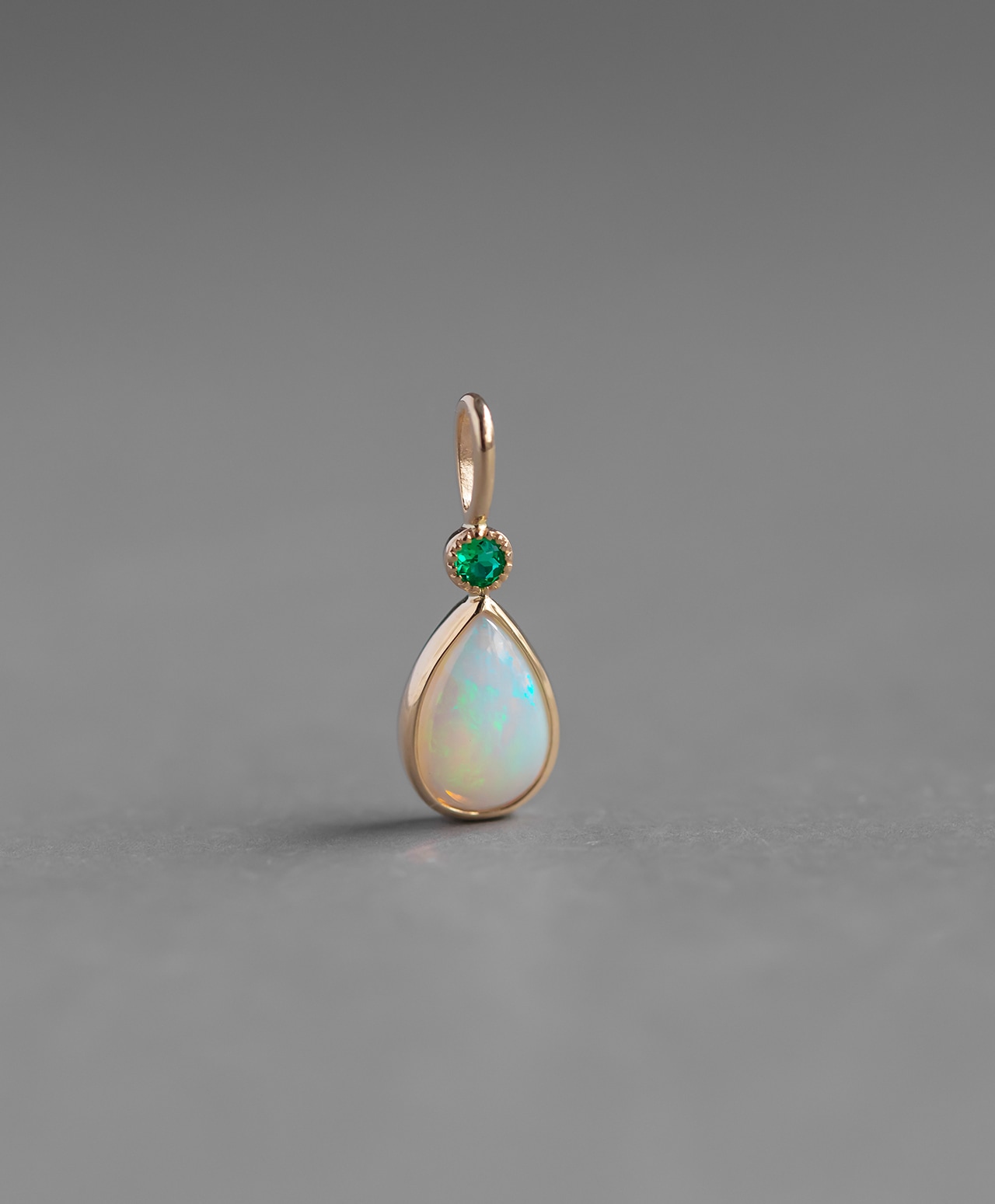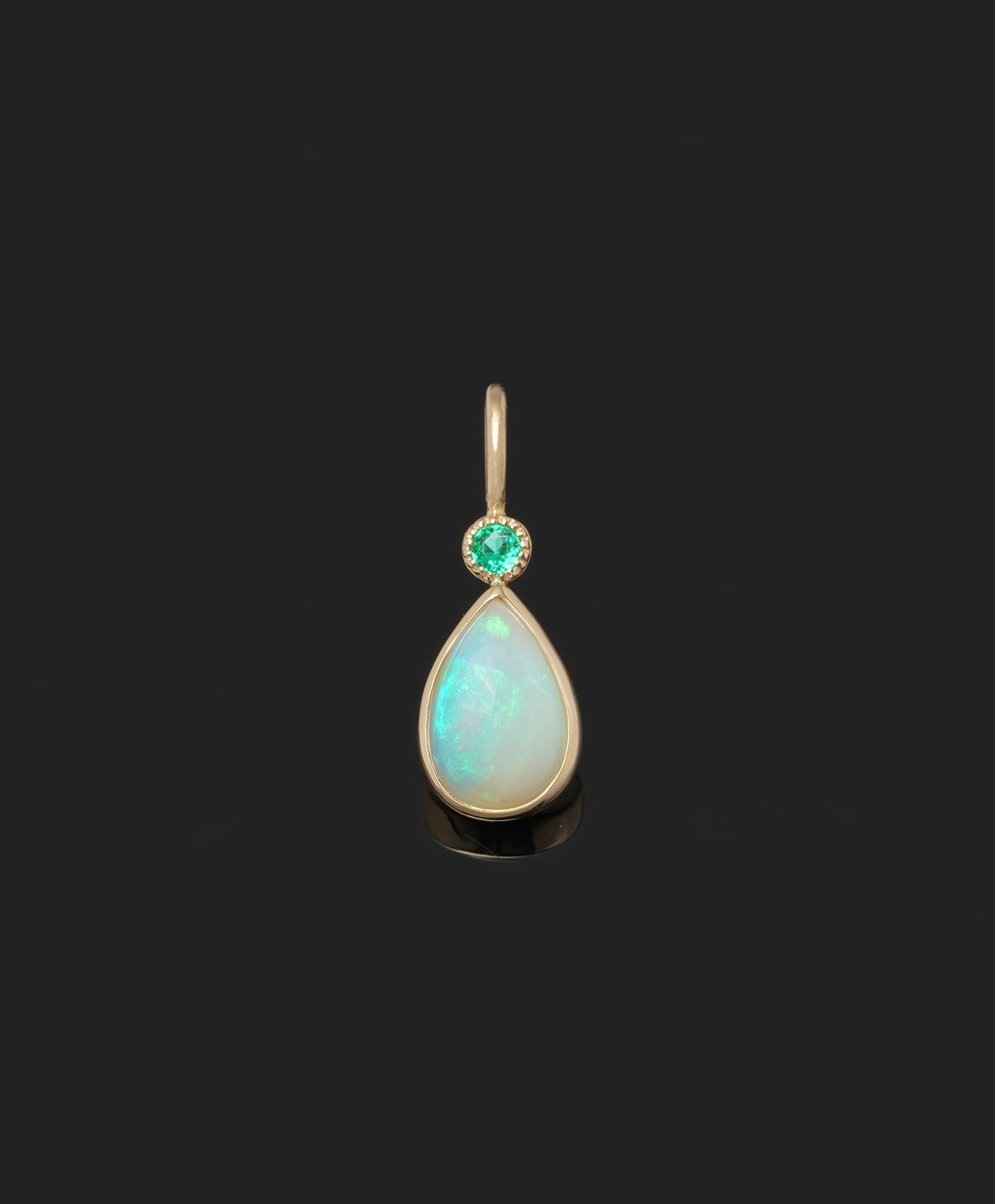 オーストラリア産クリスタルオパールとコロンビア産エメラルドを、1点もののチャームにしました。