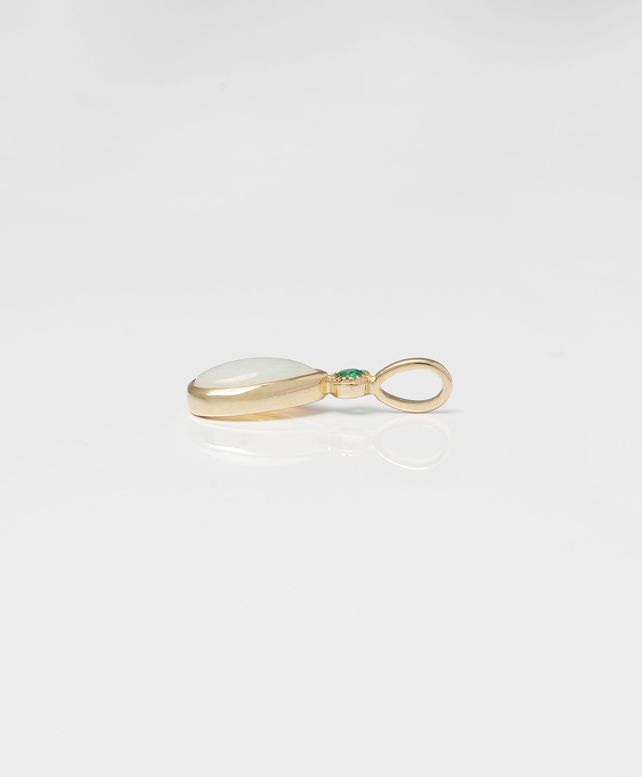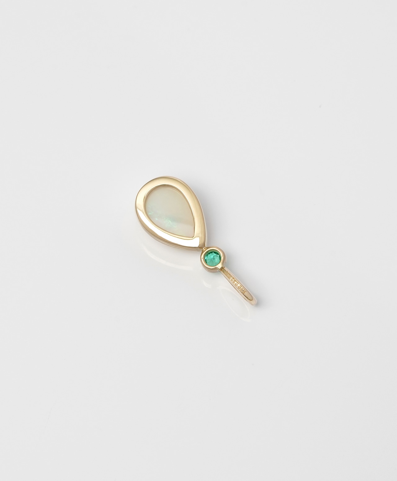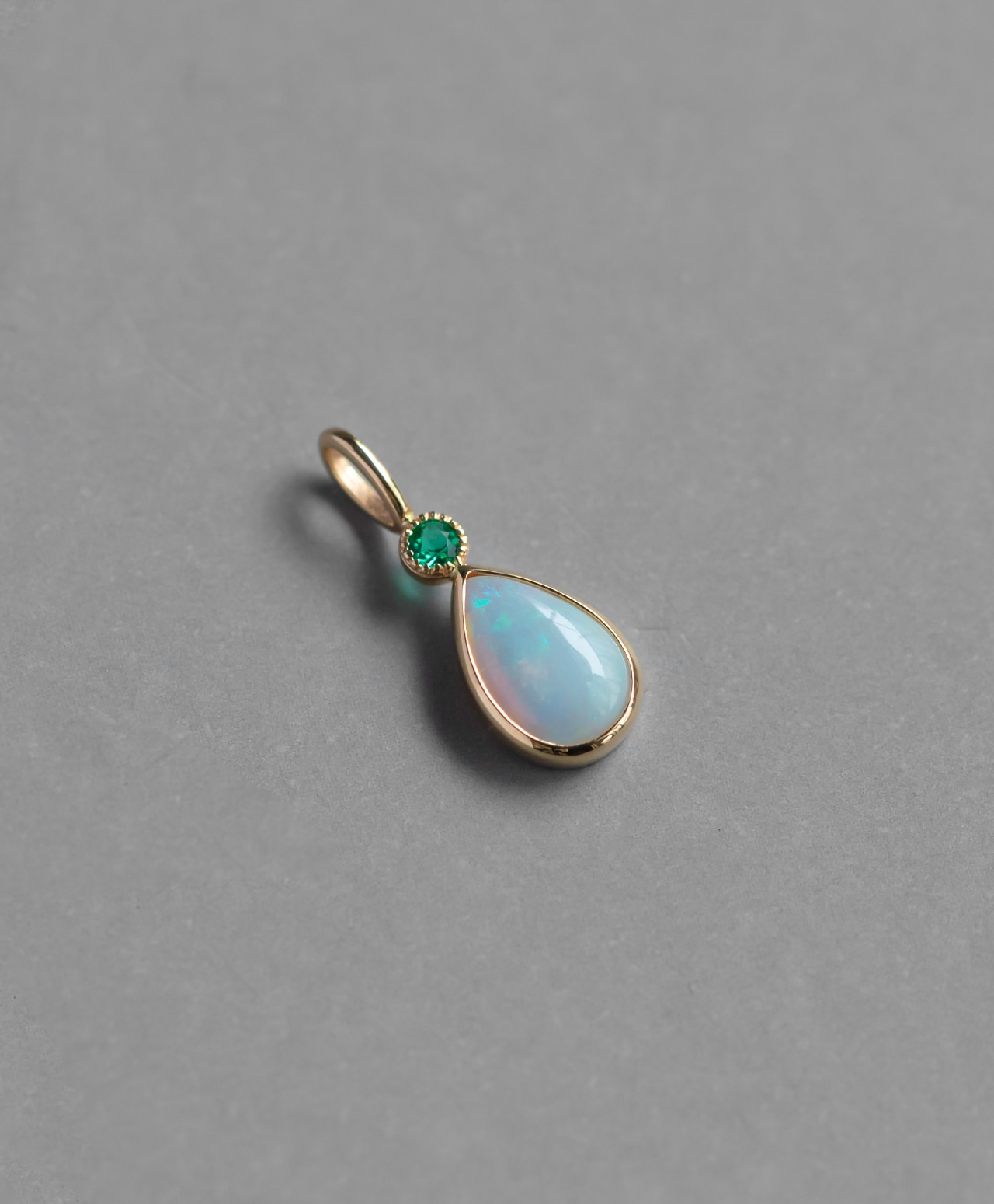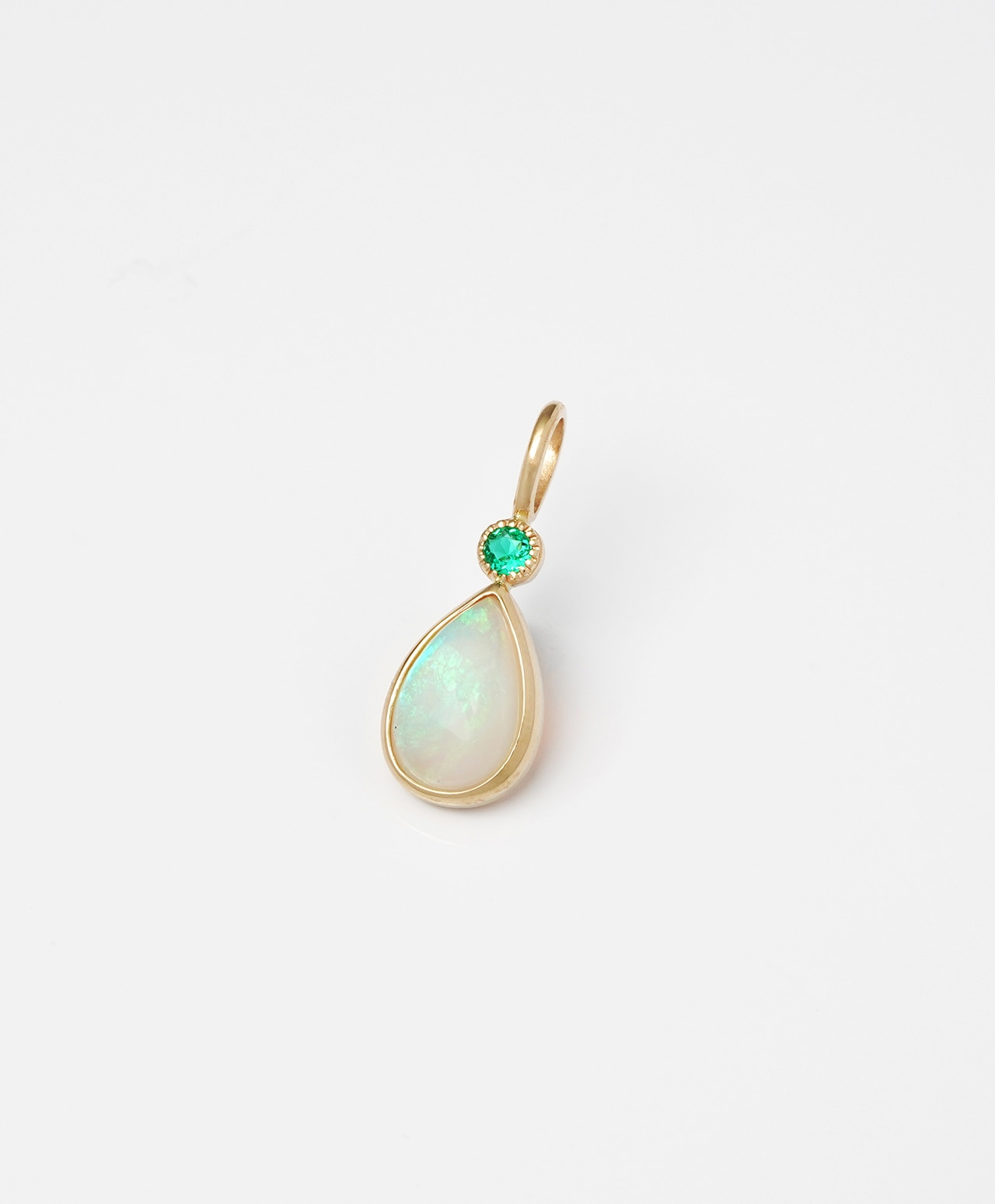 柔らかなミルク色の地色のなかに、ブルーやピンクの遊色が揺らめくクリスタルオパール。しずく型のシルエットをゴールドのベゼルが品よく縁取り、上部には森の緑を写したようなグリーンのエメラルドが、瑞々しい煌めきを添えています。