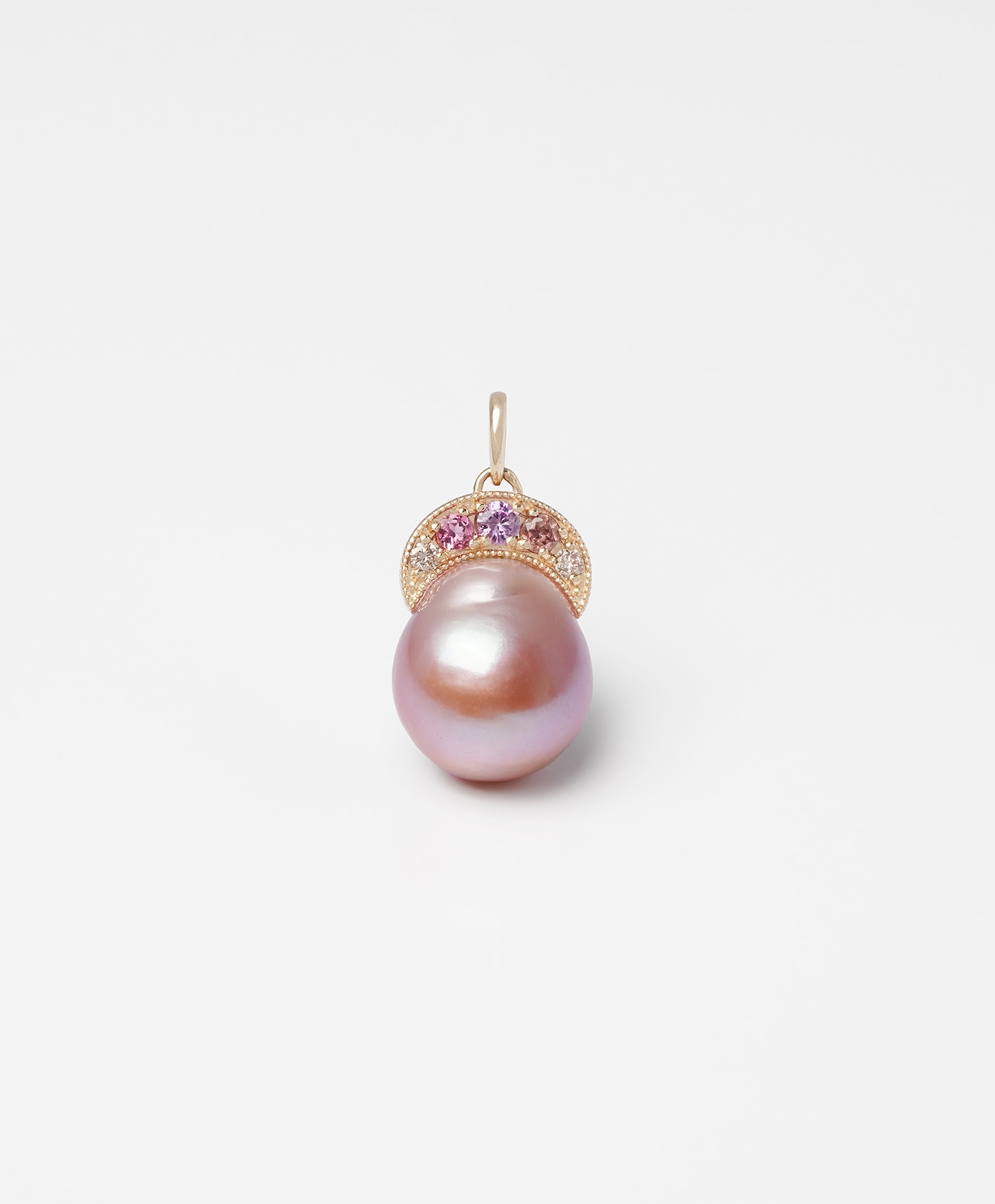 中国産の淡水ピンク真珠と、スリランカ産ピンクサファイア、カンボジア産ピンクジルコン、ナイジェリア産ピンクトルマリン、ピンクダイヤモンドを組み合わせて、1点もののチャームにしました。