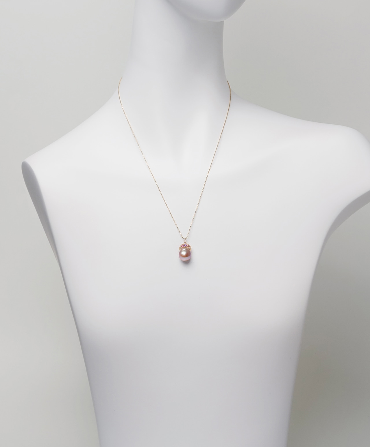 ゴールドのバチカンには、ピンクサファイア、ピンクトルマリン、ピンクジルコン、ピンクダイヤモンドが弧を描くように並び、真珠をやさしく戴冠するように彩っています。