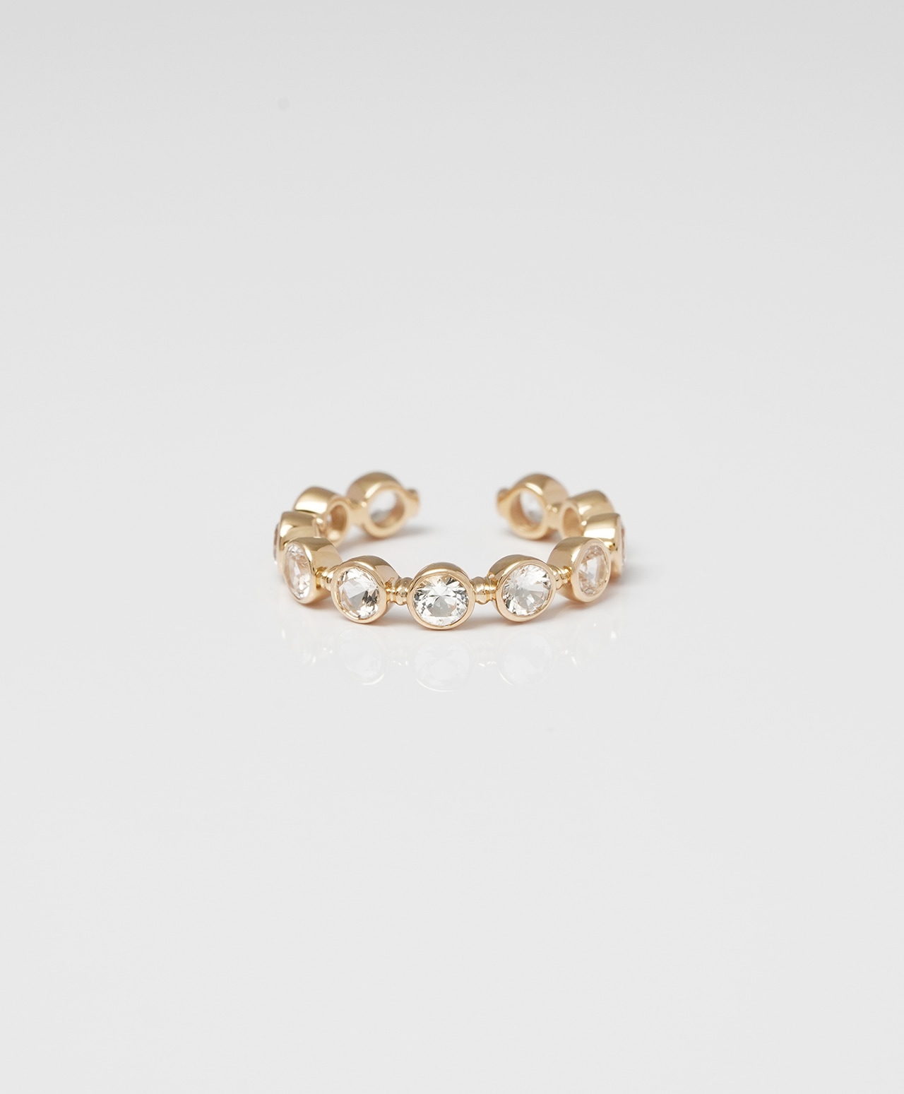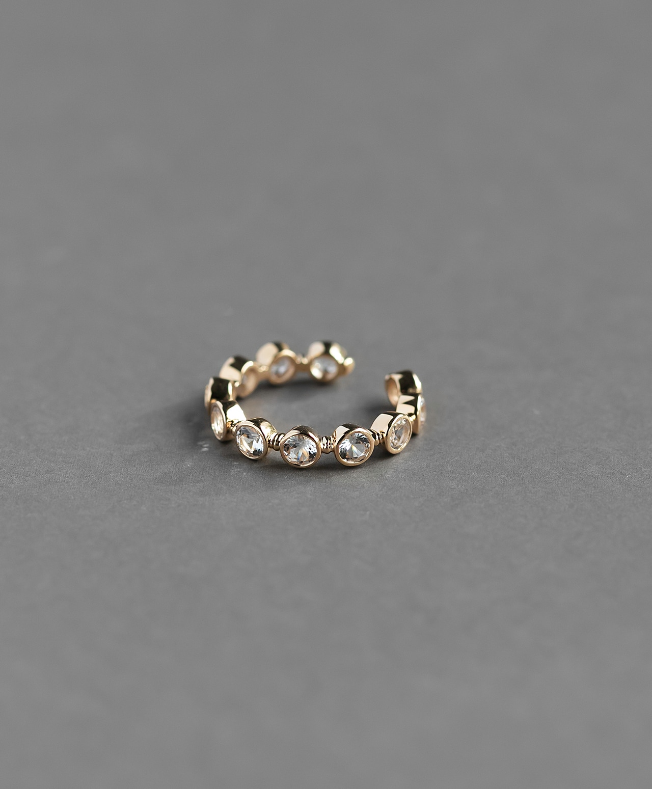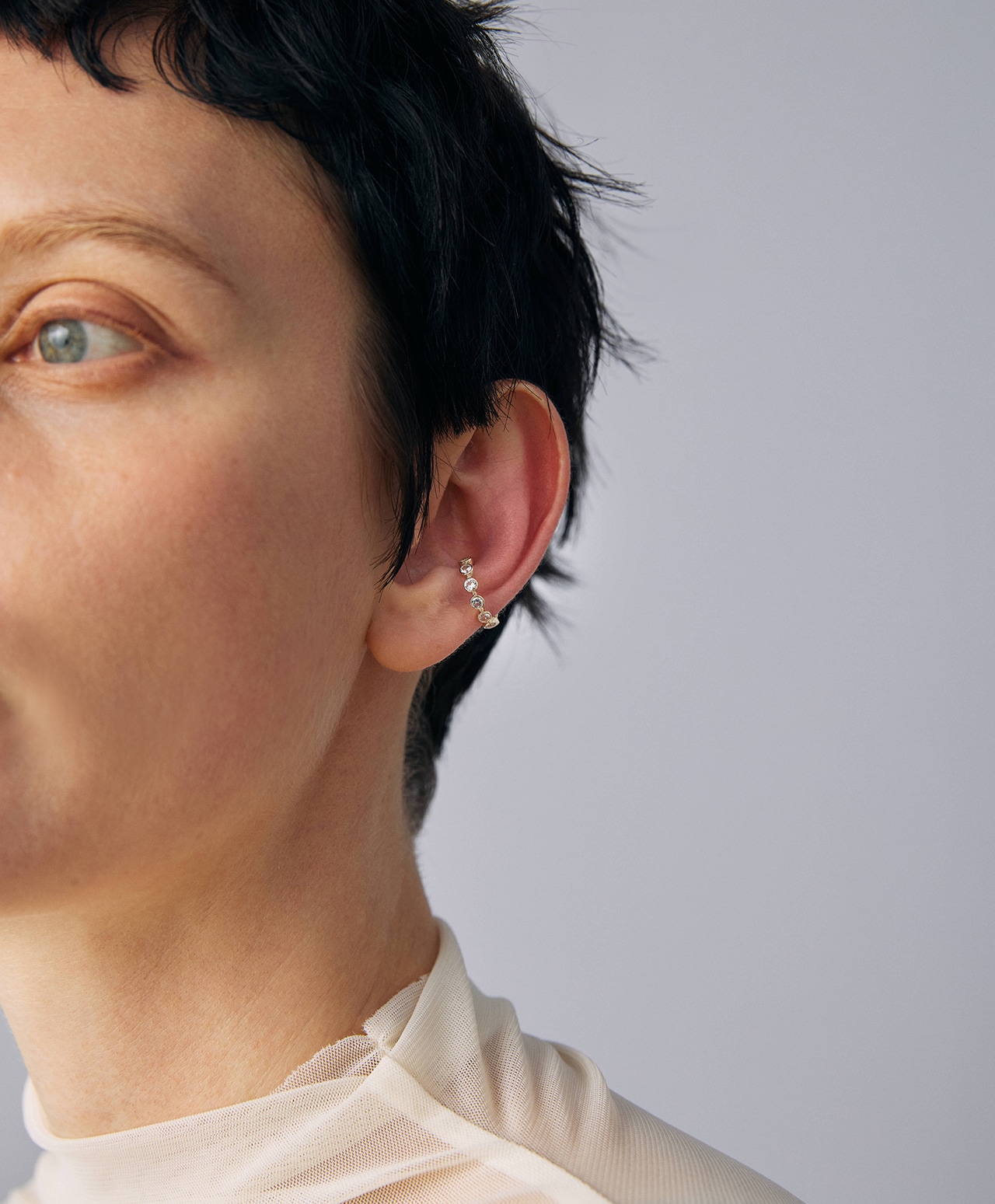 その強い光の一粒一粒をぜいたくに用いて、豪華なイヤーカフに。光でできた王冠のような丸い石座が円環を生み出し、そこにはフェナカイトの強い浄化のエネルギーが満たされているかのようです。