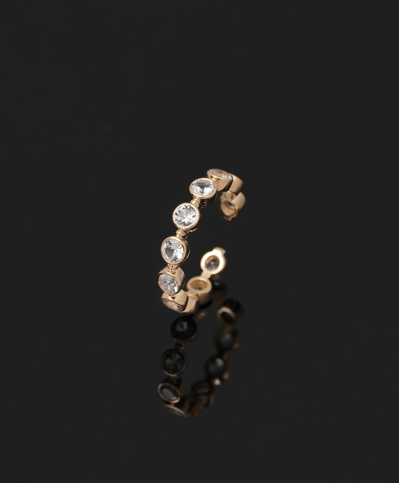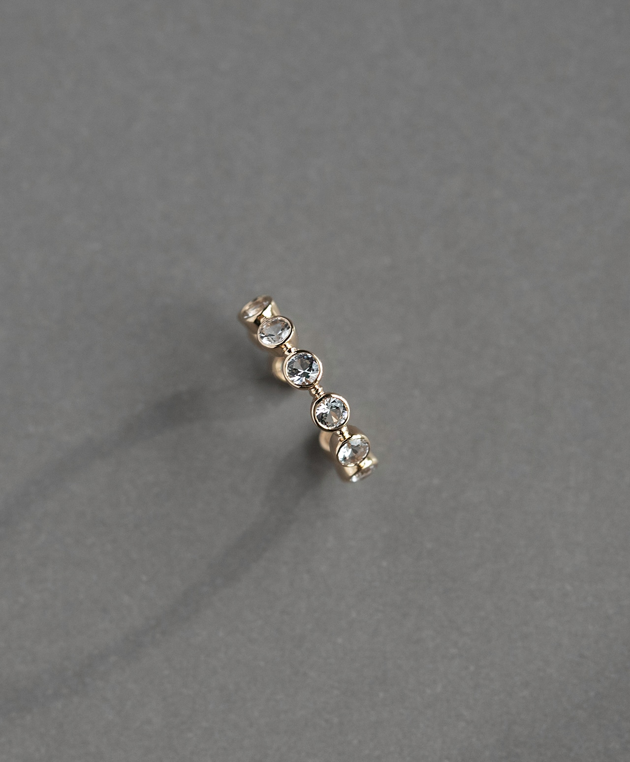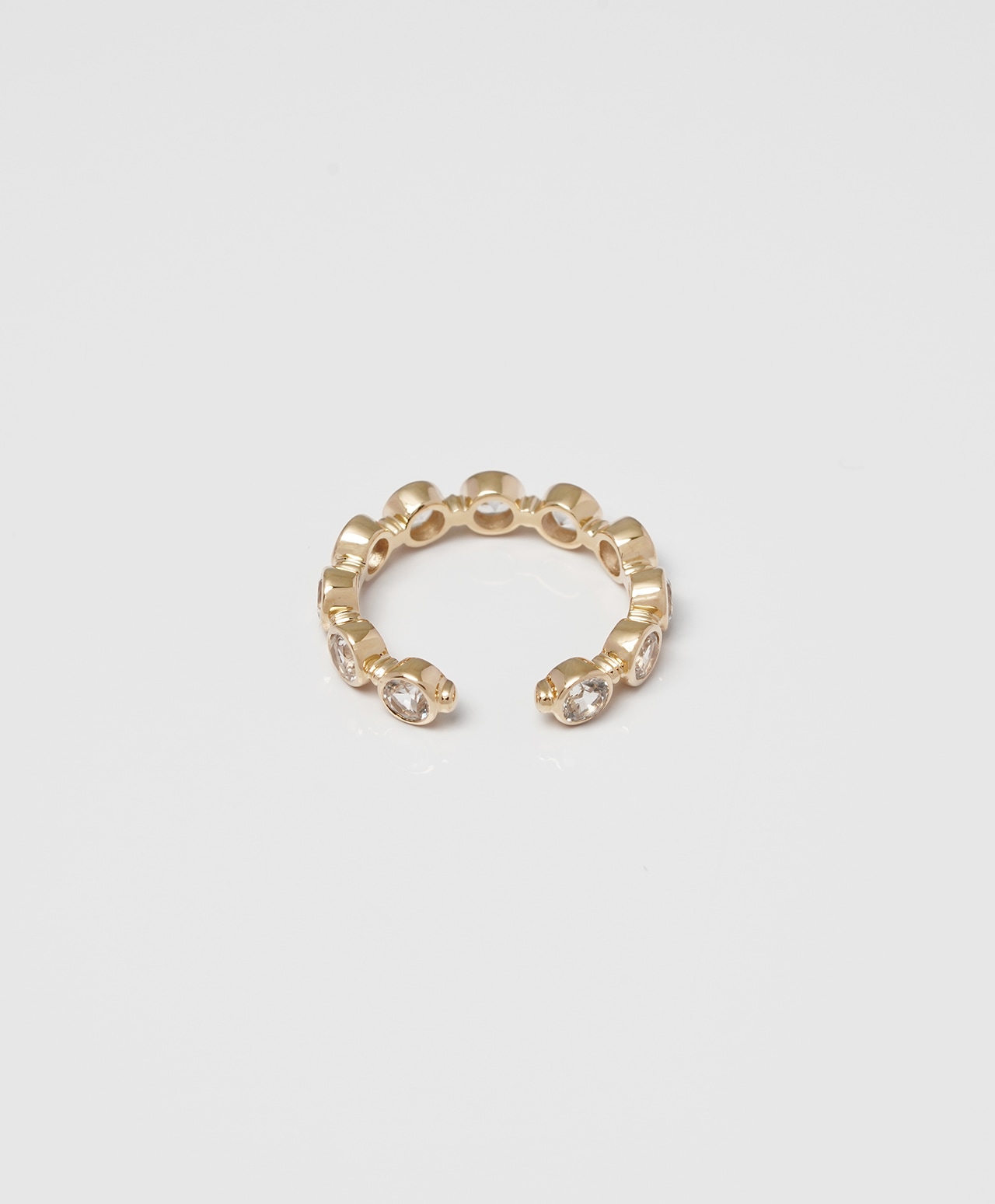その強い光の一粒一粒をぜいたくに用いて、豪華なイヤーカフに。光でできた王冠のような丸い石座が円環を生み出し、そこにはフェナカイトの強い浄化のエネルギーが満たされているかのようです。