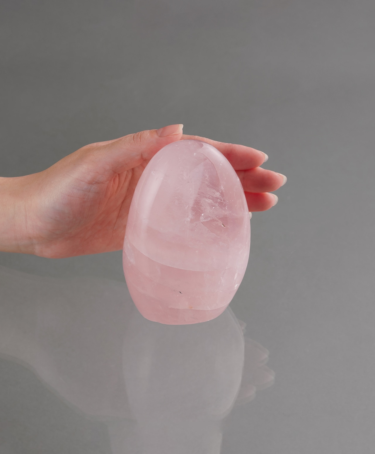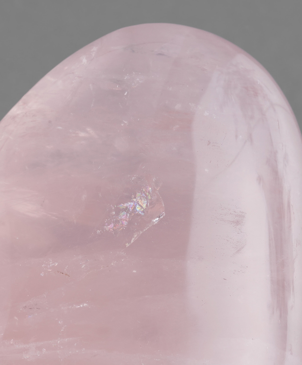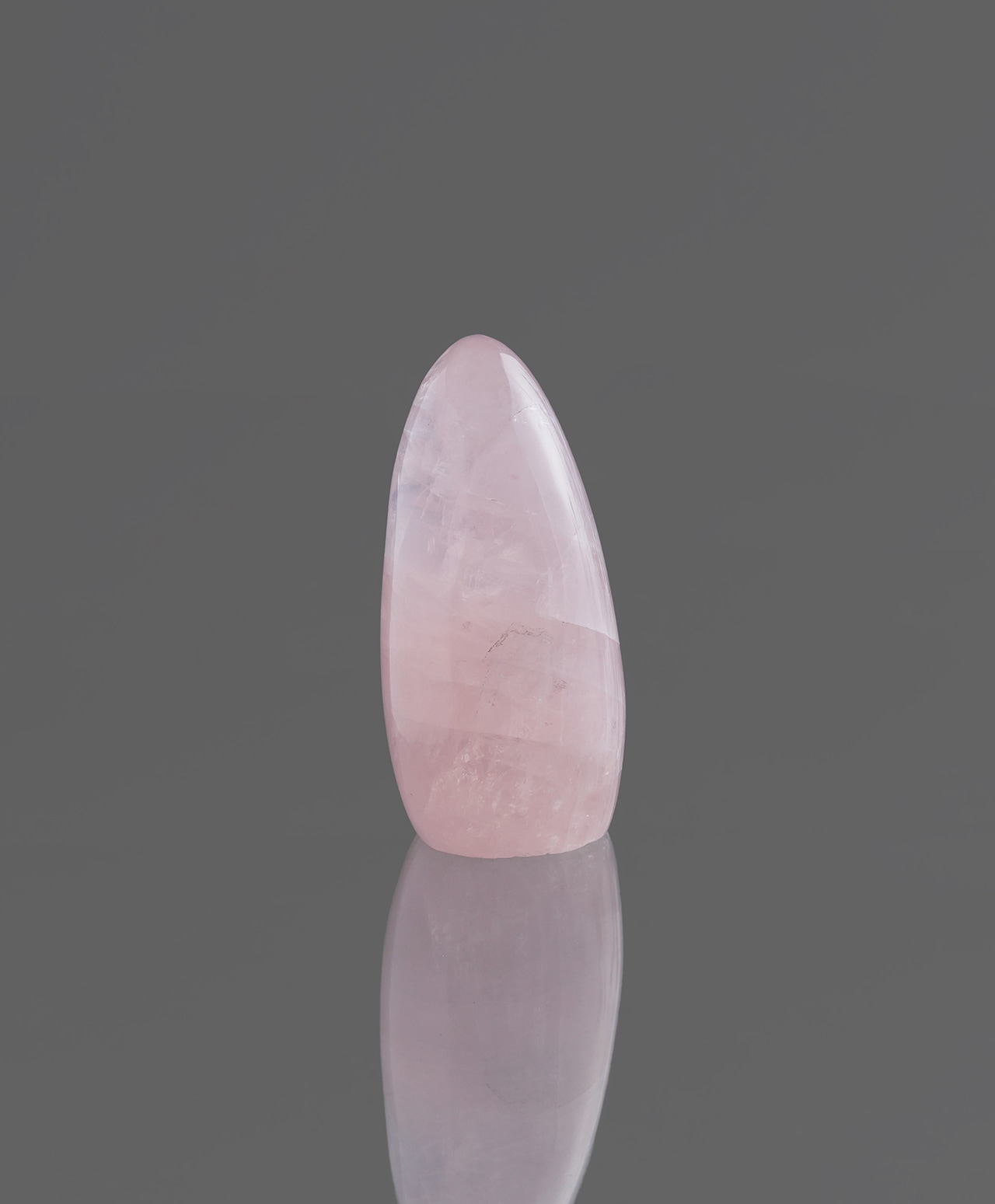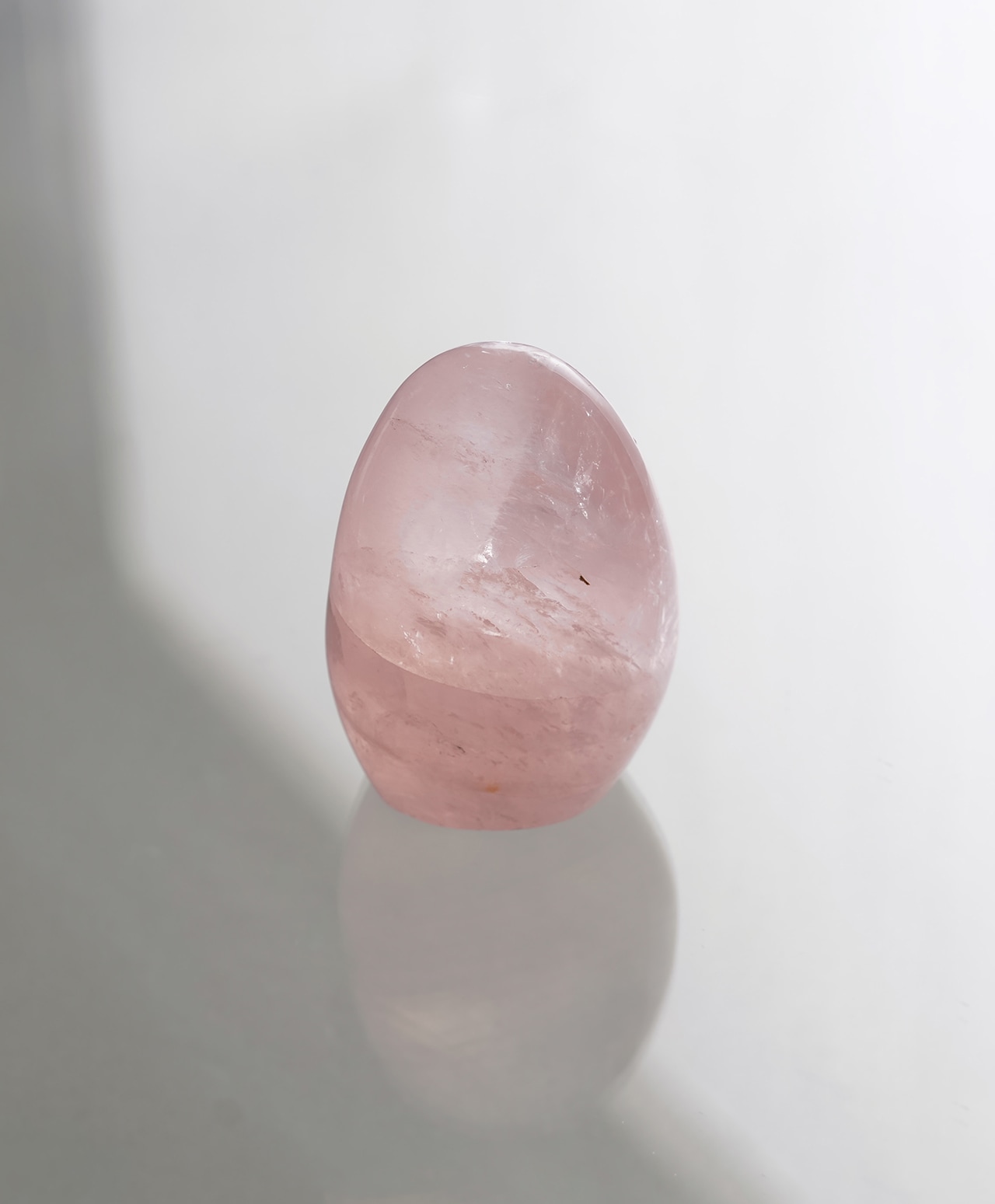 思わず手で撫でたくなるような、優しい曲線を描くローズクォーツ。ピンク色の濃淡や透け感が美しく、白色の内包物が石の中にレイヤーを作り、まるでモダニズムの絵画を見るようです。