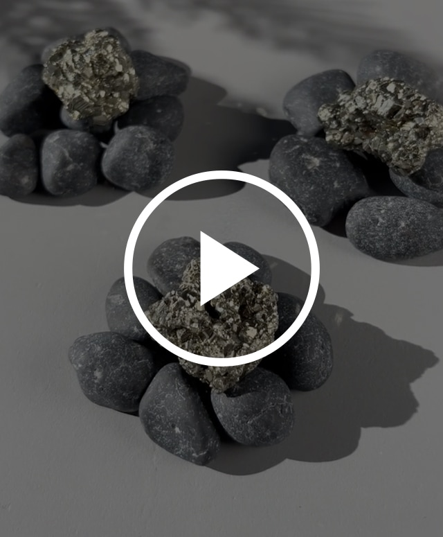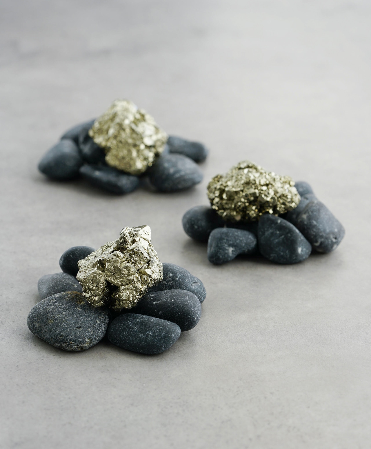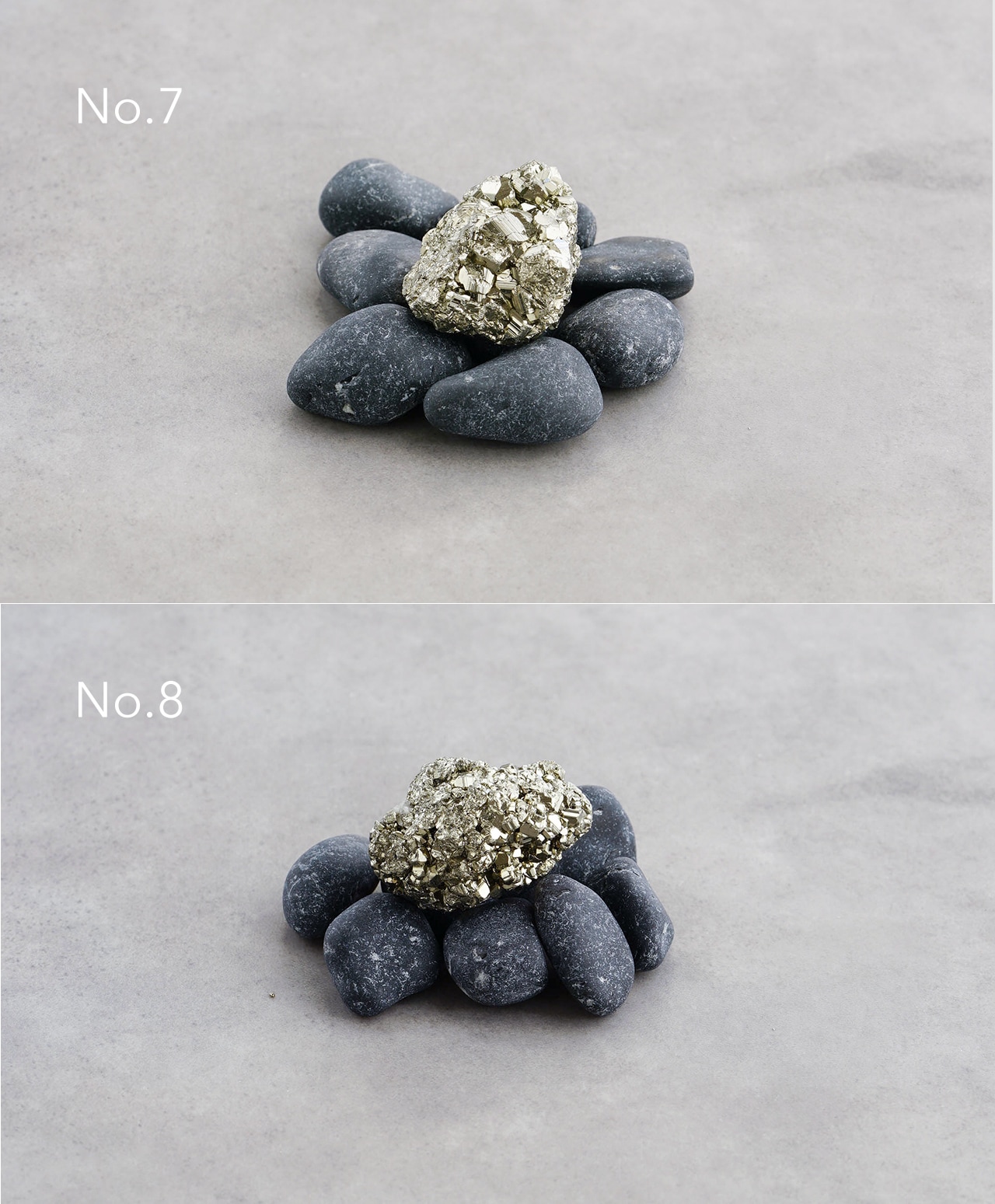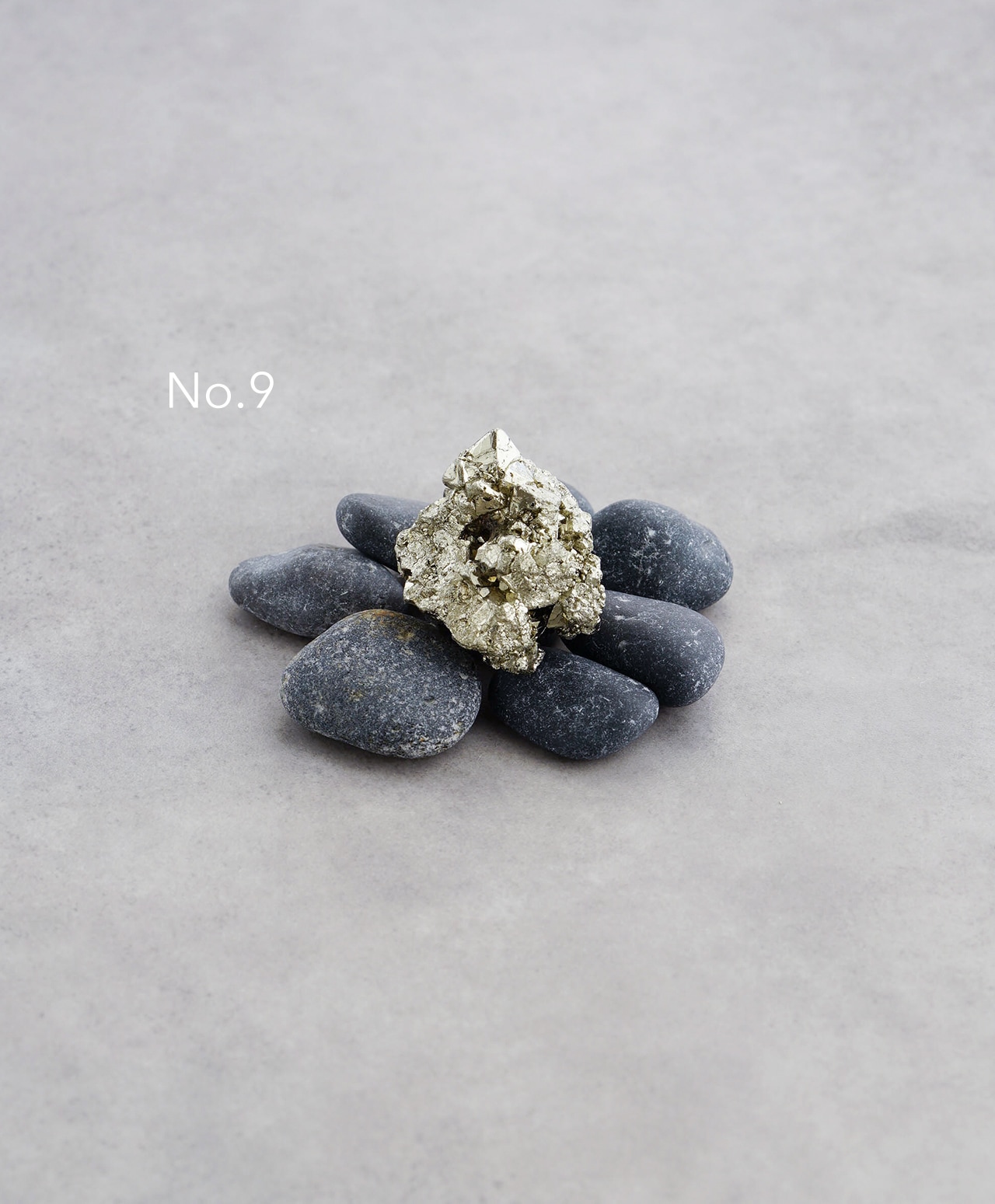 その上に配したのは、シャイニーなペルー産のパイライト。炎を思わせる造形と、光をうけて放つ艶やな黄金の輝きを湛えています。